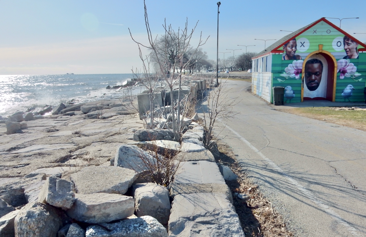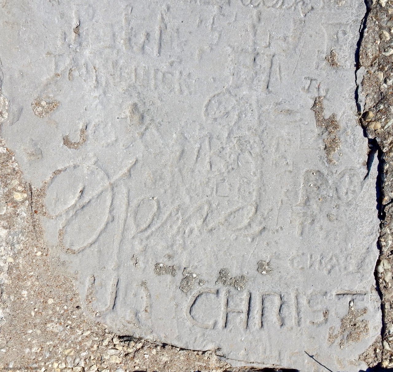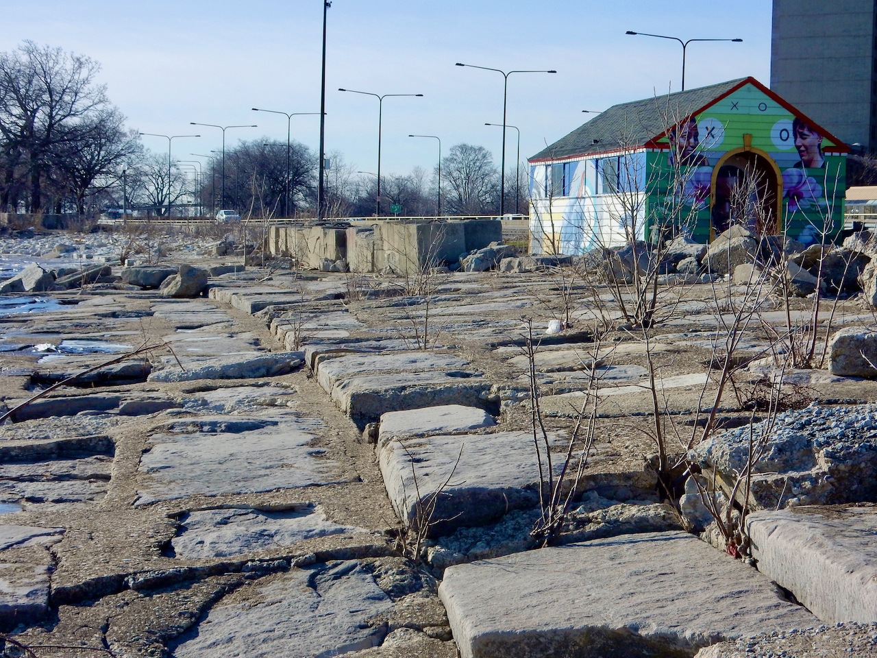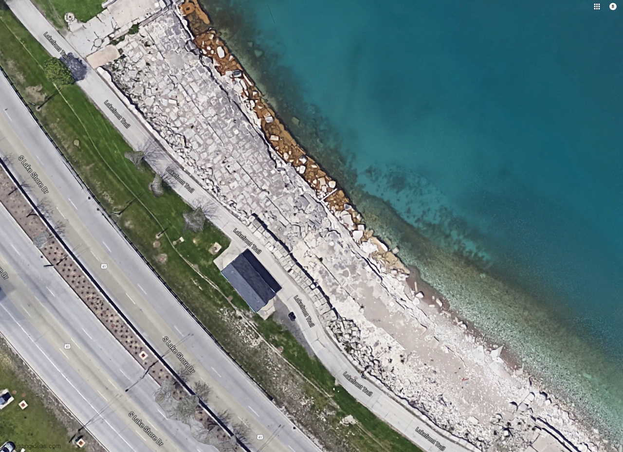 The area between the 49th Street Beach House and the lake is unique among surviving lakefront limestone structures in that the blocks were embedded to make a much more shallow path to the water than usual. Many of these blocks were carved with multiple names, creating a collective autograph collection that dates back to 1931. The final image, an aerial view, shows the relative integrity of this set of blocks from the Beach House going to the north.