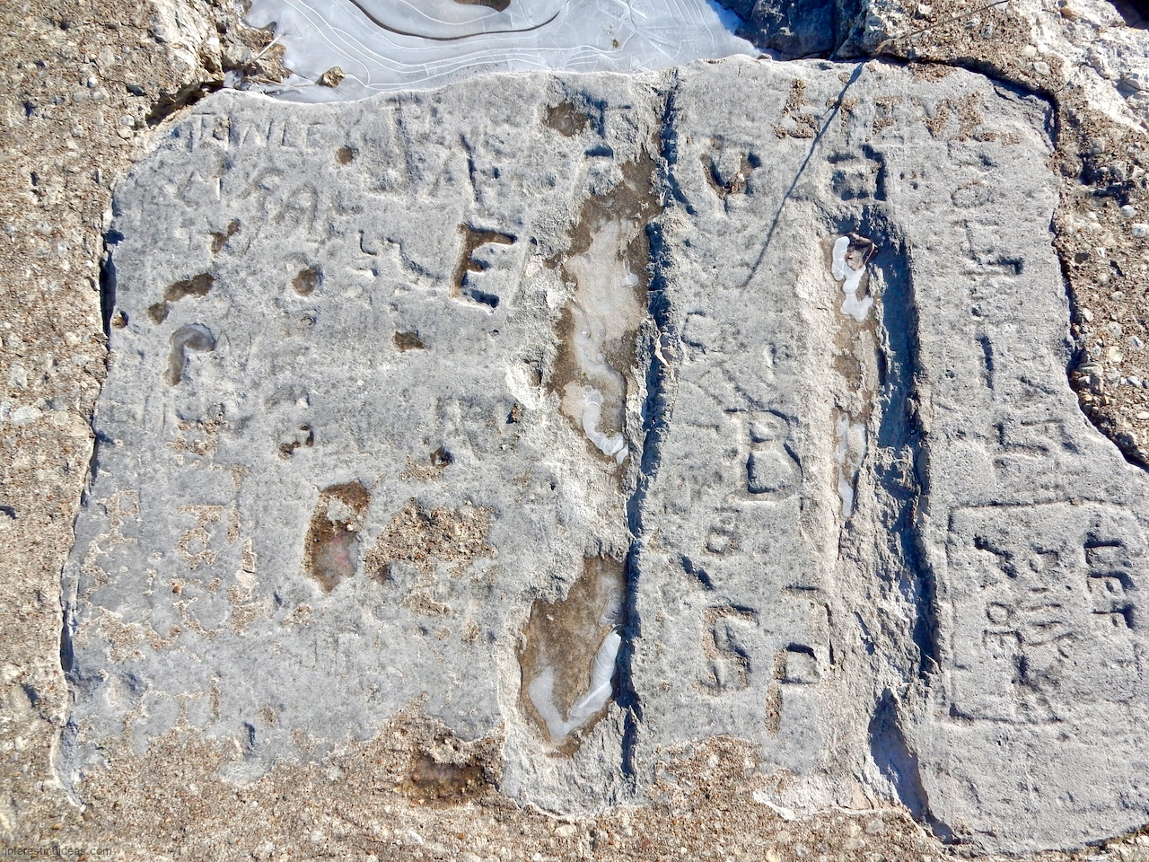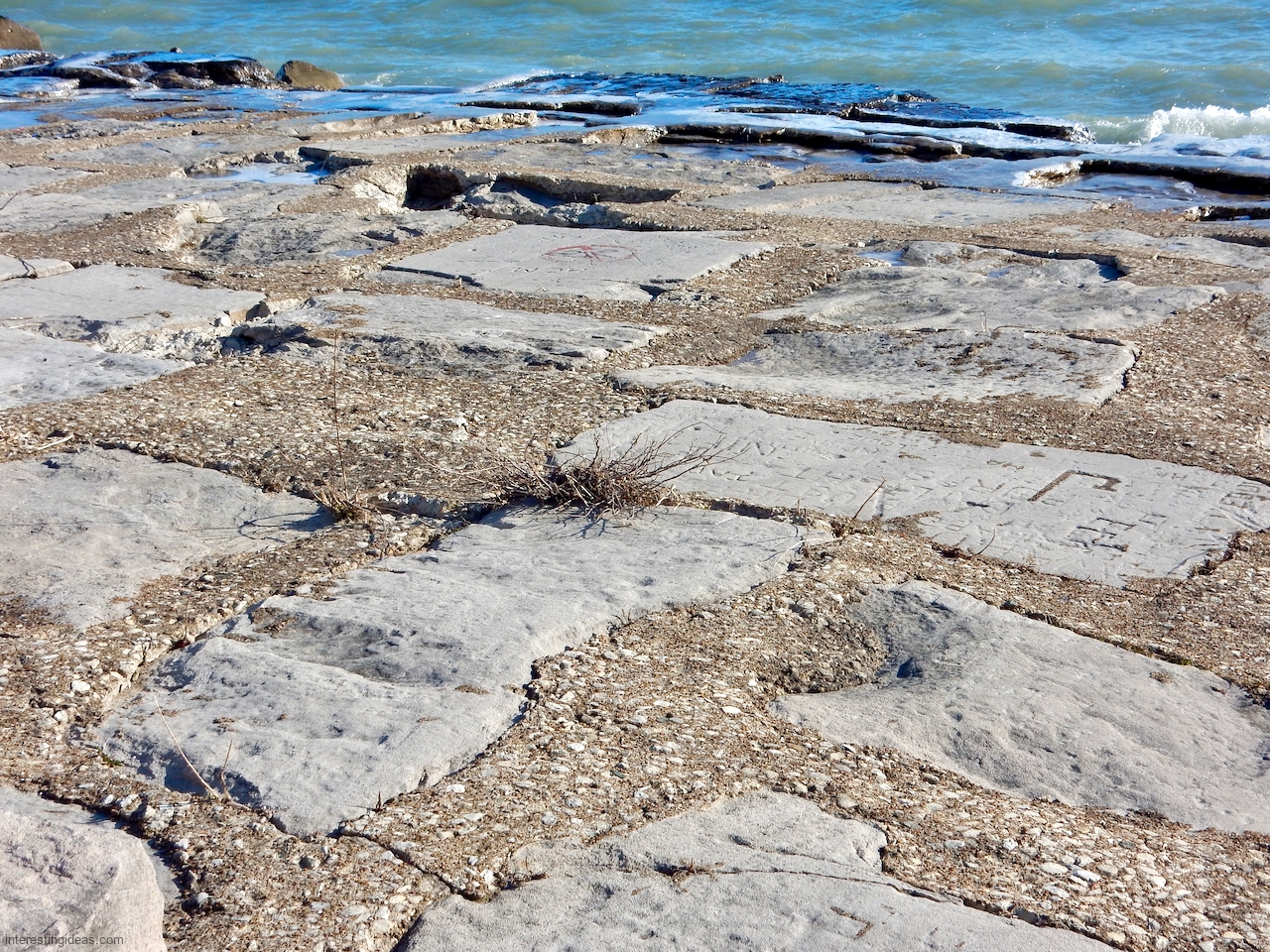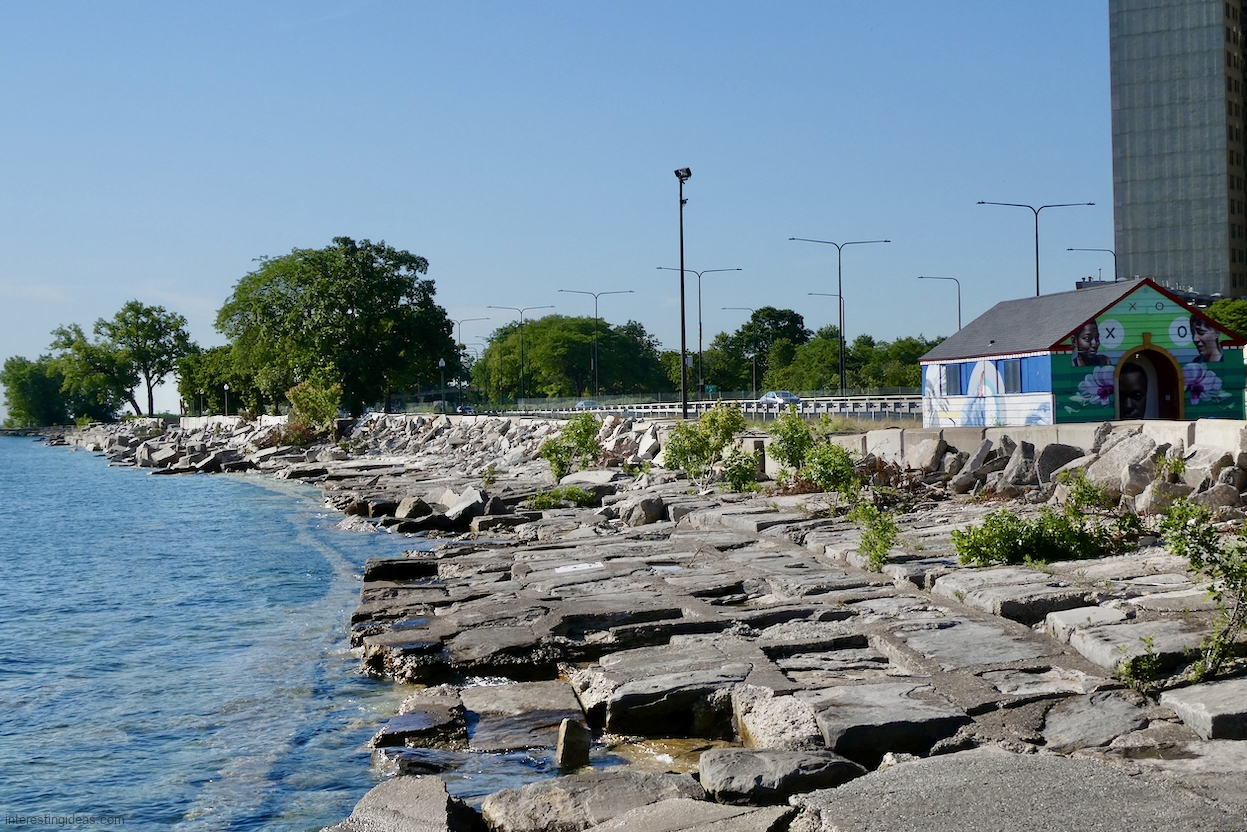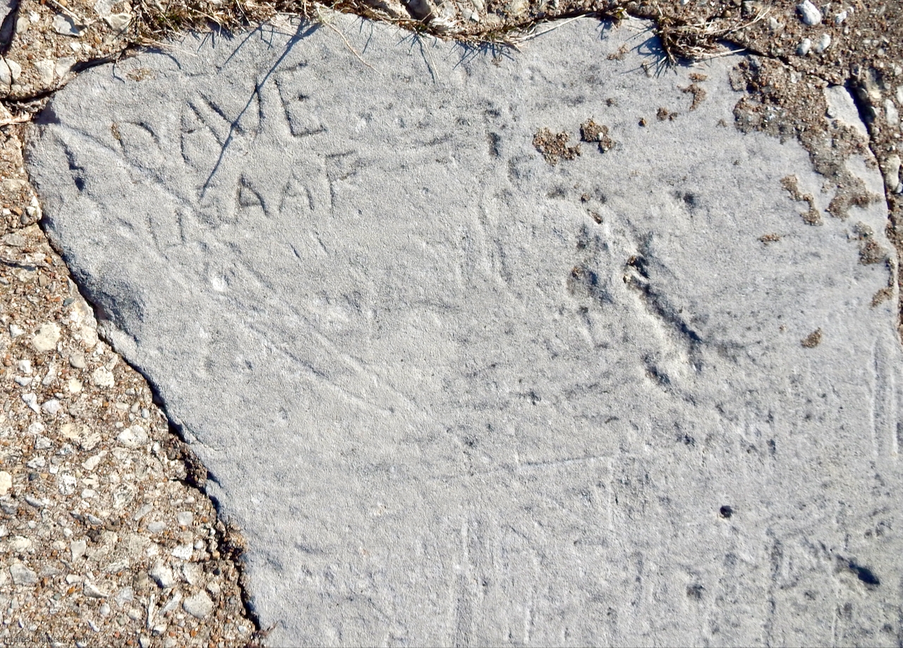 The area between the 49th Street Beach House and the lake is unique among surviving lakefront limestone structures in that the blocks were embedded to make a much more shallow path to the water than usual. Many of these blocks were carved with multiple names, creating a collective autograph collection that dates back to 1931. The final image, an aerial view, shows the relative integrity of this set of blocks from the Beach House going to the north.