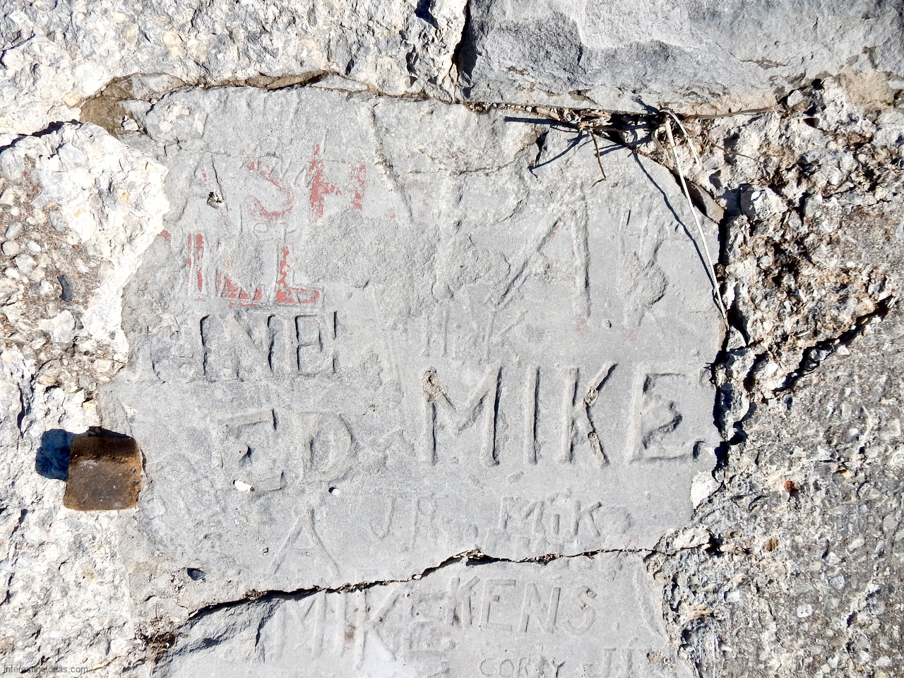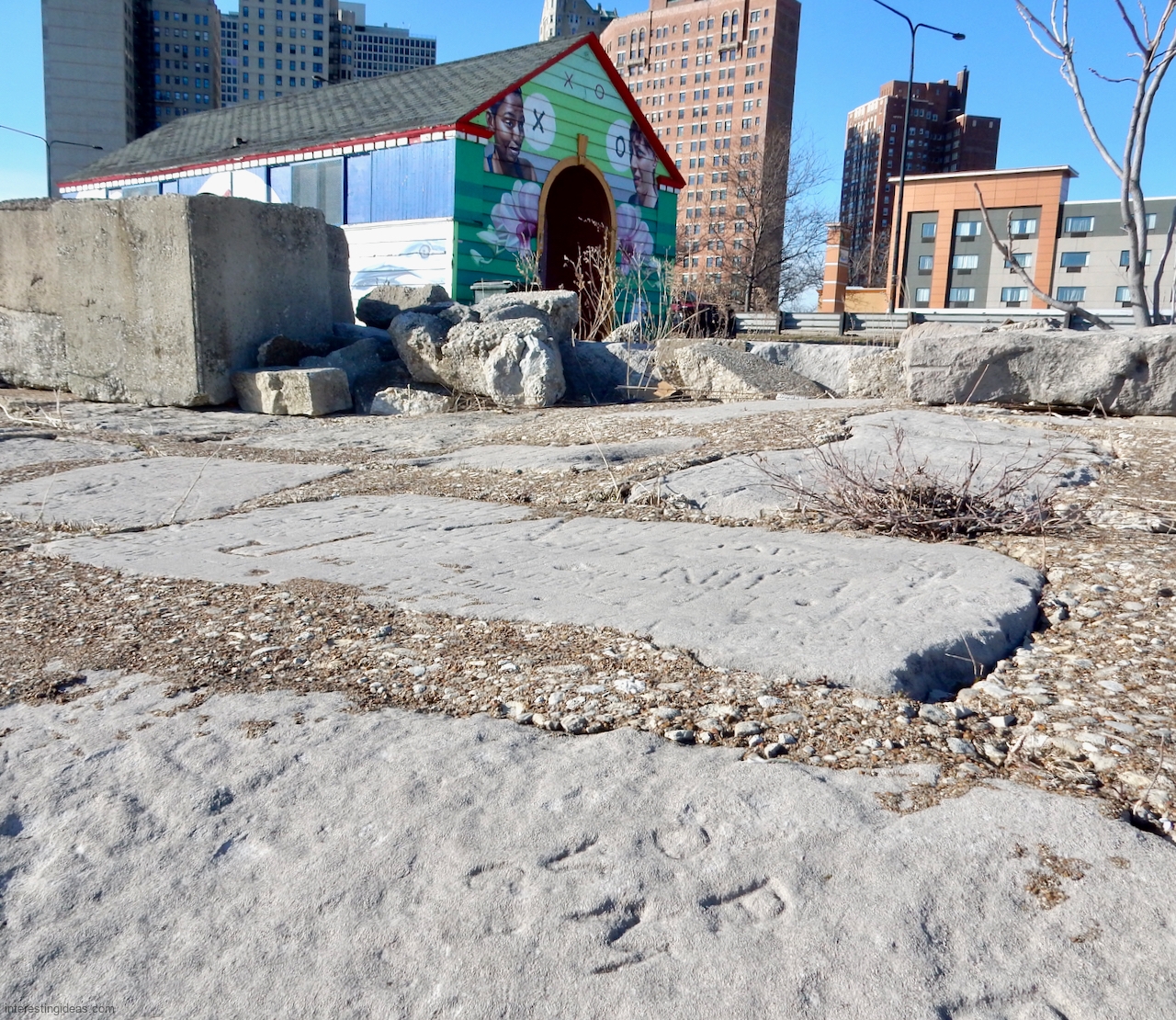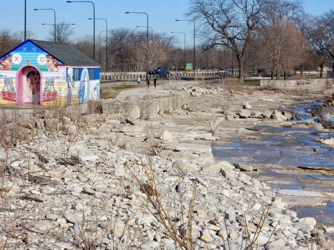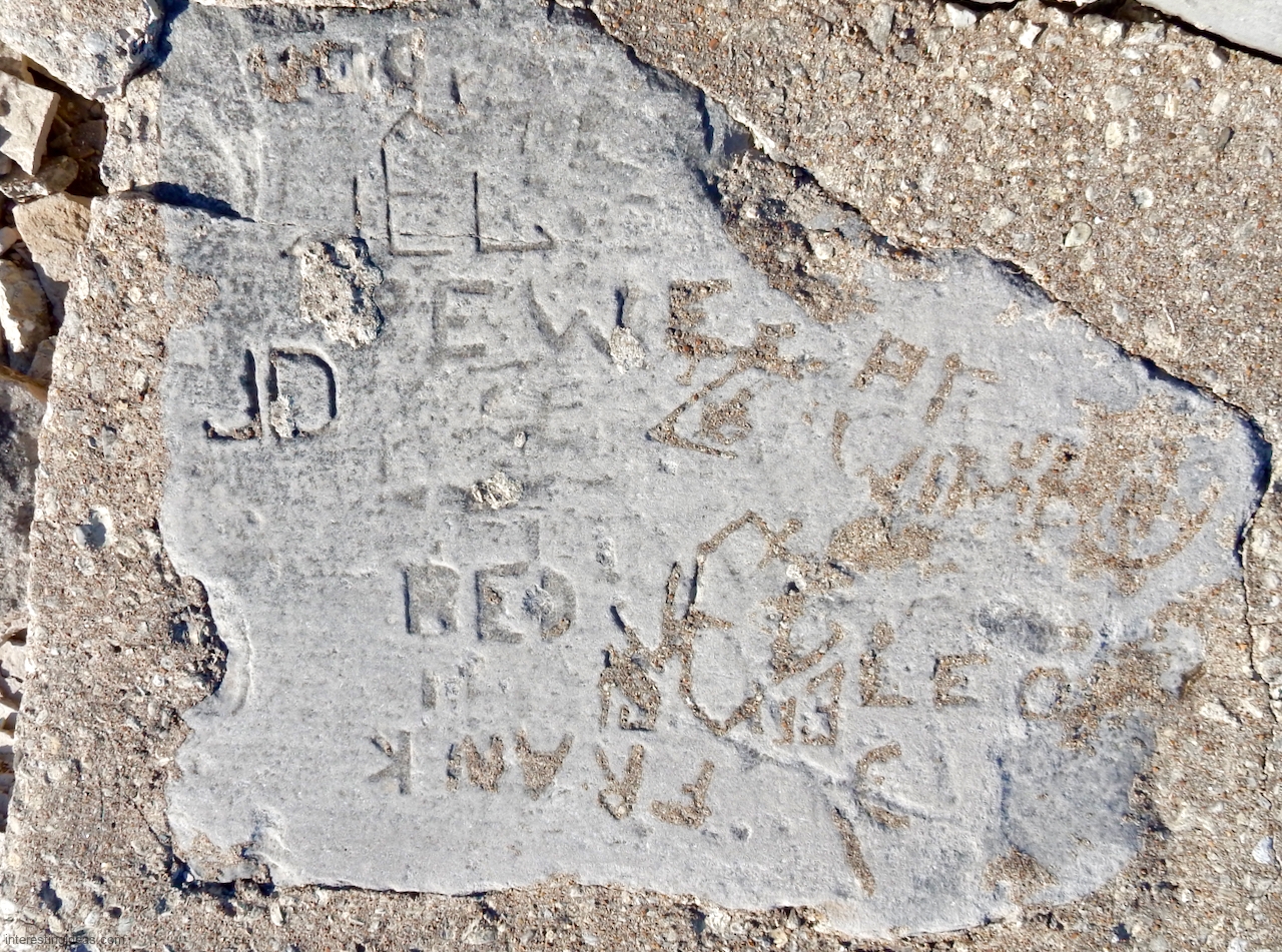 The area between the 49th Street Beach House and the lake is unique among surviving lakefront limestone structures in that the blocks were embedded to make a much more shallow path to the water than usual. Many of these blocks were carved with multiple names, creating a collective autograph collection that dates back to 1931. The final image, an aerial view, shows the relative integrity of this set of blocks from the Beach House going to the north.