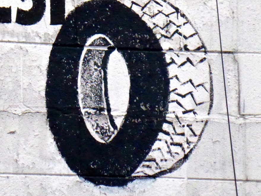 Like mufflers, tires have a special place in the universe of automotive signage. Painted tire art can be found in many locations, and actual tires, like actual mufflers, can serve very effectively to advertise a service. Personally, I love the simple tire-on-a-stick, though there is still much to like in every artist’s painted rendition of this ubiquitous form. Back to the Automotive Art Gallery index
