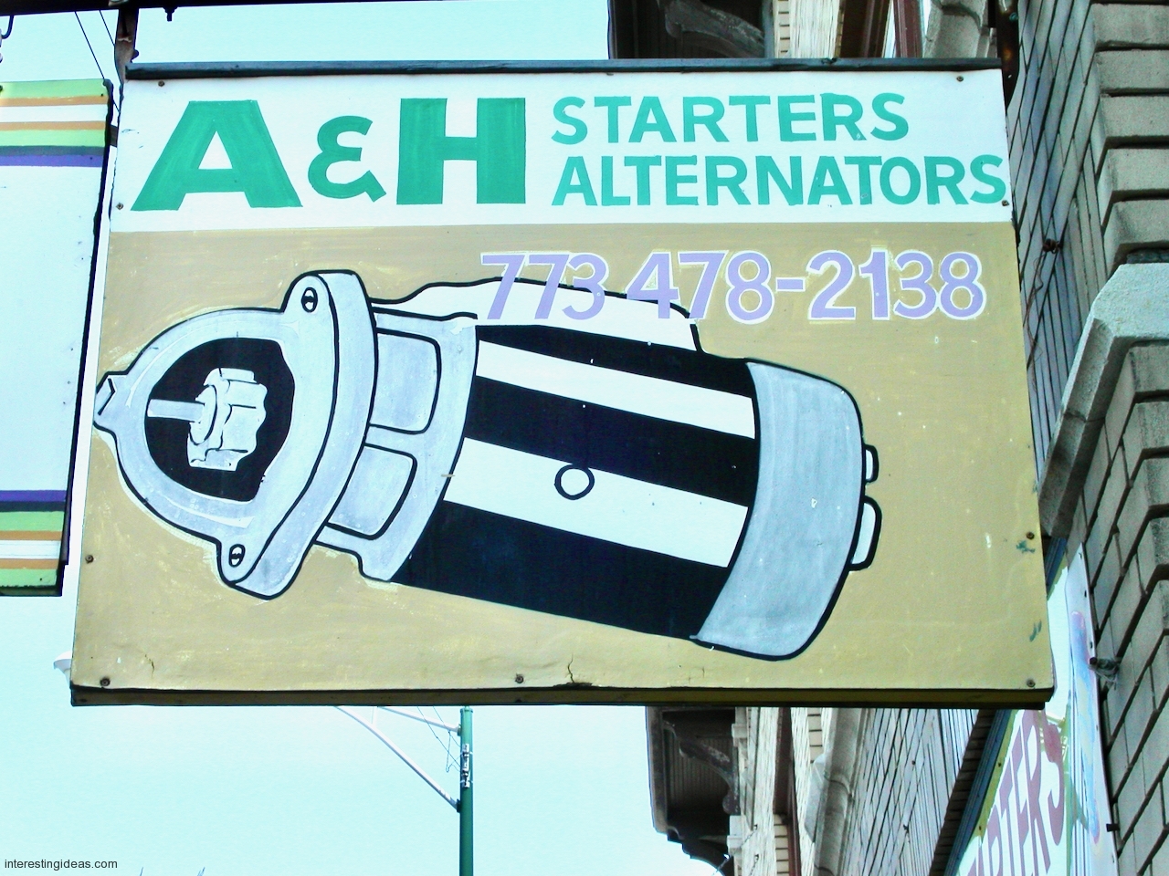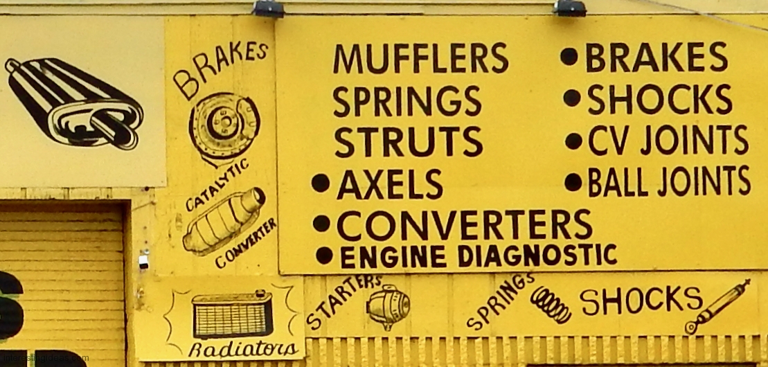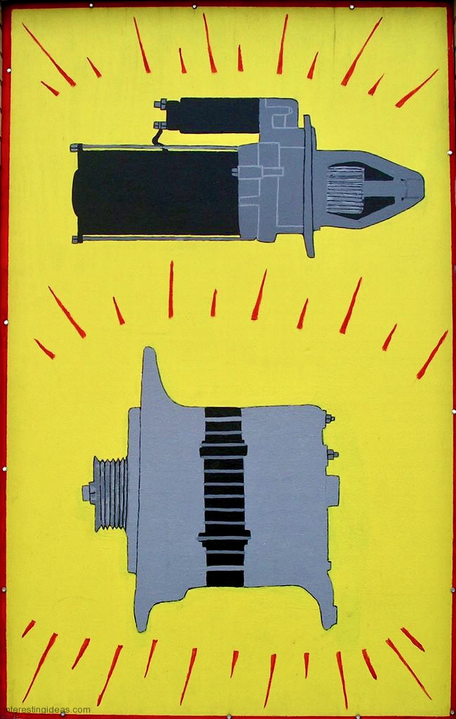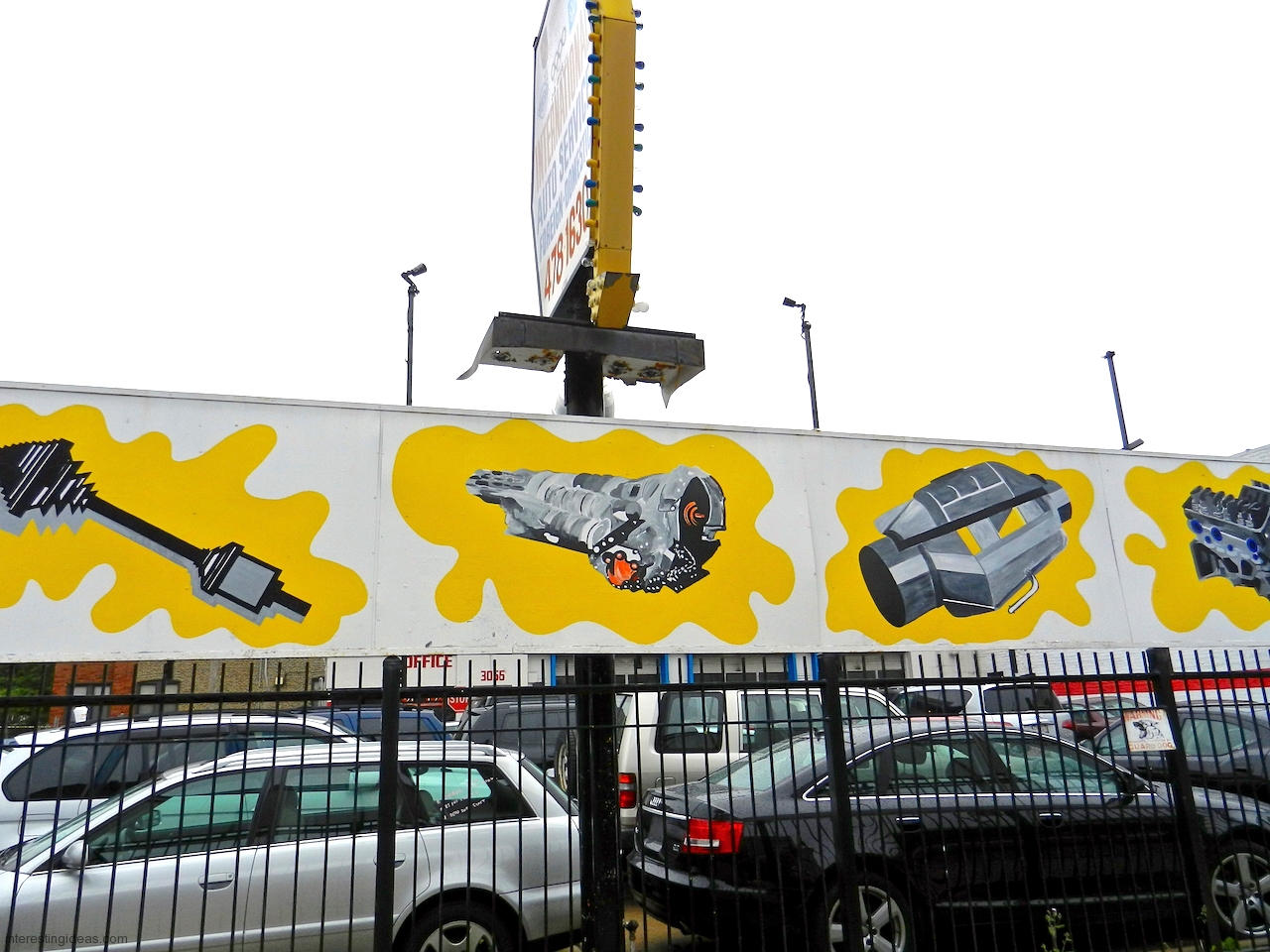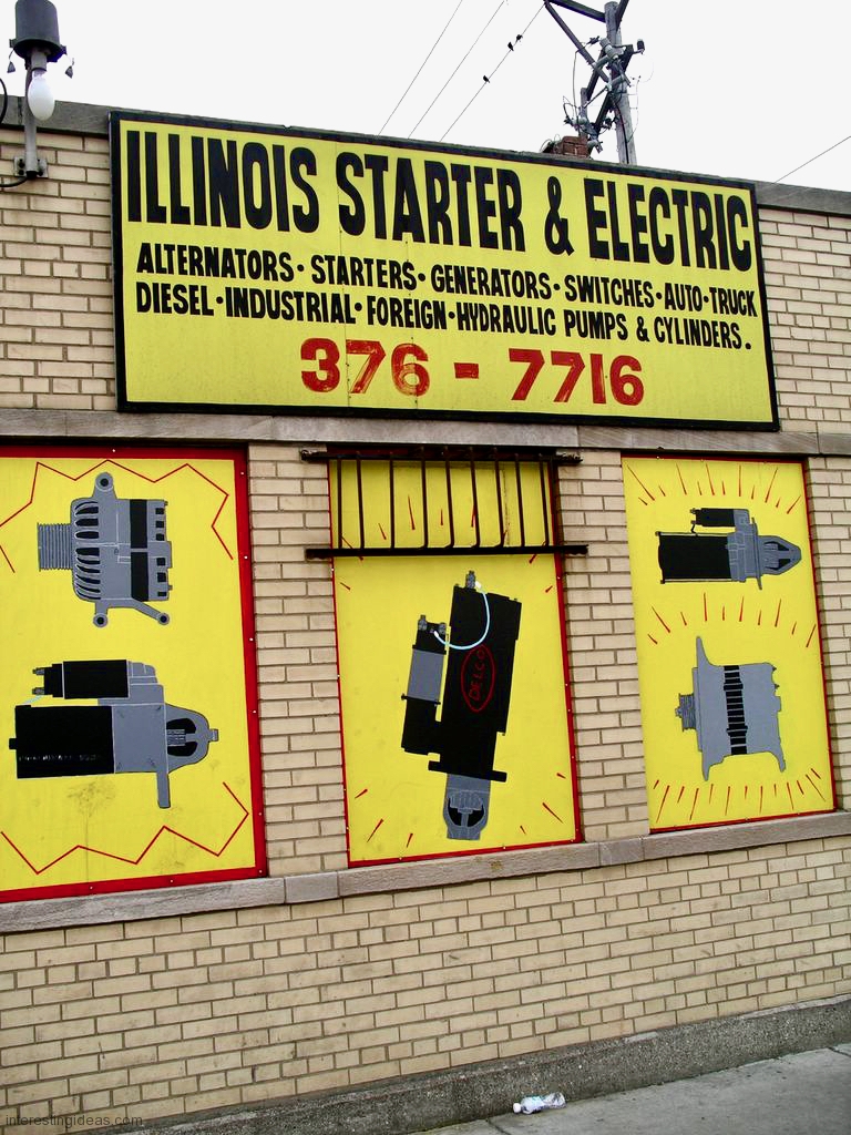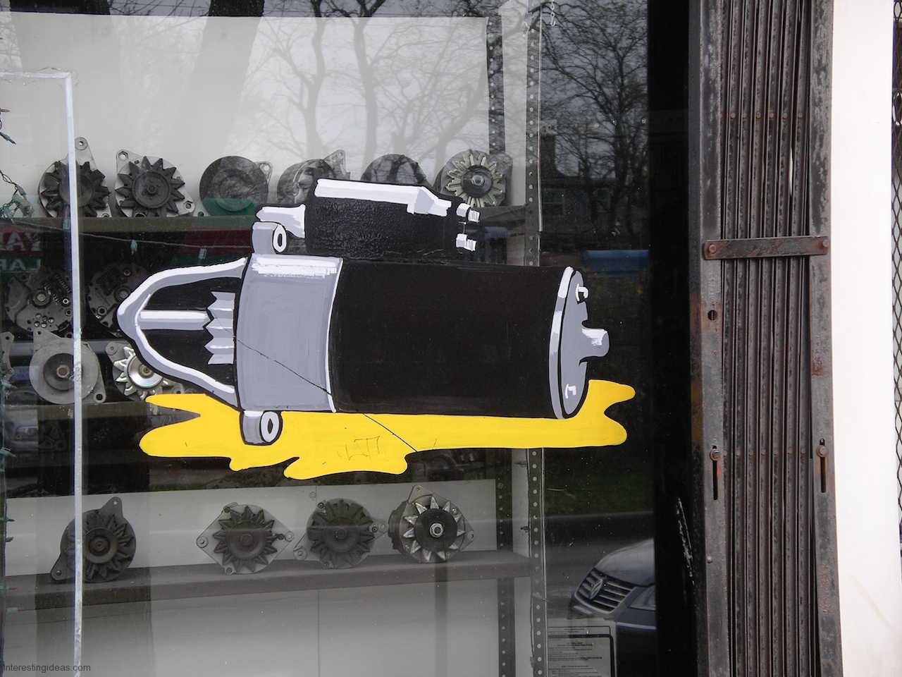 Most auto parts are about as prosaic as can be, but they are often made dynamic through the magic of roadside art. This gallery starts with a straightforward representation of a spark plug, picking up creative steam with the artist at International Auto Service, who wins for the bold use of color and shapes. The Illinois Starter artist went for simplification of the parts and highlighting technique. The puddle approach makes Akram Electric stand out while Rudy’s goes the more traditional cover-the-earth strategy.