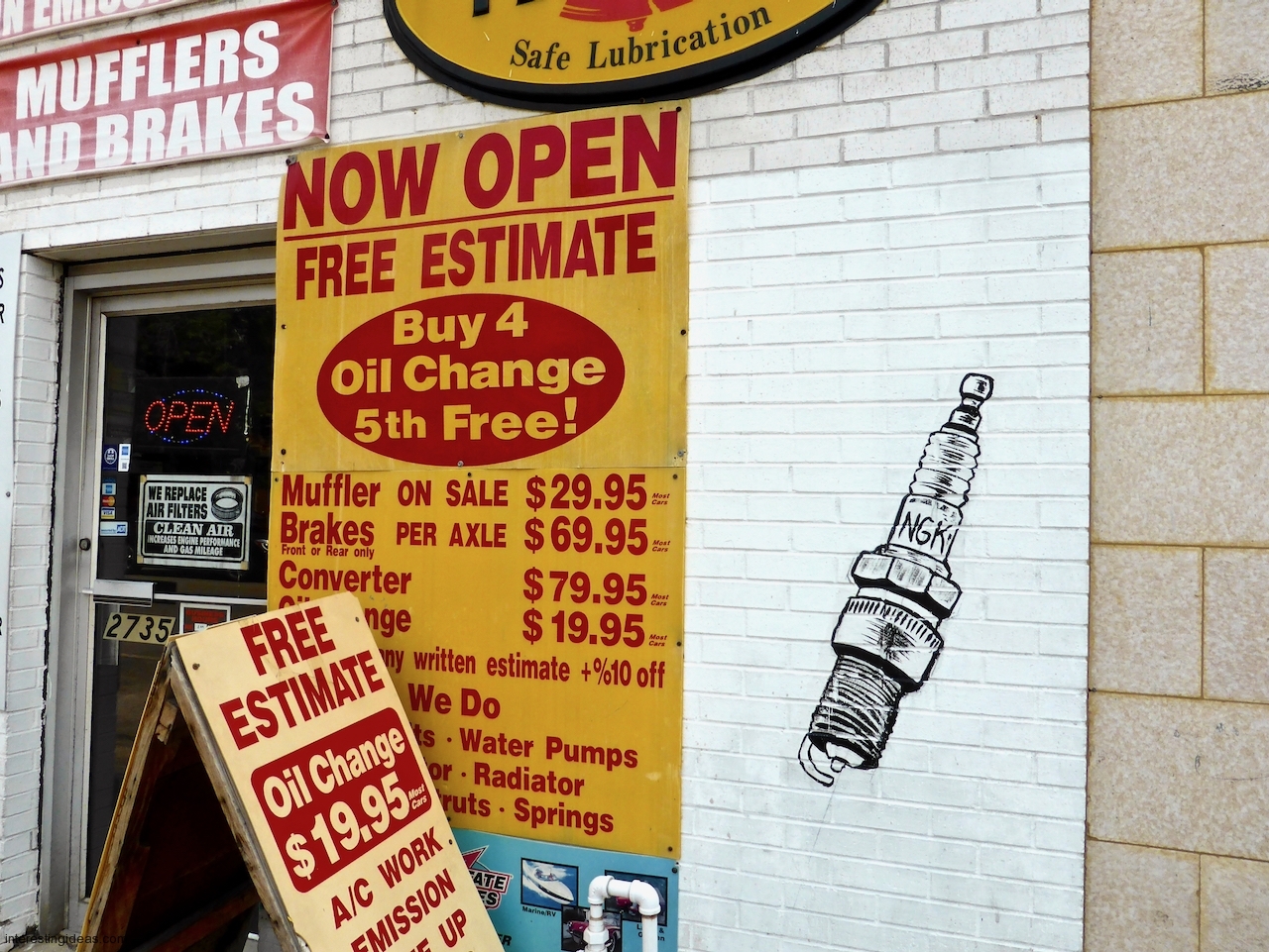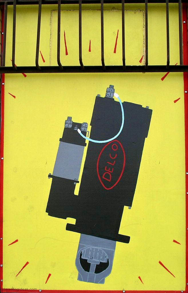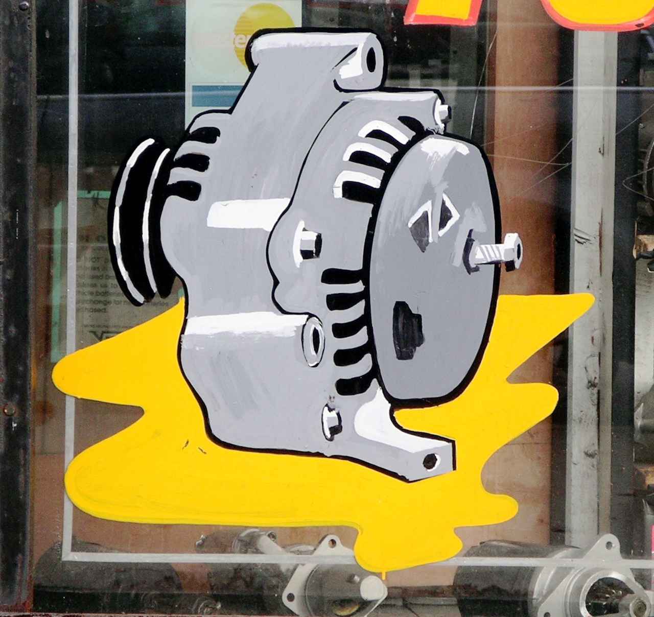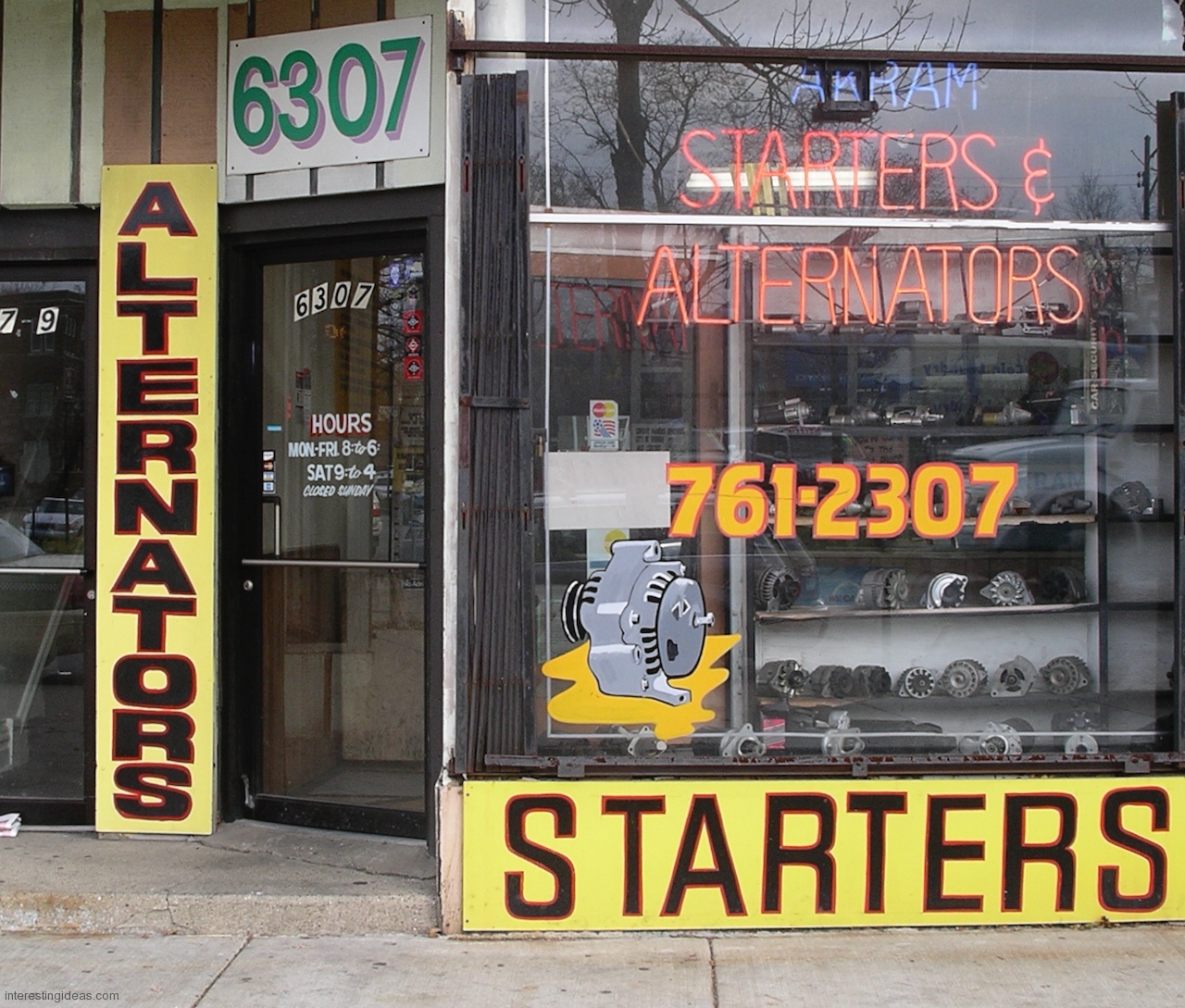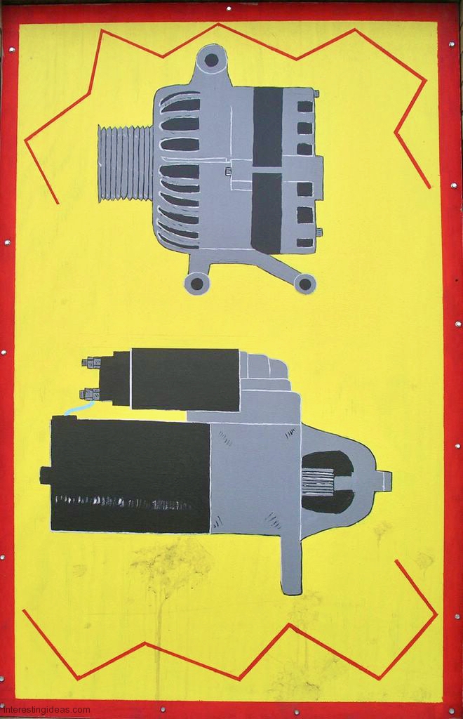 Most auto parts are about as prosaic as can be, but they are often made dynamic through the magic of roadside art. This gallery starts with a straightforward representation of a spark plug, picking up creative steam with the artist at International Auto Service, who wins for the bold use of color and shapes. The Illinois Starter artist went for simplification of the parts and highlighting technique. The puddle approach makes Akram Electric stand out while Rudy’s goes the more traditional cover-the-earth strategy.