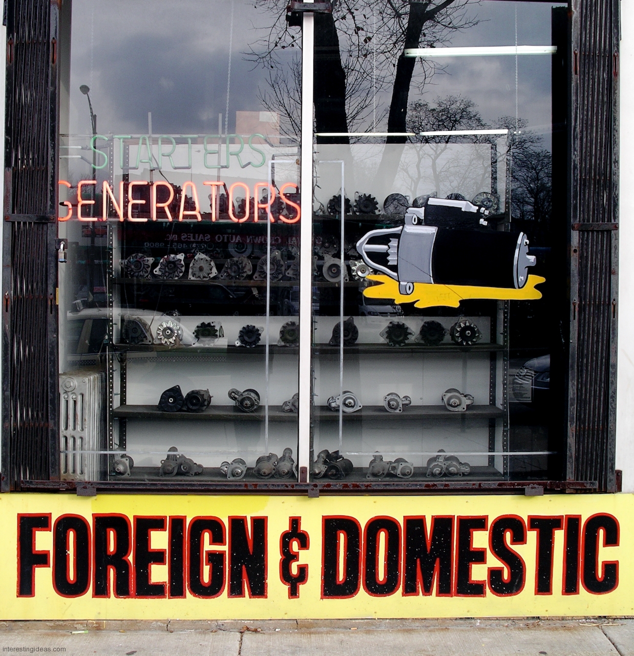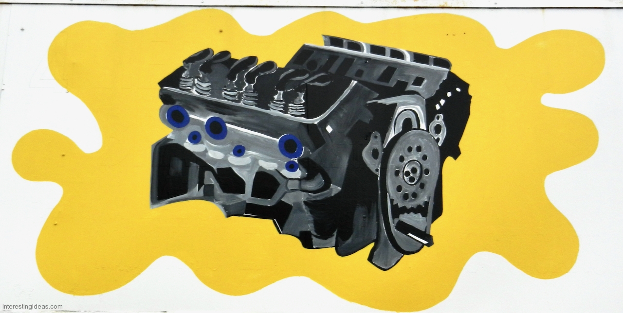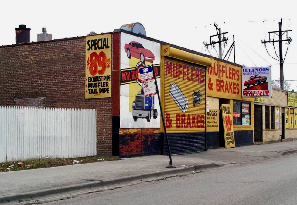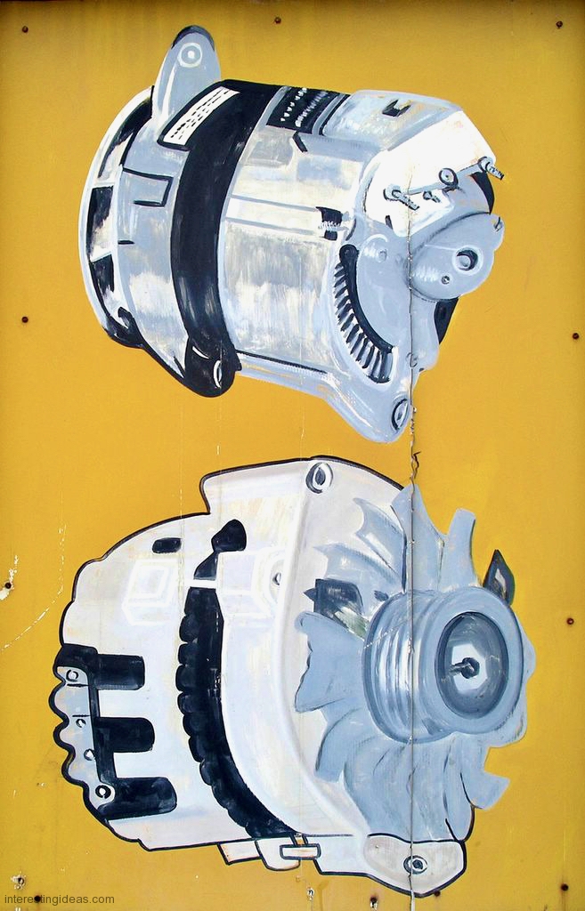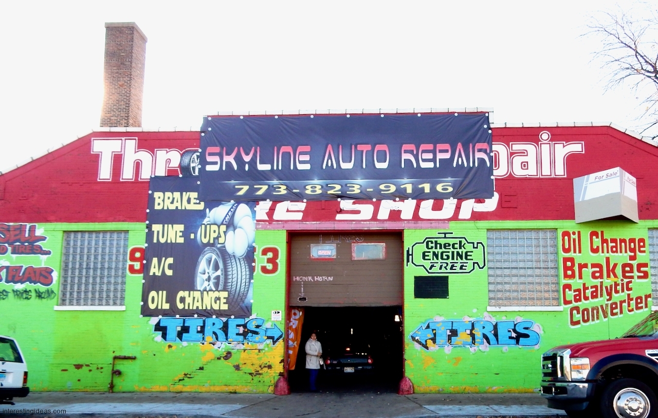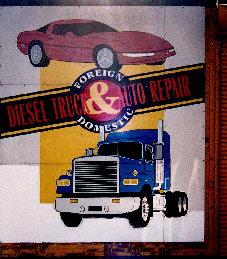 Most auto parts are about as prosaic as can be, but they are often made dynamic through the magic of roadside art. This gallery starts with a straightforward representation of a spark plug, picking up creative steam with the artist at International Auto Service, who wins for the bold use of color and shapes. The Illinois Starter artist went for simplification of the parts and highlighting technique. The puddle approach makes Akram Electric stand out while Rudy’s goes the more traditional cover-the-earth strategy.