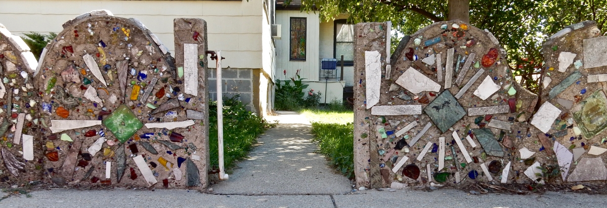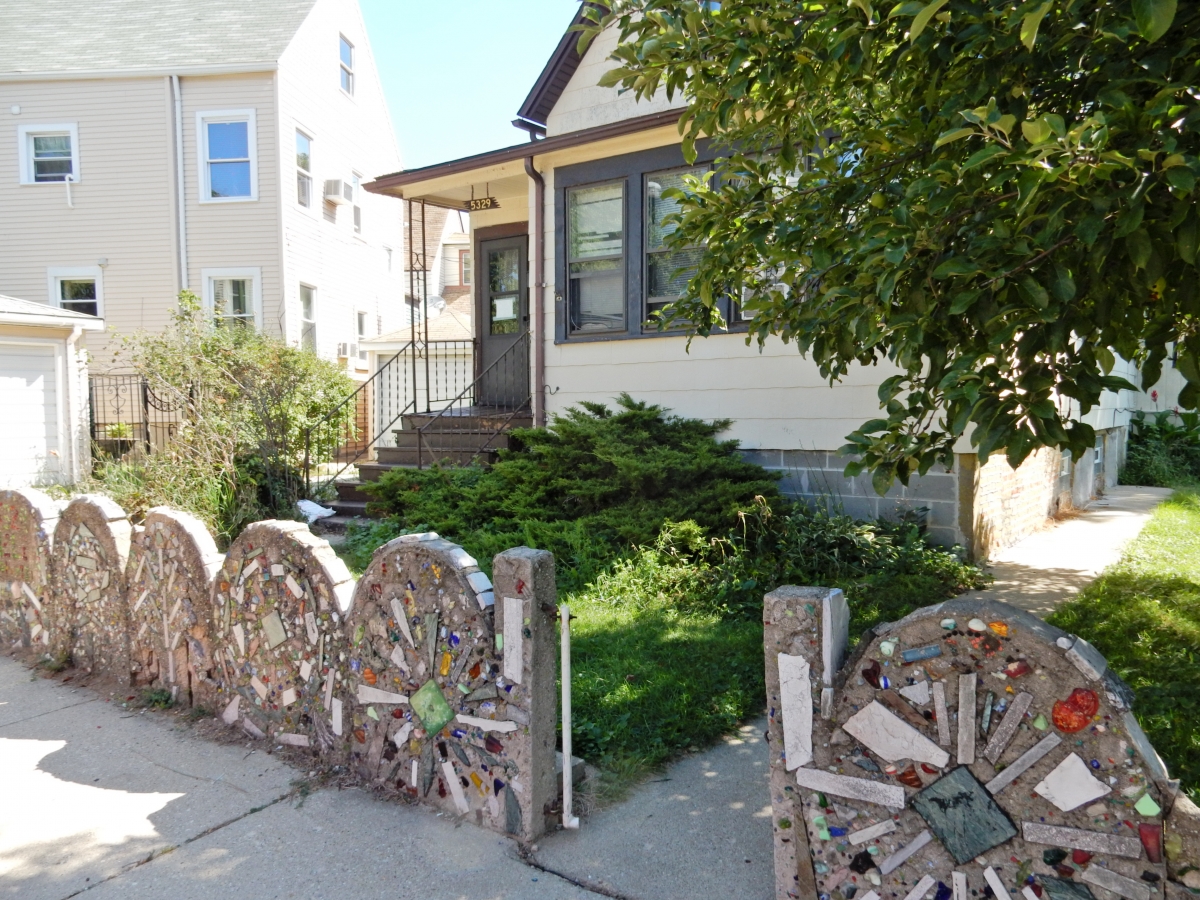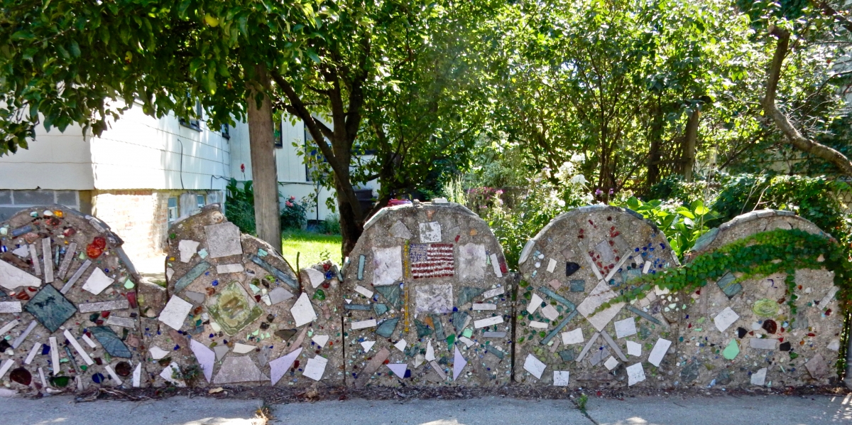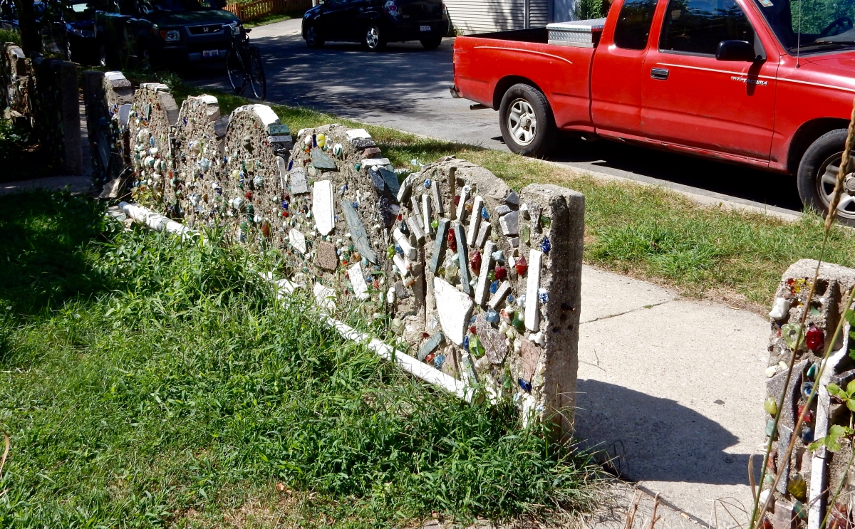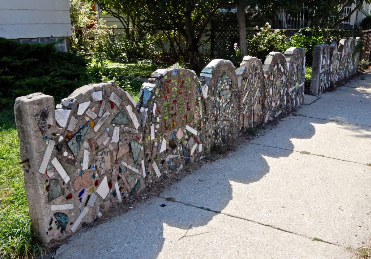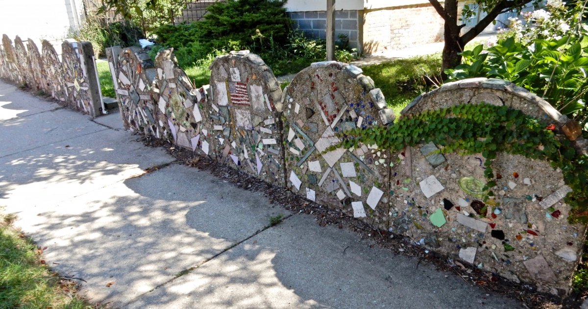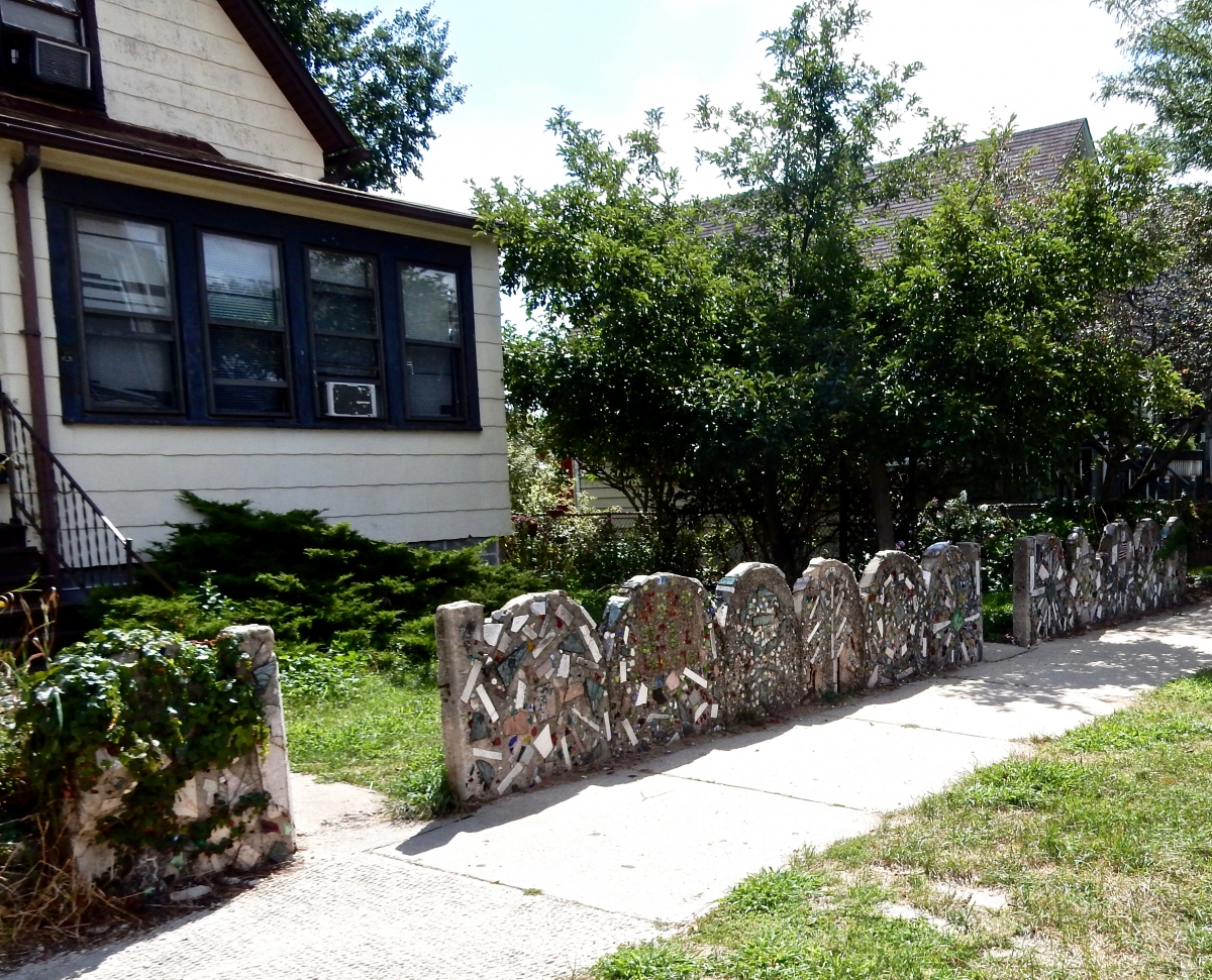This pique assiette folk-art fence in Chicago’s wonderful Bowmanville neighborhood appears to date to 1973. It fronts a nondescript house on a nondescript, low-traffic street. Very few people driving by on the nearest thoroughfare are likely to recognize that they just passed an important folk-art site.