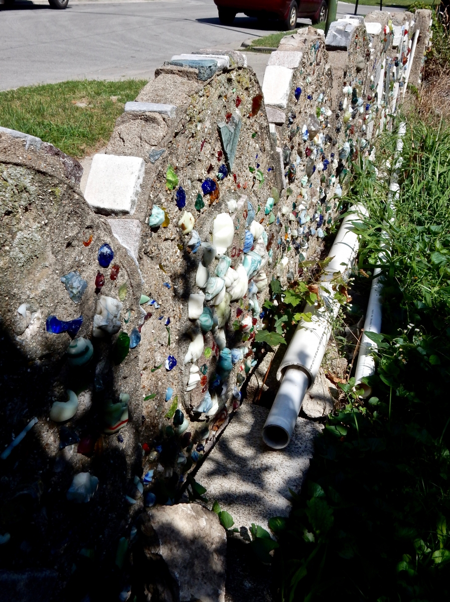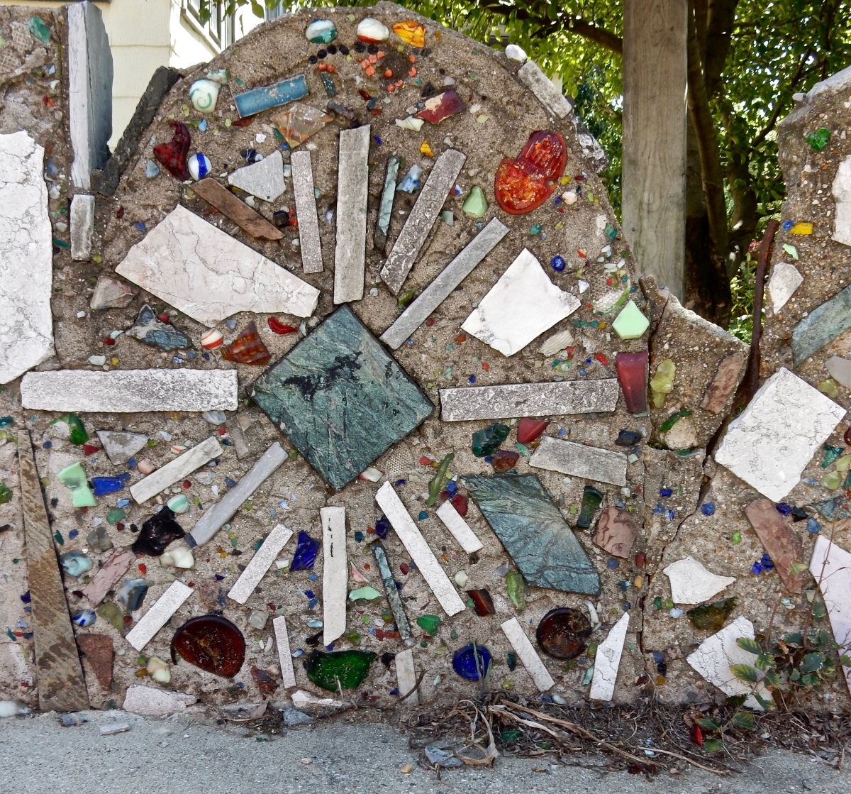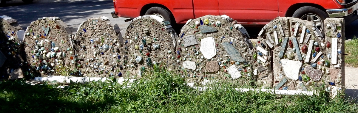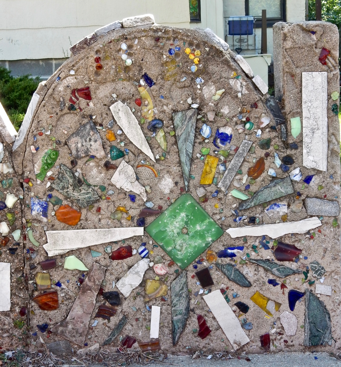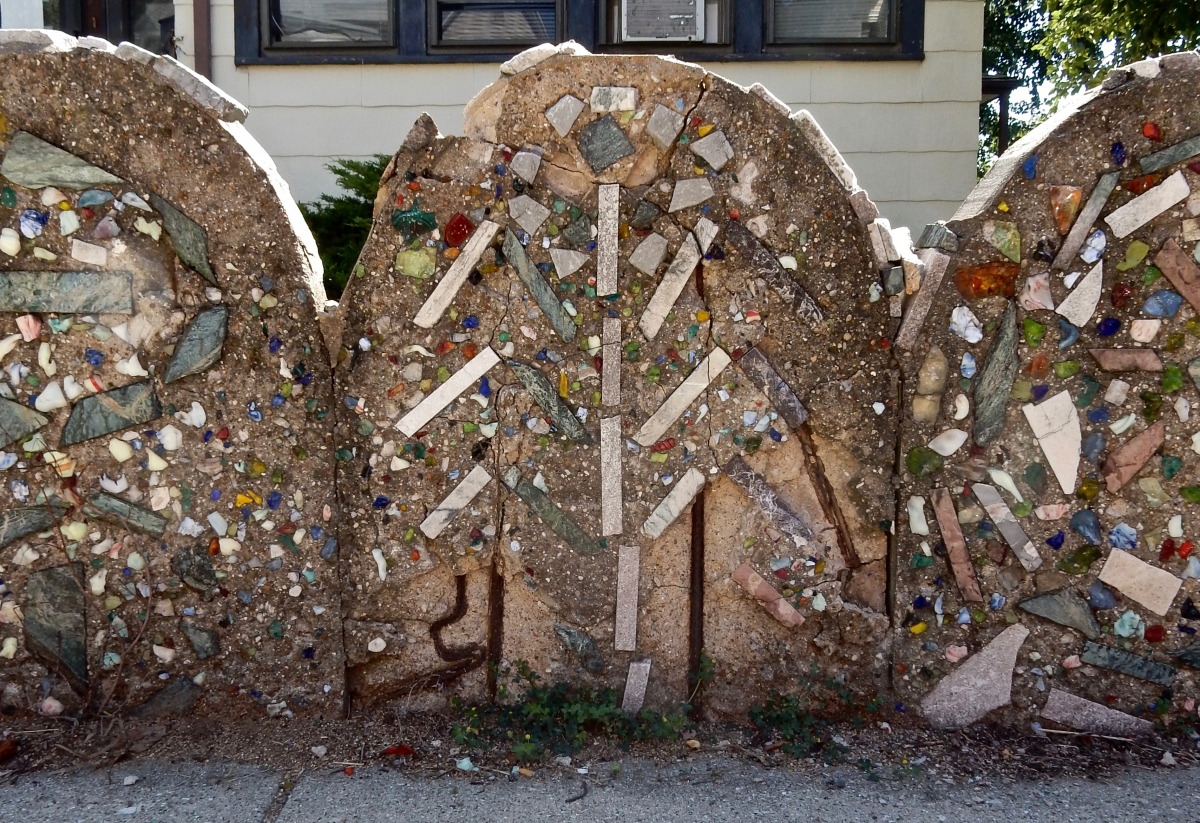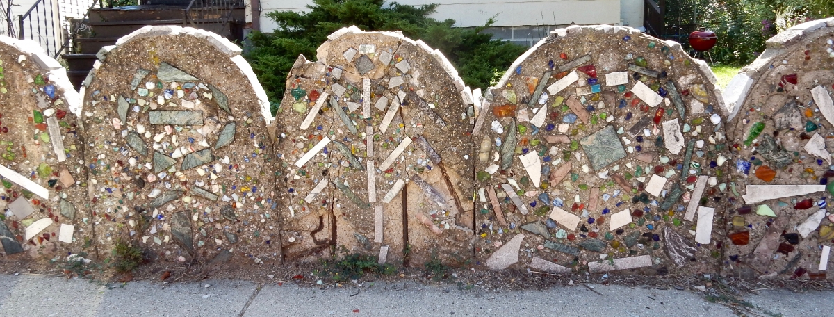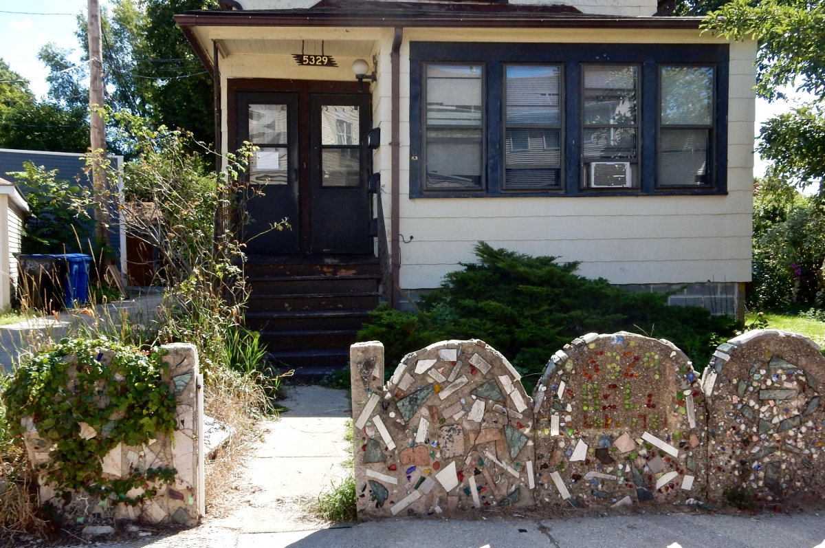 This pique assiette folk-art fence in Chicago’s wonderful Bowmanville neighborhood appears to date to 1973. It fronts a nondescript house on a nondescript, low-traffic street. Very few people driving by on the nearest thoroughfare are likely to recognize that they just passed an important folk-art site.