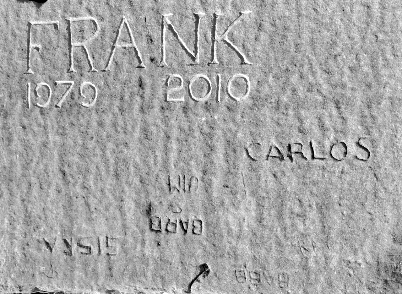 “Frank” is a tribute to a close friend who died in a car accident in 2010, one of two memorials Muzyka carved at Morgan Shoal. The other is simpler but still striking, just the name Frank and his years (1979-2010).