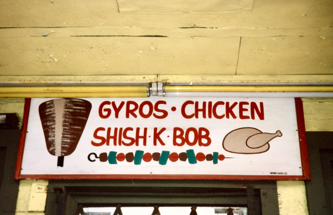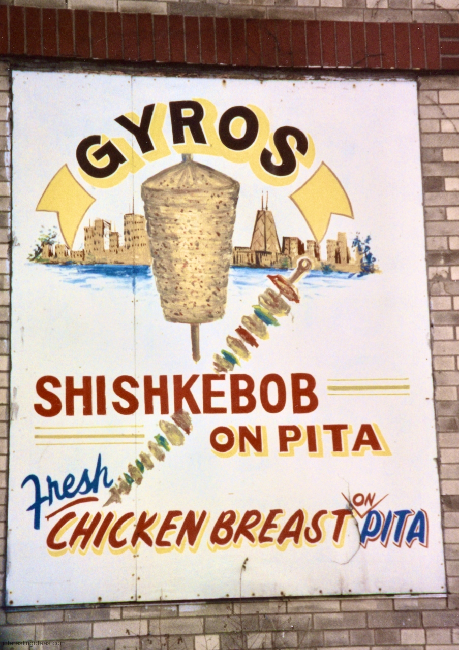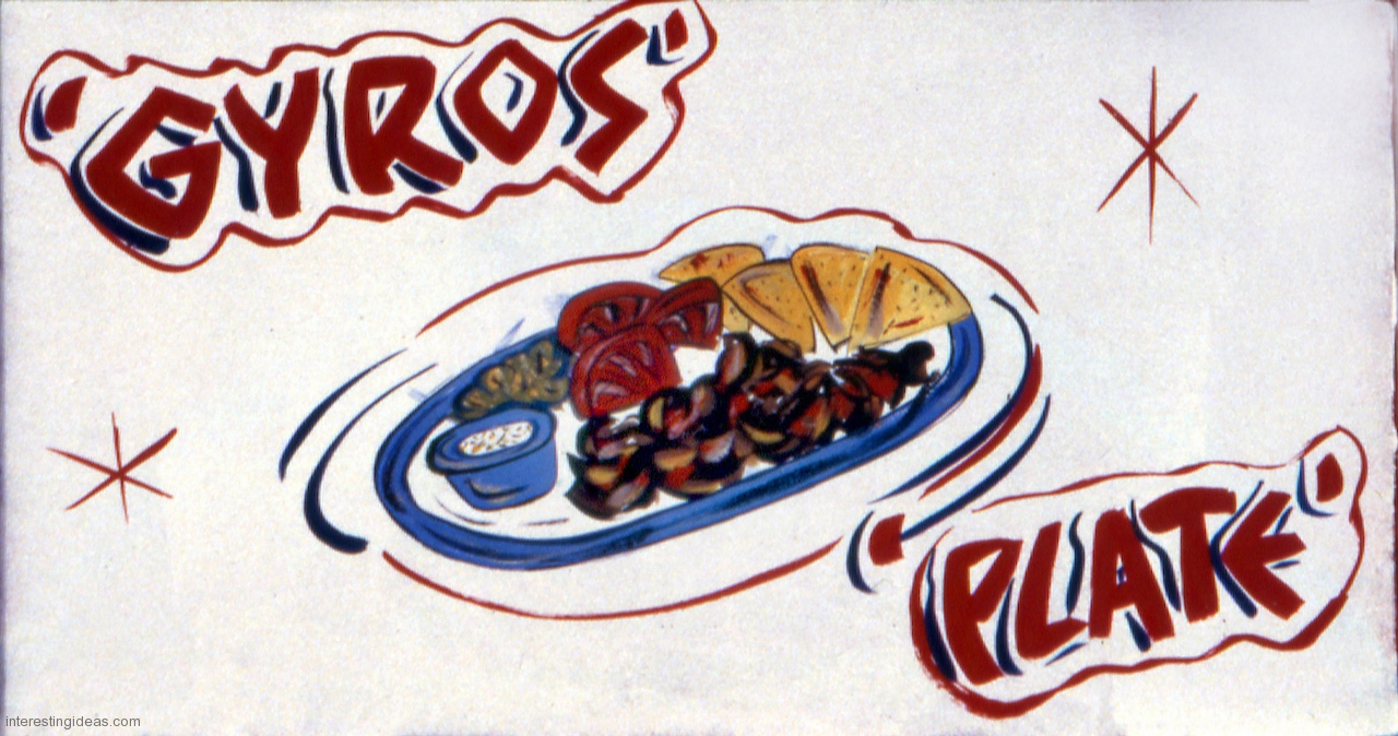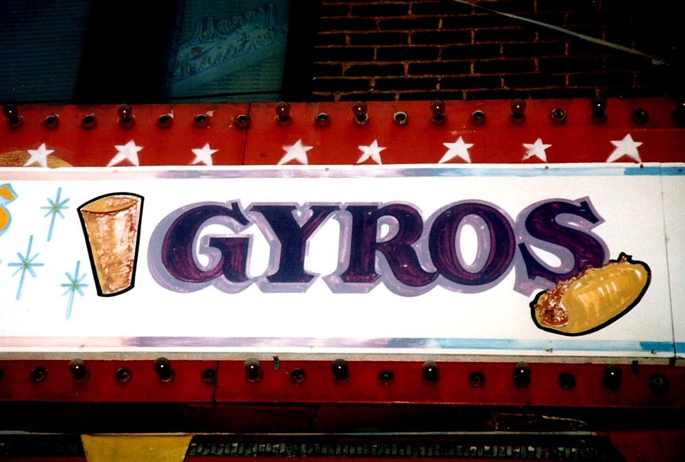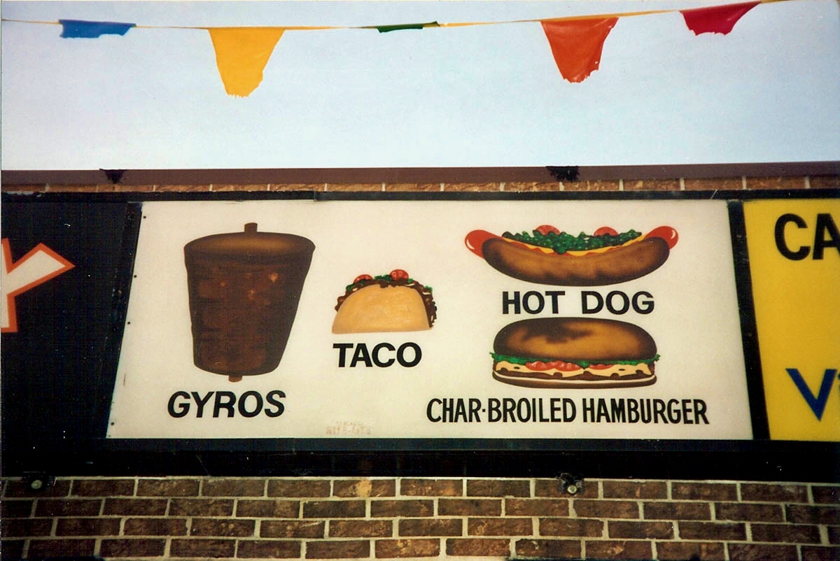 Gyros has inspired some wonderful hand-painted signs. The easy availability of photographic and other mechanically produced imagery, often provided by vendors, has chipped away at one-of-a-kind signage. But some of the masterpieces on this page still exist, starting with Nick’s Drive In.