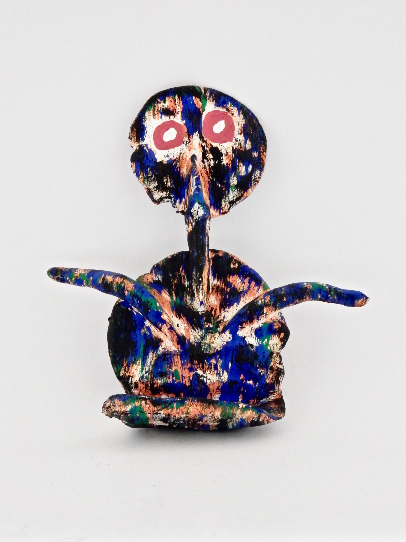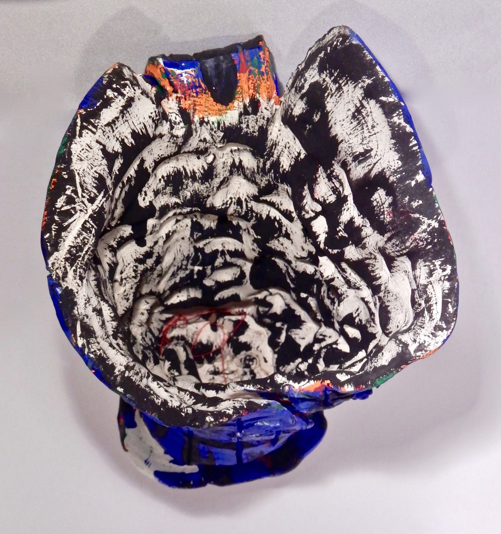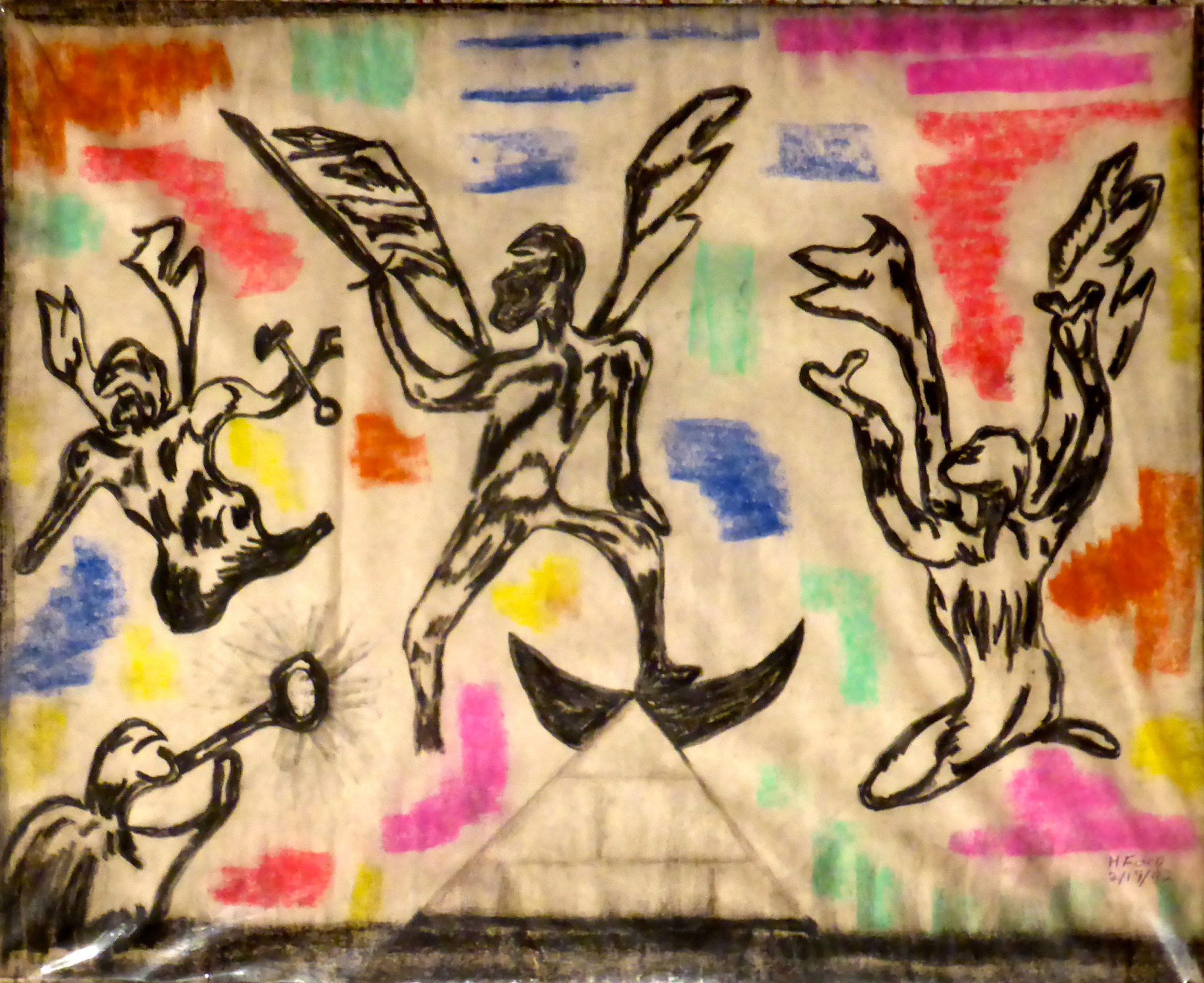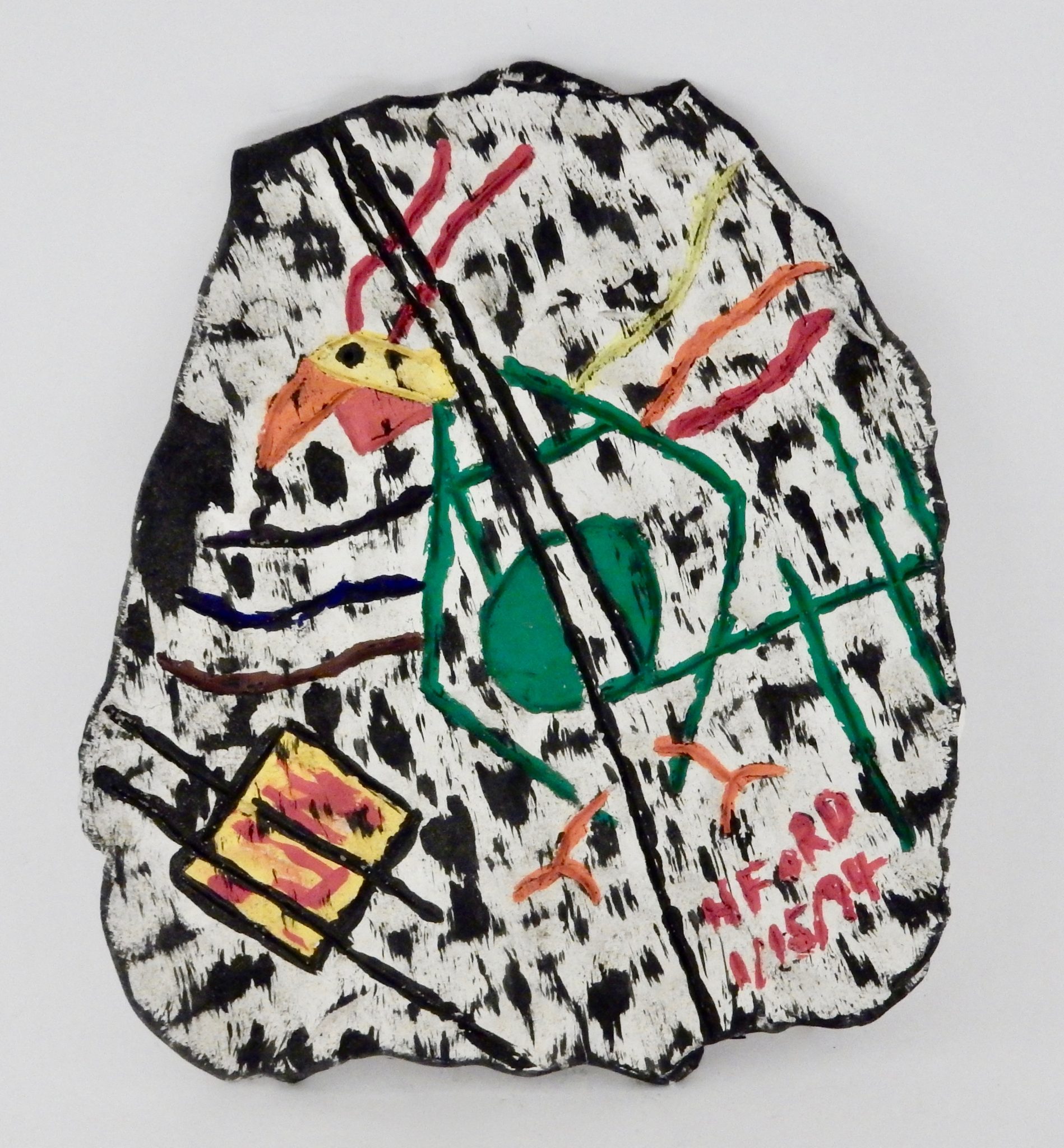 Harvey Ford was a prolific producer of drawings when he was in the art program at Joliet’s Stateville Penitentiary, but he also made some impressive sculptures, mostly ceramic, and at least a few papier-mâché. The colors and shapes are more than a match for the intensity of his drawings, many of which he made with burnt matches.