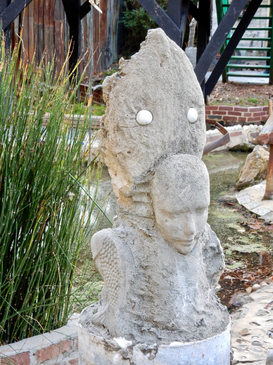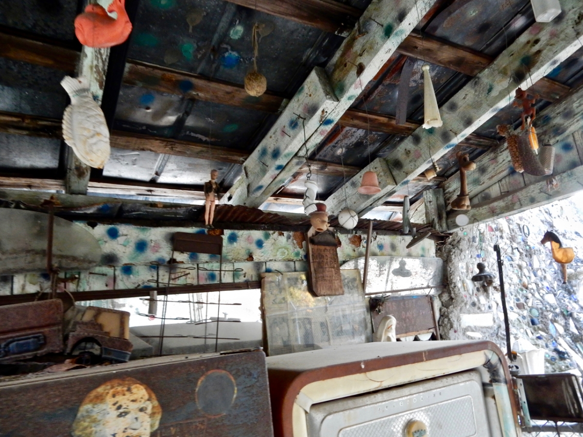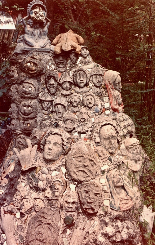 The result: He produced compulsively, without conventional boundaries, collecting and decorating every kind of object he could find. He created a flood of paintings, prints, drawings, booklets and constructions, and he built a showcase garden full of messages, sculptures, signs, paintings and crazy structures, all driven by his visions and his makeshift solutions to the practical problems associated with crafting art. It was a one-person creative flowering like few the world has ever seen, and it was wonderful.