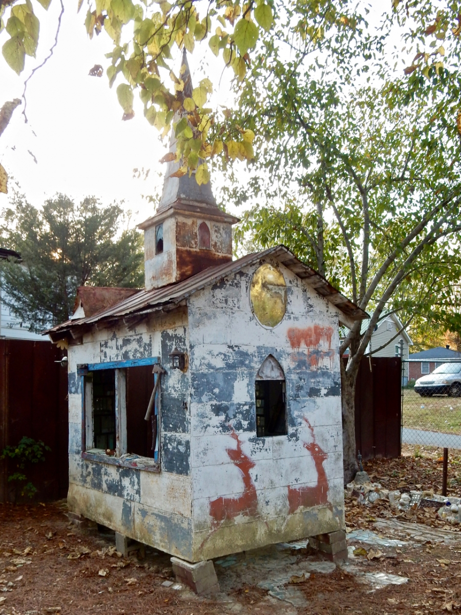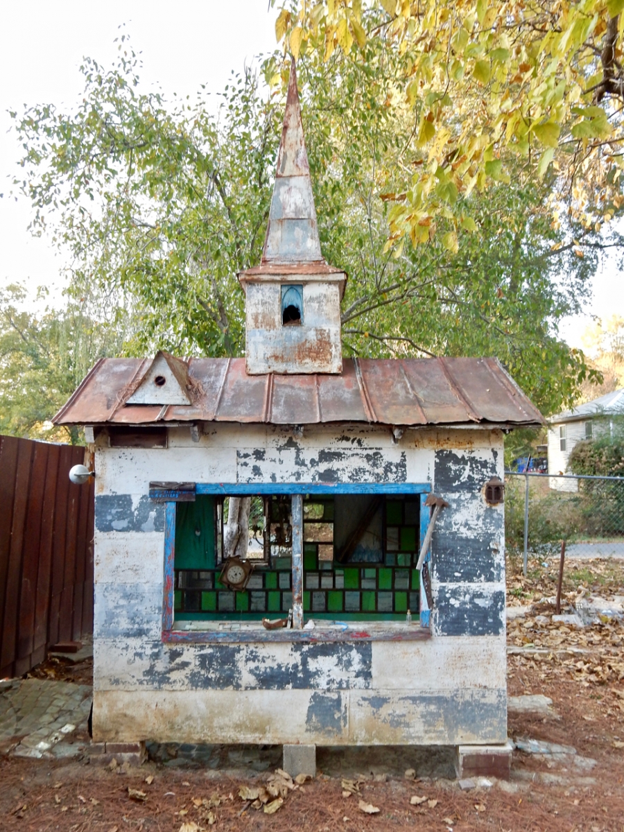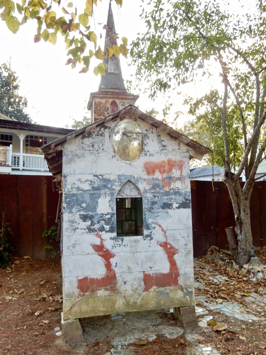 What probably did the most to break the heart of his collectors and fans was the decay of his crowning achievement, the Paradise Garden environment. Like most such places, Paradise Garden was always bound to be on the losing end of the contest with the elements. As Finster aged, the elements tended to prevail. Worse, in his final years some of the Garden’s best elements were sold off, either to collectors or, with more justification, to the High Museum in Atlanta. The decay got worse after Finster died in 2001, and to those who remembered the Garden at its peak it seemed a shadow of its former self.