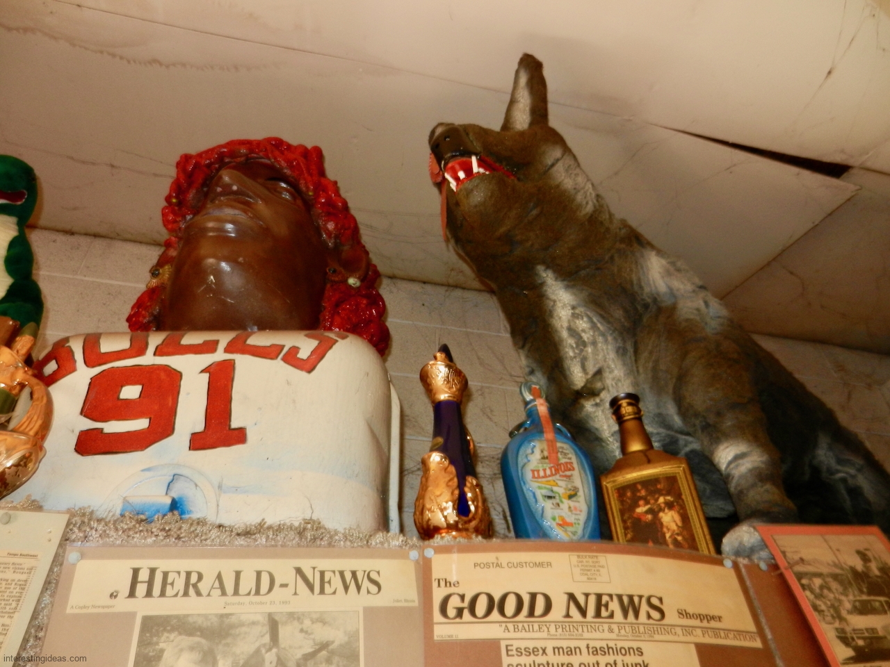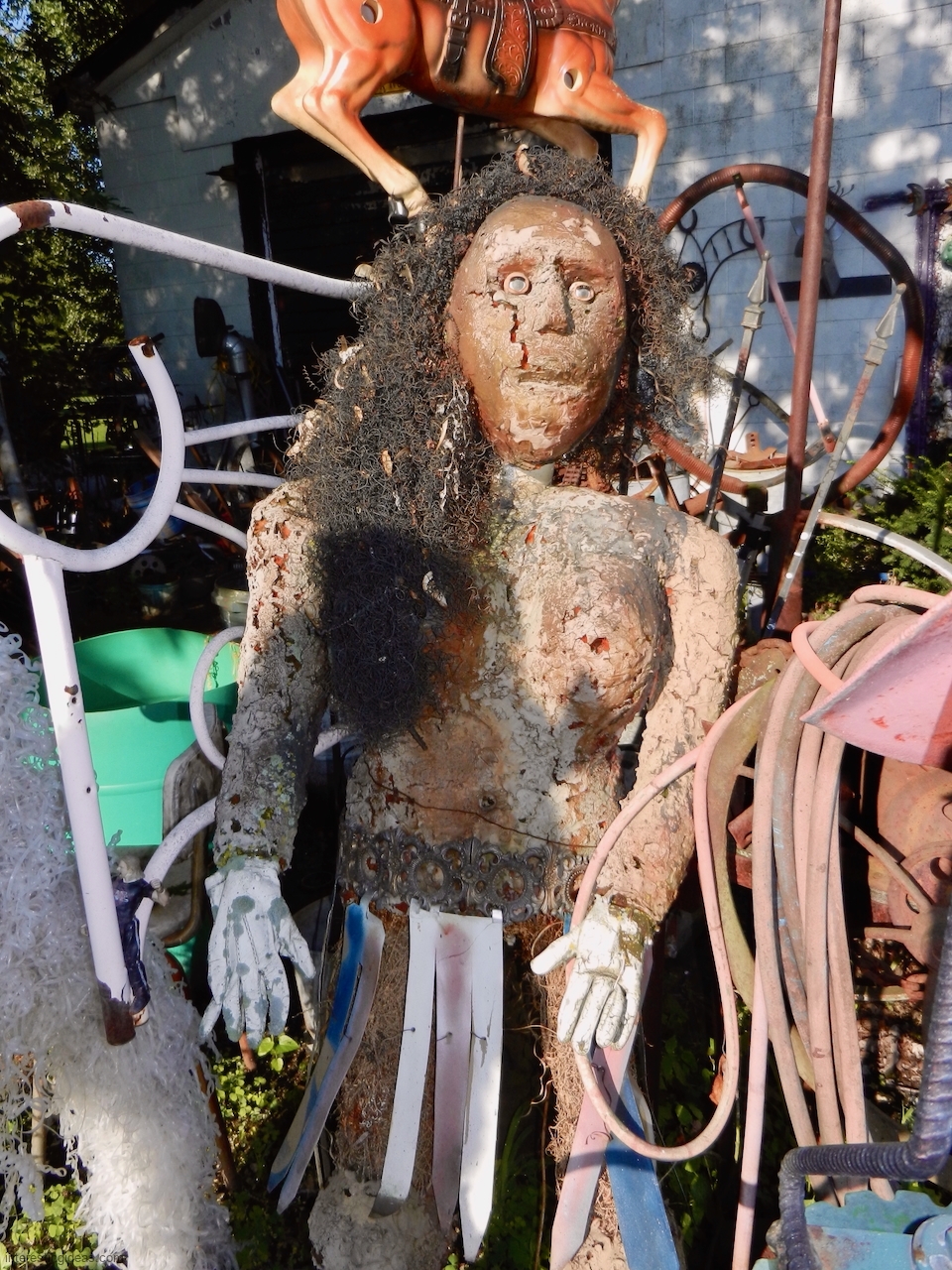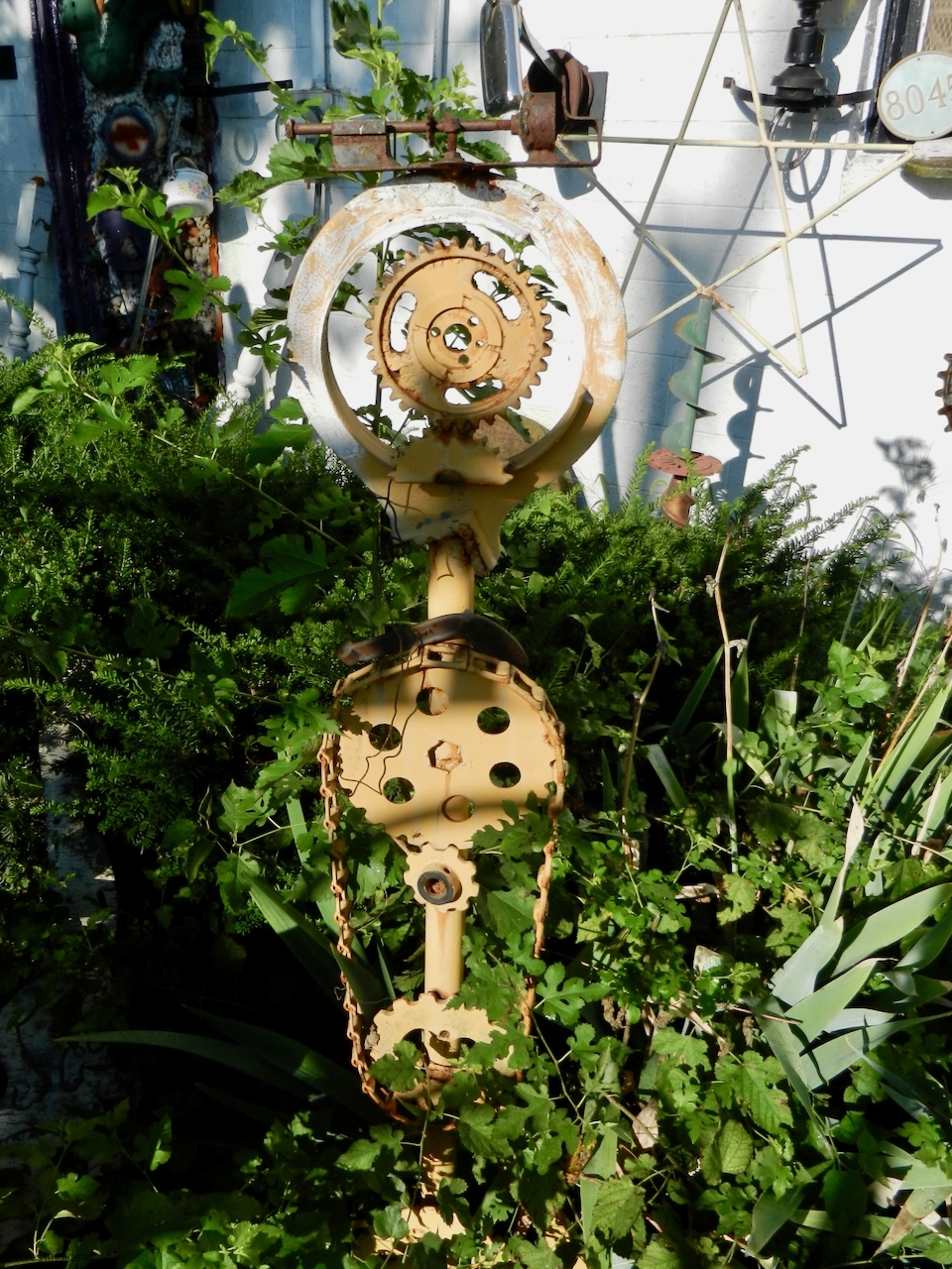 Much of Barker’s work was figurative, but many of his sculptures were quite abstracted, and some entirely abstract. It all added up to a mind-boggling environmental conglomeration. Its impressiveness, though, came at the expense of each individual piece’s impact; it could be hard to pick any one artwork out of the crowd. Fortunately, some of the more sculptural pieces were set off in the side and back yards away from the concentrated mass in front.