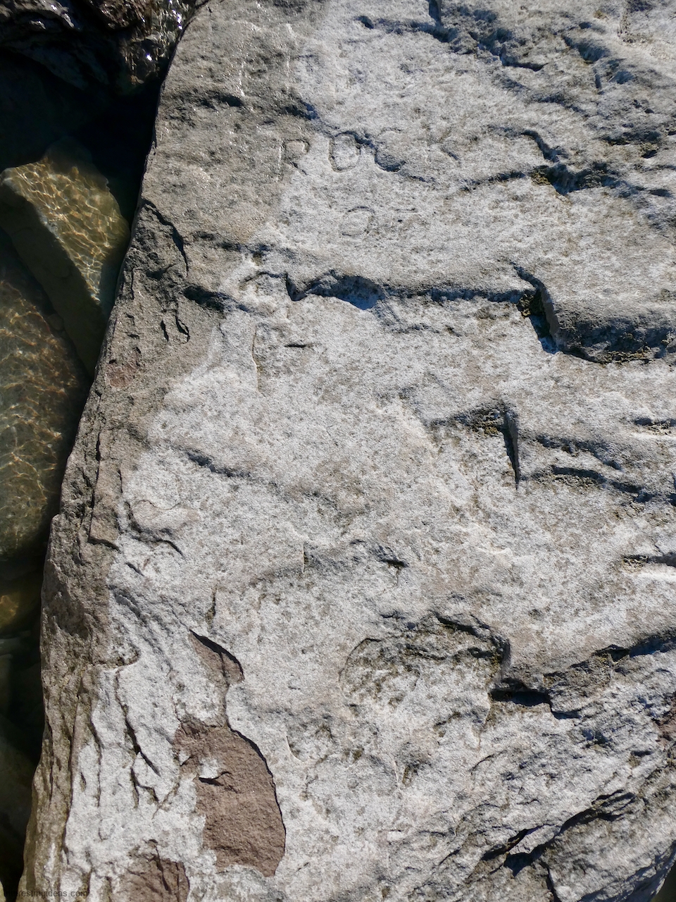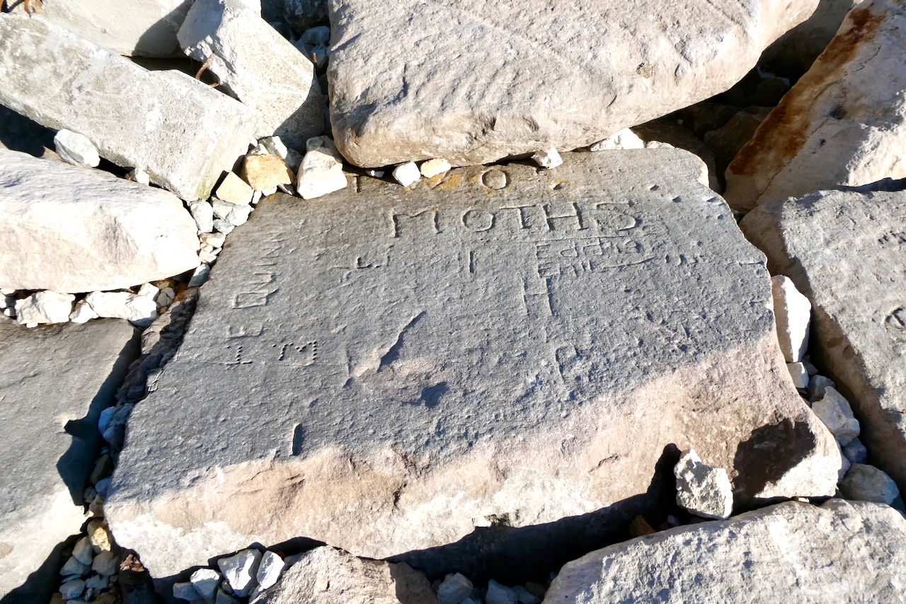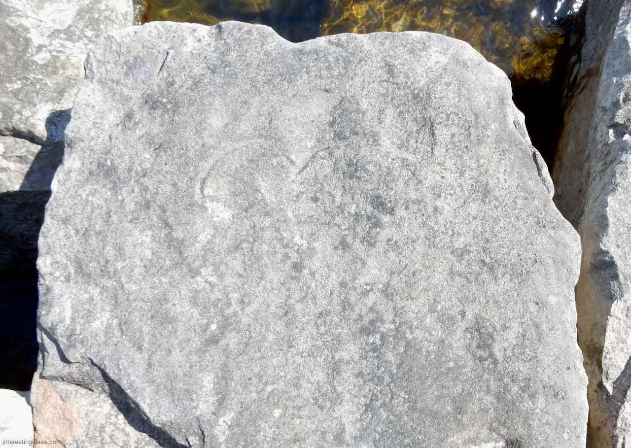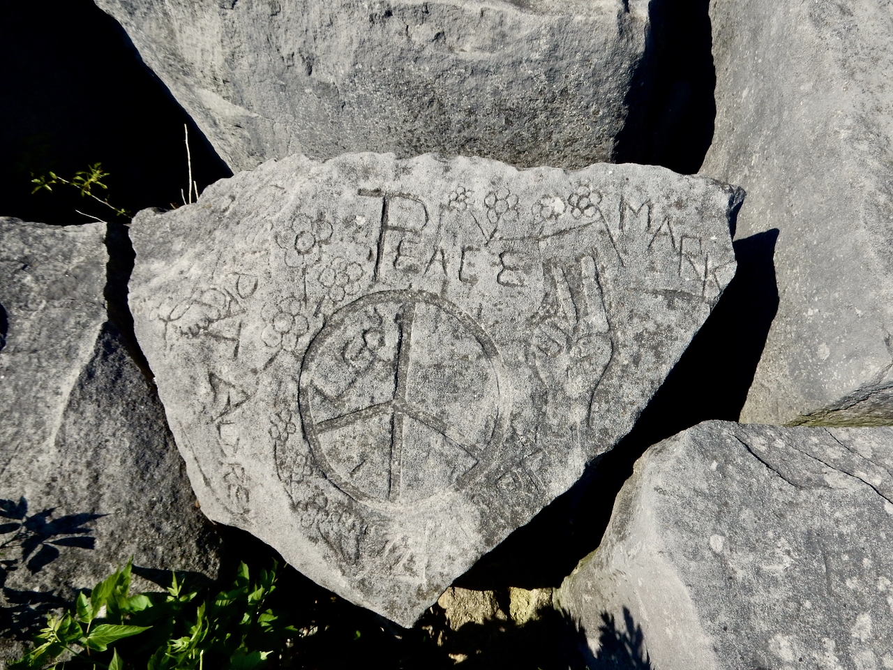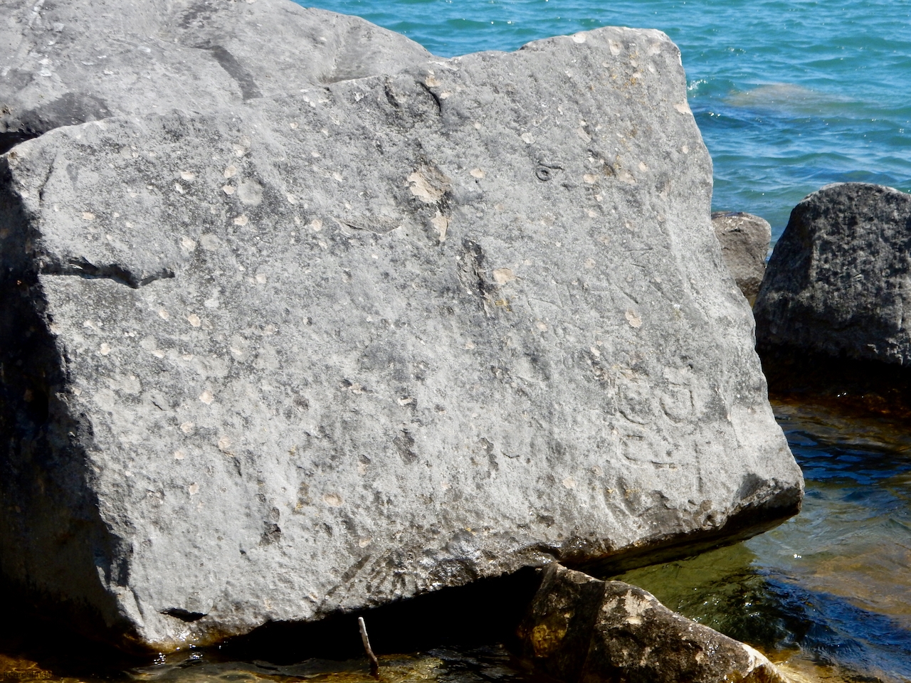 This spot, where carving began in the 1930s, includes one of the finest carved rocks along the lake, which I call the Peace Rock, as well as a compass beautifully rendered in stone. The compass, however, is on a rock that has already started sliding into the lake, and more are sure to follow absent some kind of human intervention.