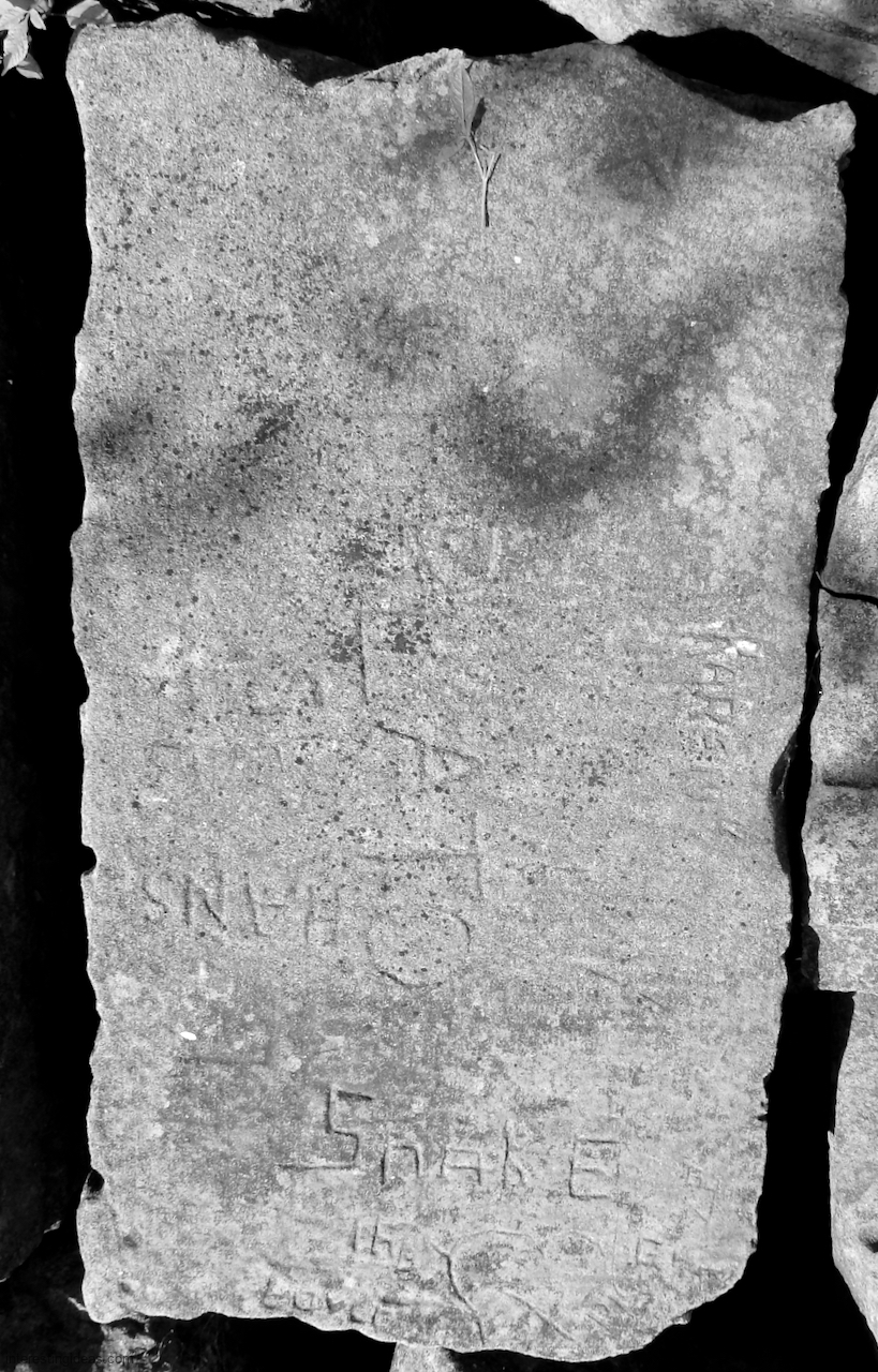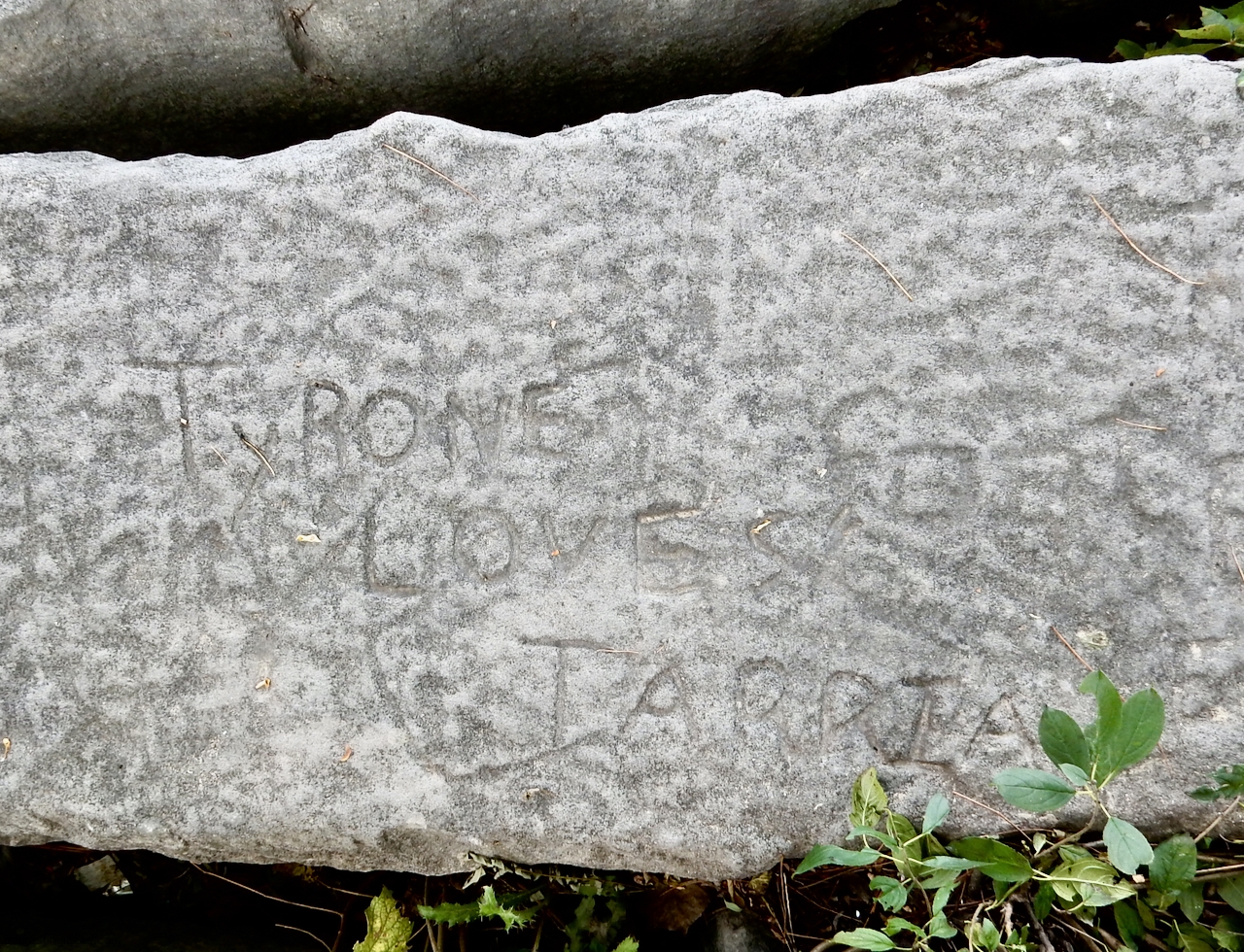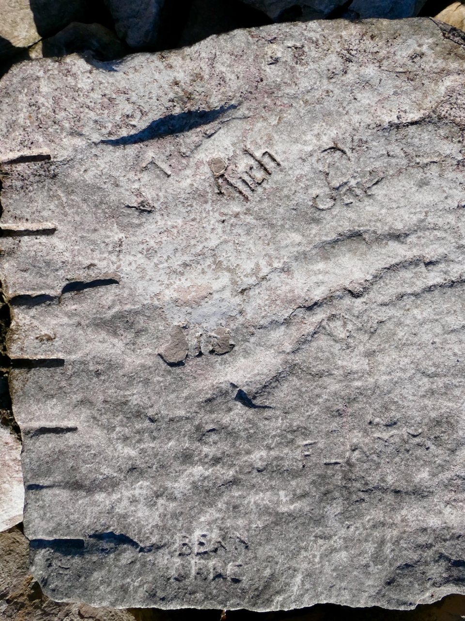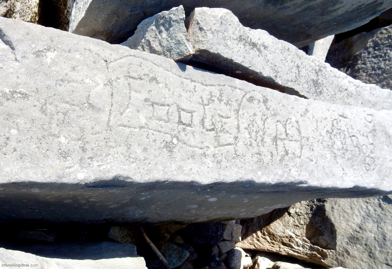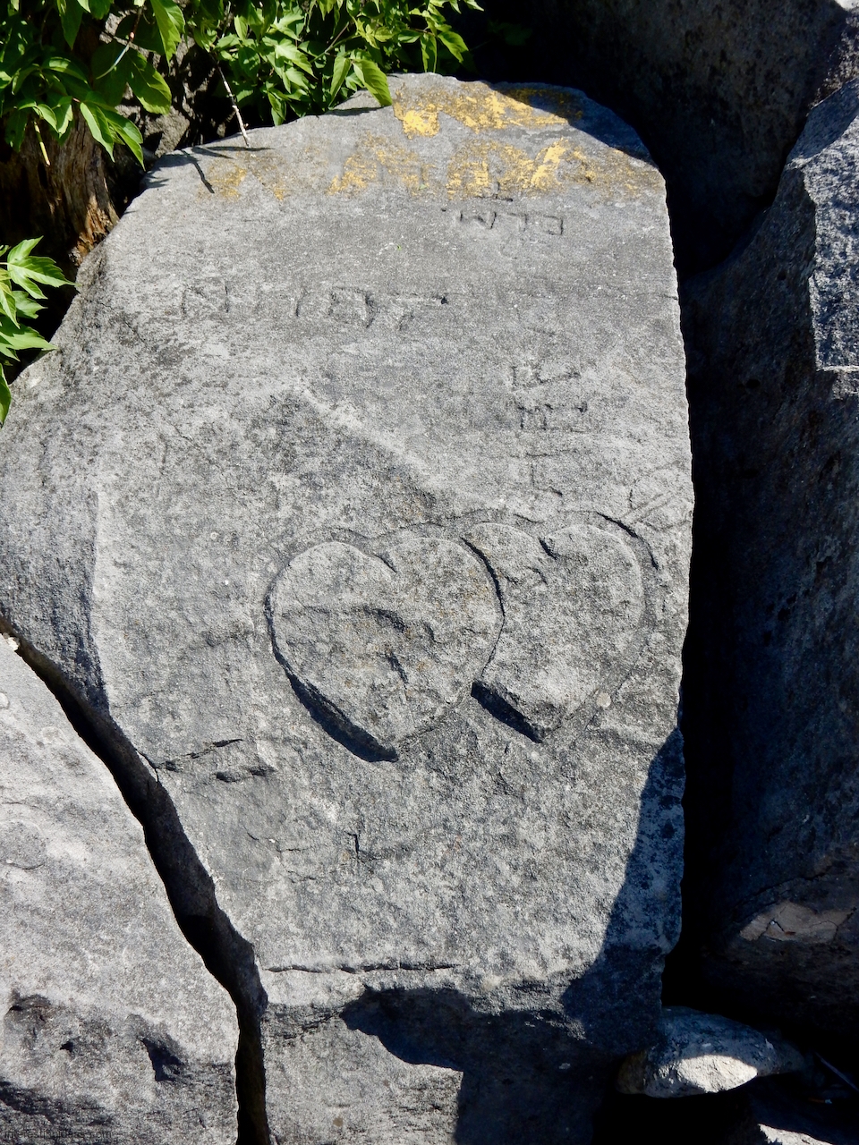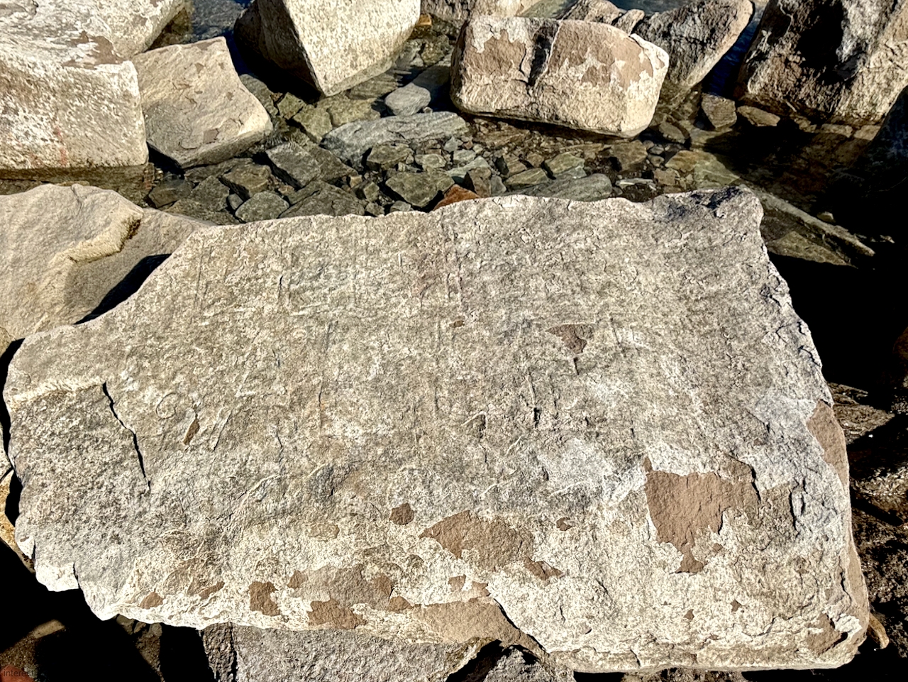 This spot, where carving began in the 1930s, includes one of the finest carved rocks along the lake, which I call the Peace Rock, as well as a compass beautifully rendered in stone. The compass, however, is on a rock that has already started sliding into the lake, and more are sure to follow absent some kind of human intervention.