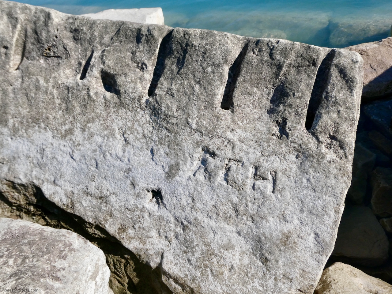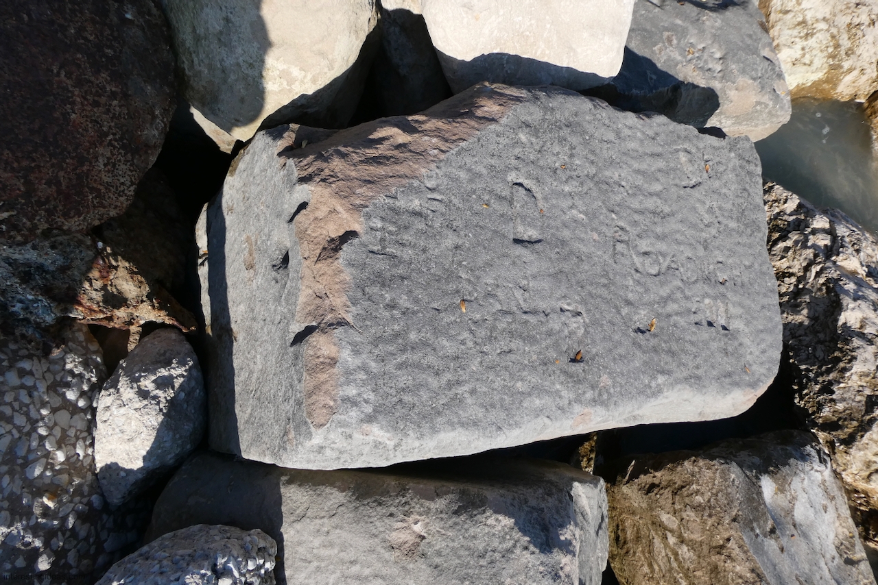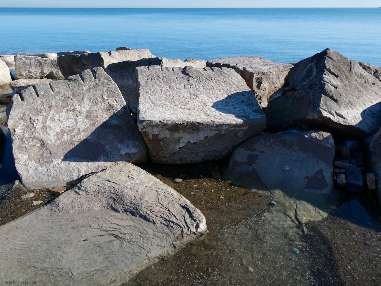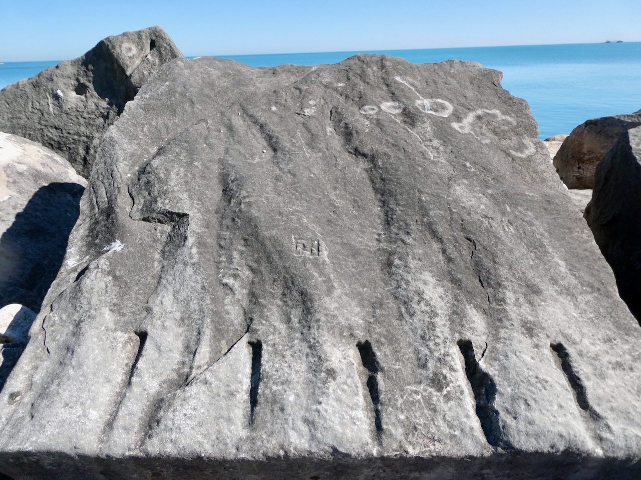 Meanwhile, just a bit south of La Rabida hospital lies one of the only sections of natural lakeshore in the city. Just on the edge of that bit of bedrock (and sometimes entirely offshore depending on lake levels) is a line of protective limestone blocks that host a number of lovely carvings, including the most elaborate one of all. That’s a carving with 12 separate panels created in the late 1940s and early 1950s and featuring a number of cryptic messages and figures. (You’ll have to scroll most of the way down the gallery to see that one.)