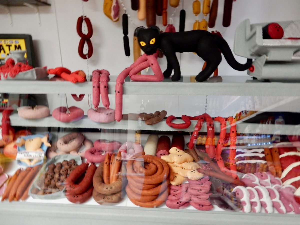 The individual items — available for sale, of course — are each a treat in themselves. When they fill the shelves and fixtures of a shop, the colors and cultural resonances are wonderful. Sparrow, who hails from Bath, England, clearly wants to delight her audience with good feelings, but she also has some social commentary in mind.