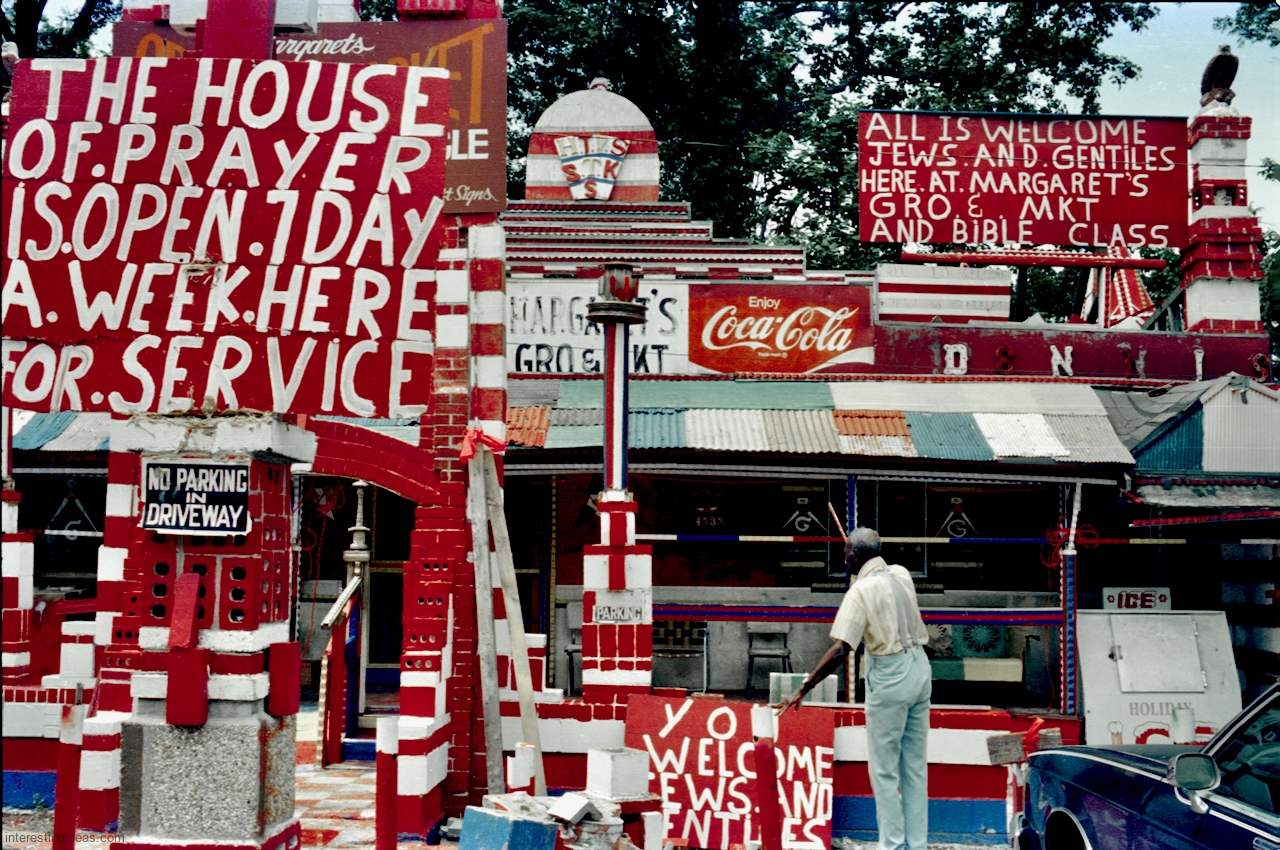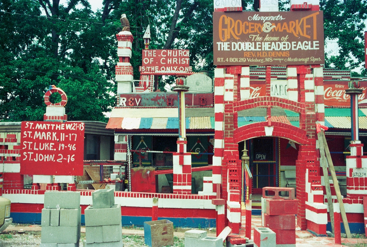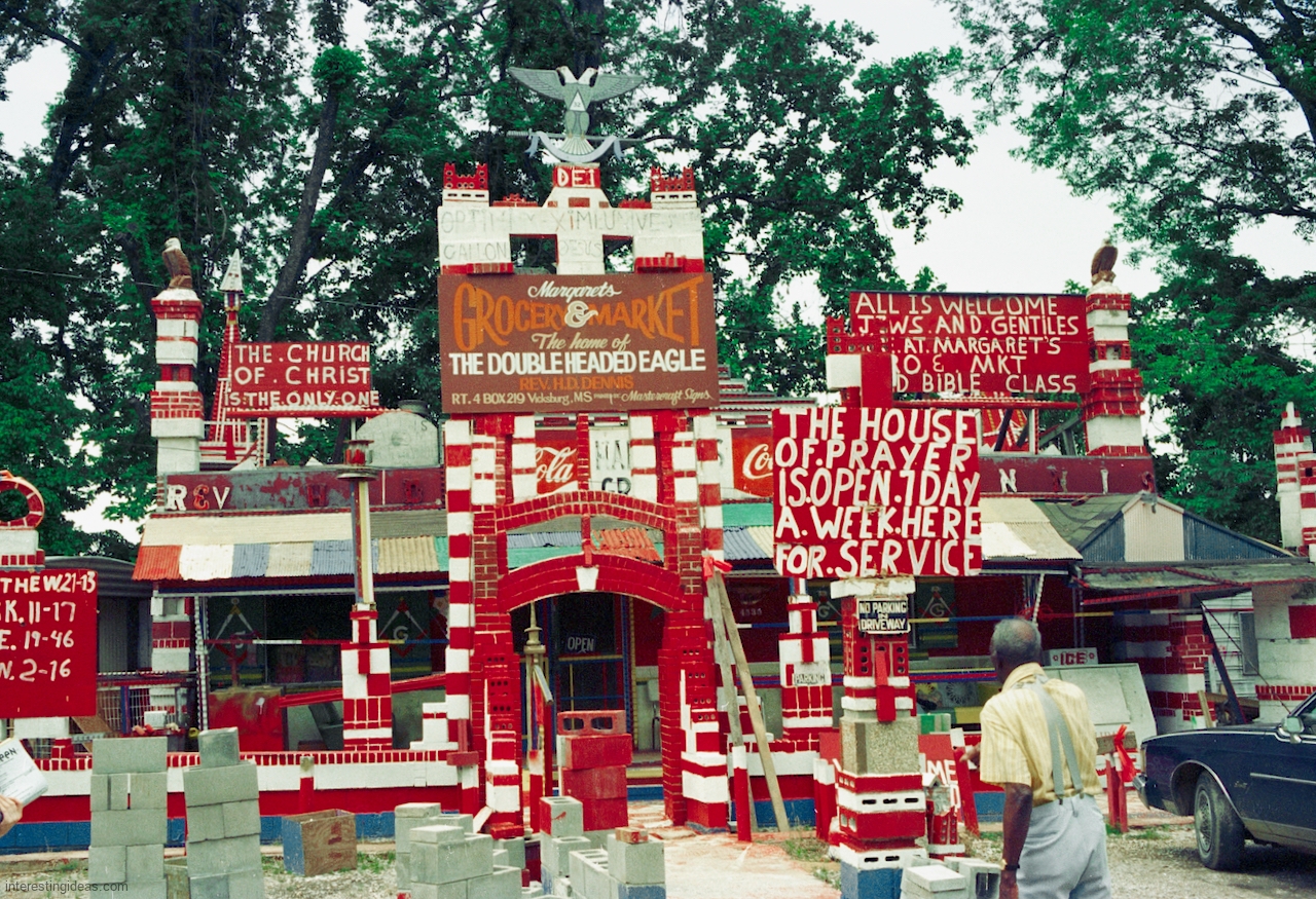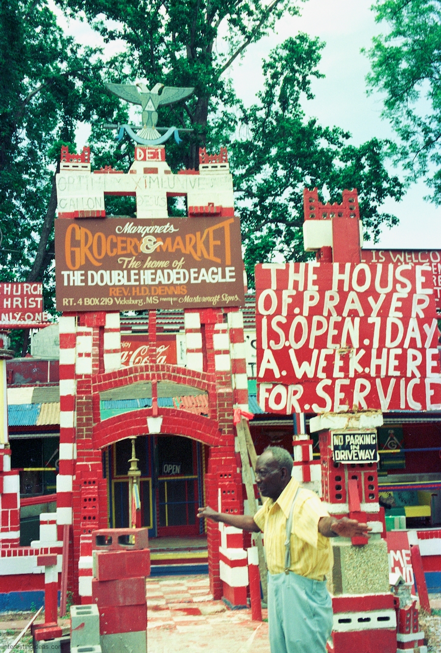 If you took the cutoff from Highway 61 into Vicksburg, Mississippi, and had need of 1. sundries 2. spiritual uplift or 3. a powerful folk-art environment, you could stop at Margaret’s Grocery. The Rev. H.D. Dennis, who encased the country store inside and out with his sculpture and fantastic architecture, would preach you a personal sermon while his wife Margaret stood ready to meet your earthly needs.