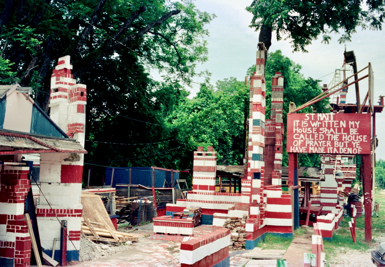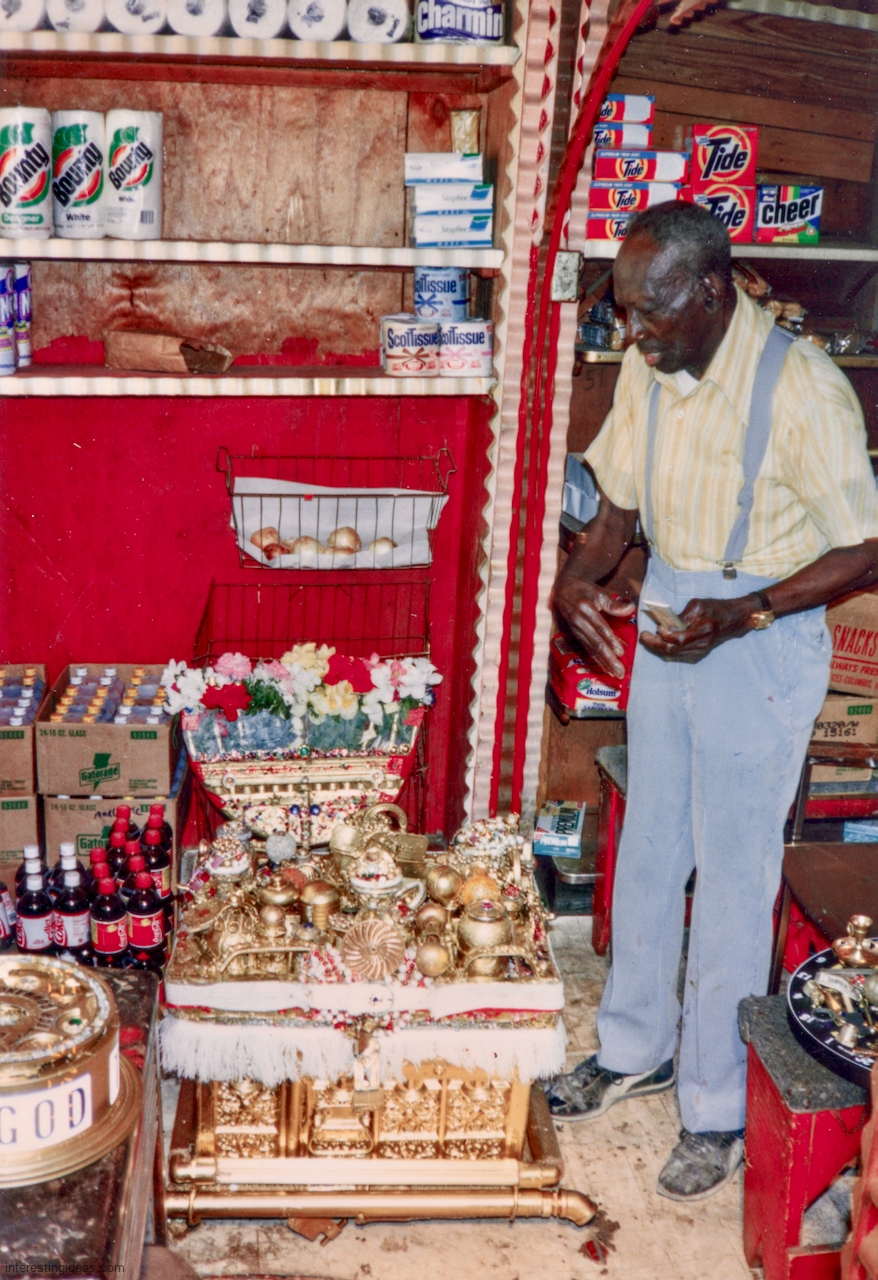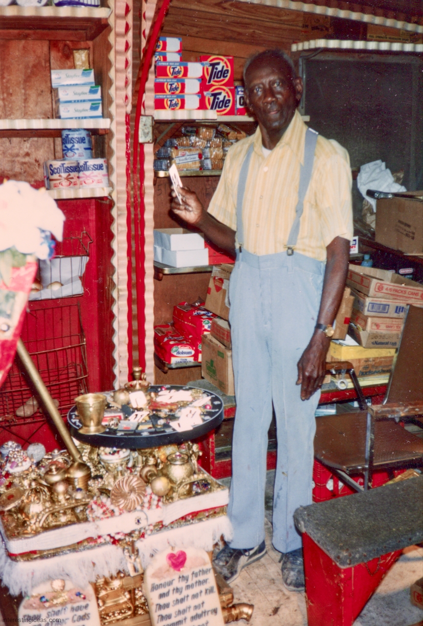 If you took the cutoff from Highway 61 into Vicksburg, Mississippi, and had need of 1. sundries 2. spiritual uplift or 3. a powerful folk-art environment, you could stop at Margaret’s Grocery. The Rev. H.D. Dennis, who encased the country store inside and out with his sculpture and fantastic architecture, would preach you a personal sermon while his wife Margaret stood ready to meet your earthly needs.