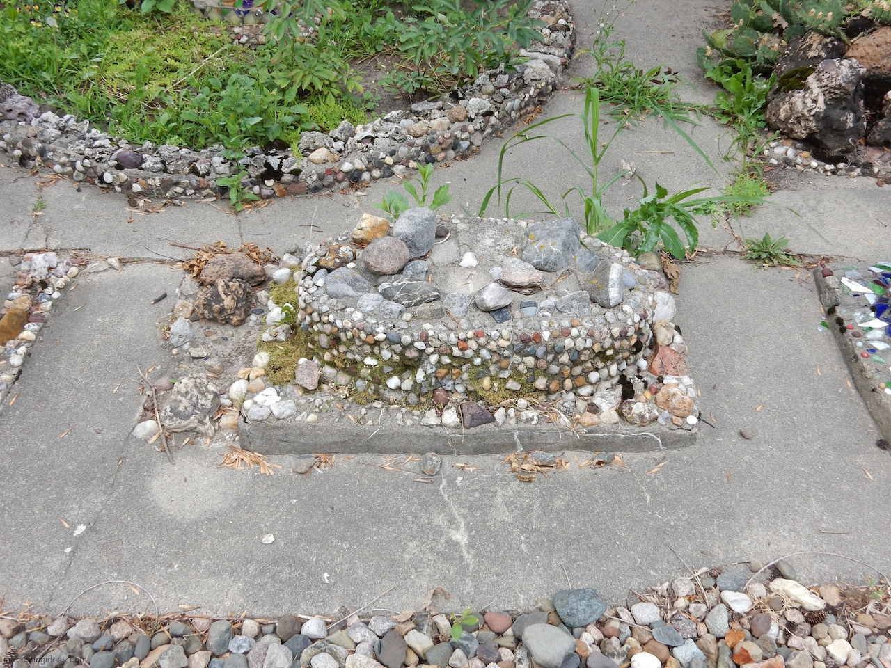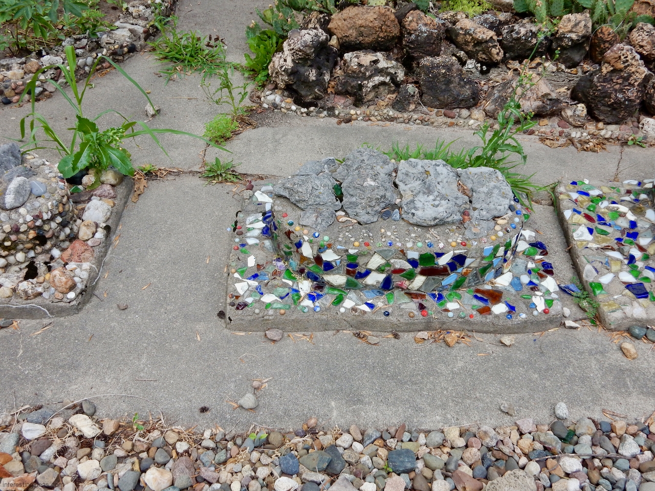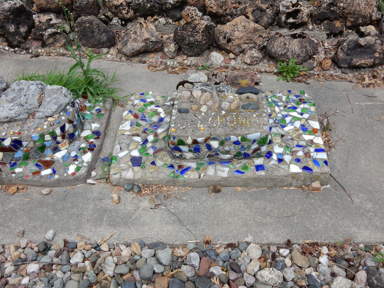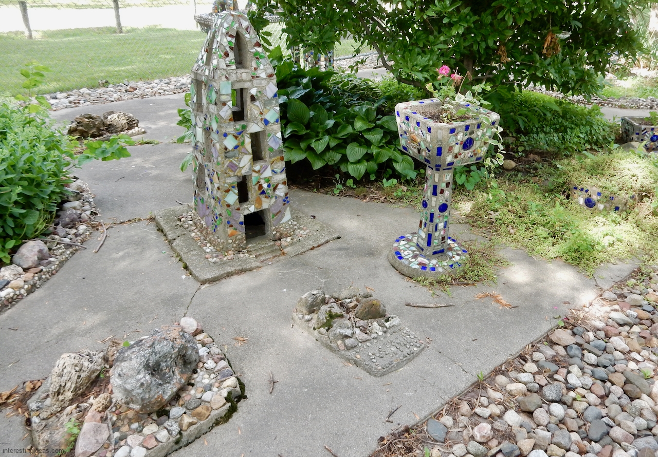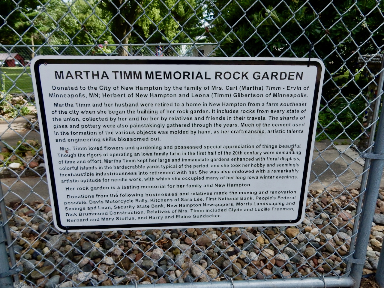“Martha Timm and her husband were retired to a home in New Hampton from a farm southeast of the city when she began the building of her rock garden. It includes rocks from every state of the union, collected by her and for her by relatives and friends in their travels. The shards of glass and pottery were also painstakingly gathered through the years. Much of the cement used in the formation of the various objects was molded by hand, as her craftmanship, artistic talents and engineering skills blossomed out.