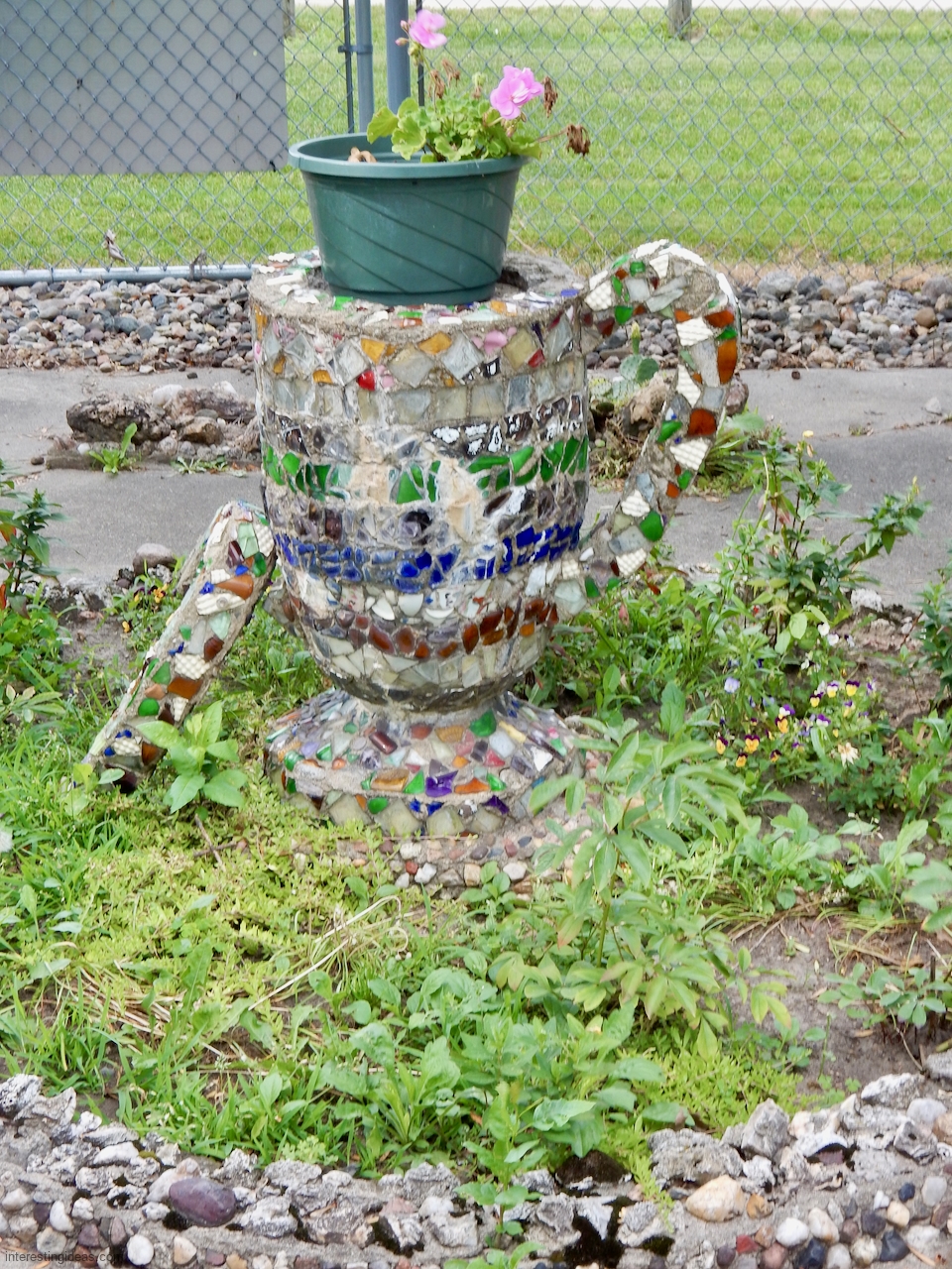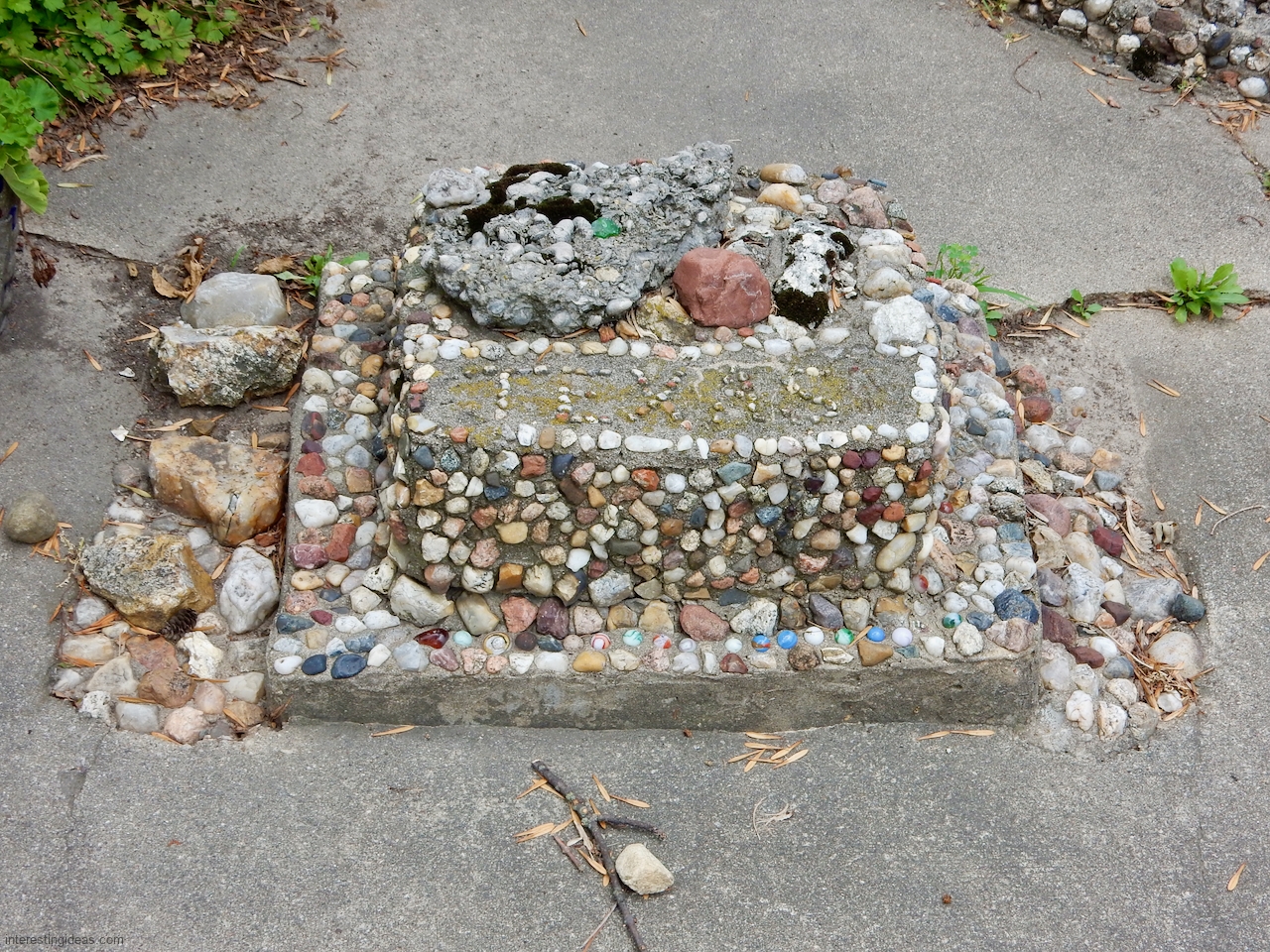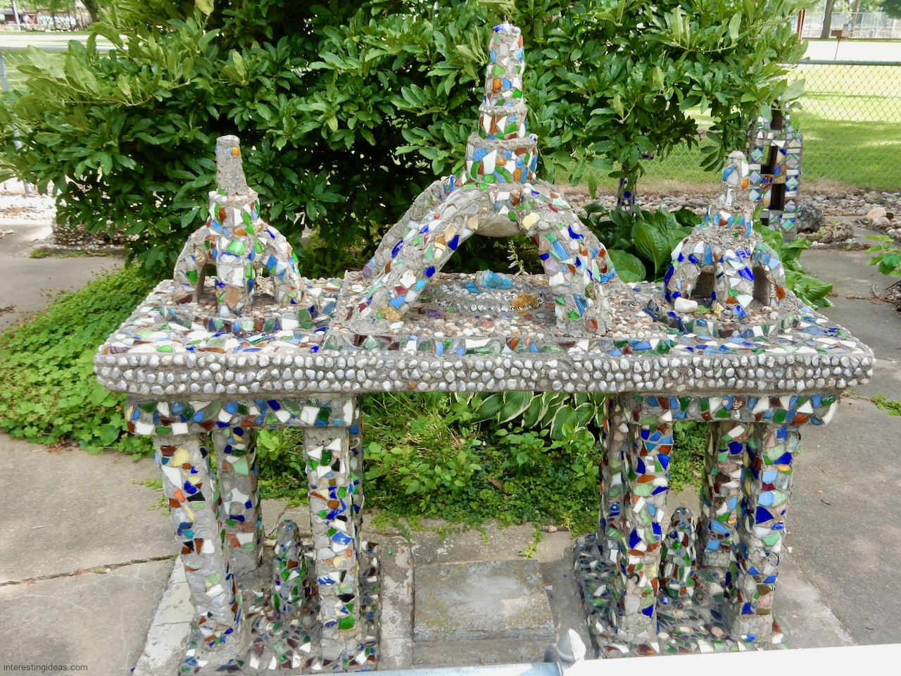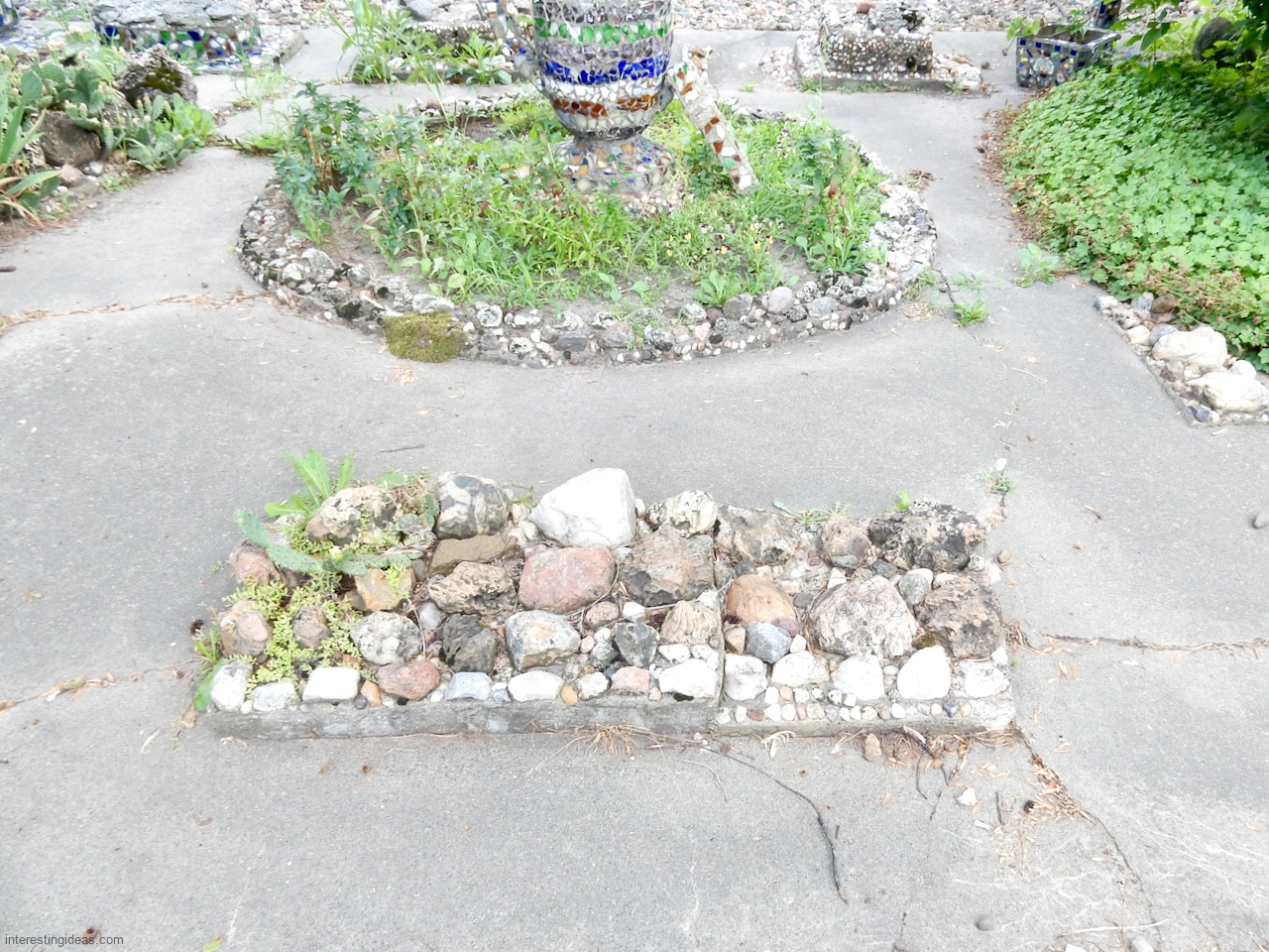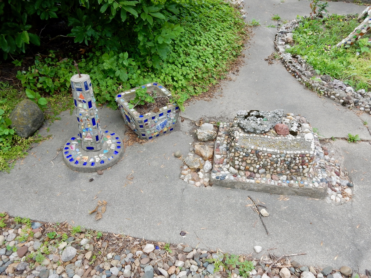 “Martha Timm and her husband were retired to a home in New Hampton from a farm southeast of the city when she began the building of her rock garden. It includes rocks from every state of the union, collected by her and for her by relatives and friends in their travels. The shards of glass and pottery were also painstakingly gathered through the years. Much of the cement used in the formation of the various objects was molded by hand, as her craftmanship, artistic talents and engineering skills blossomed out.