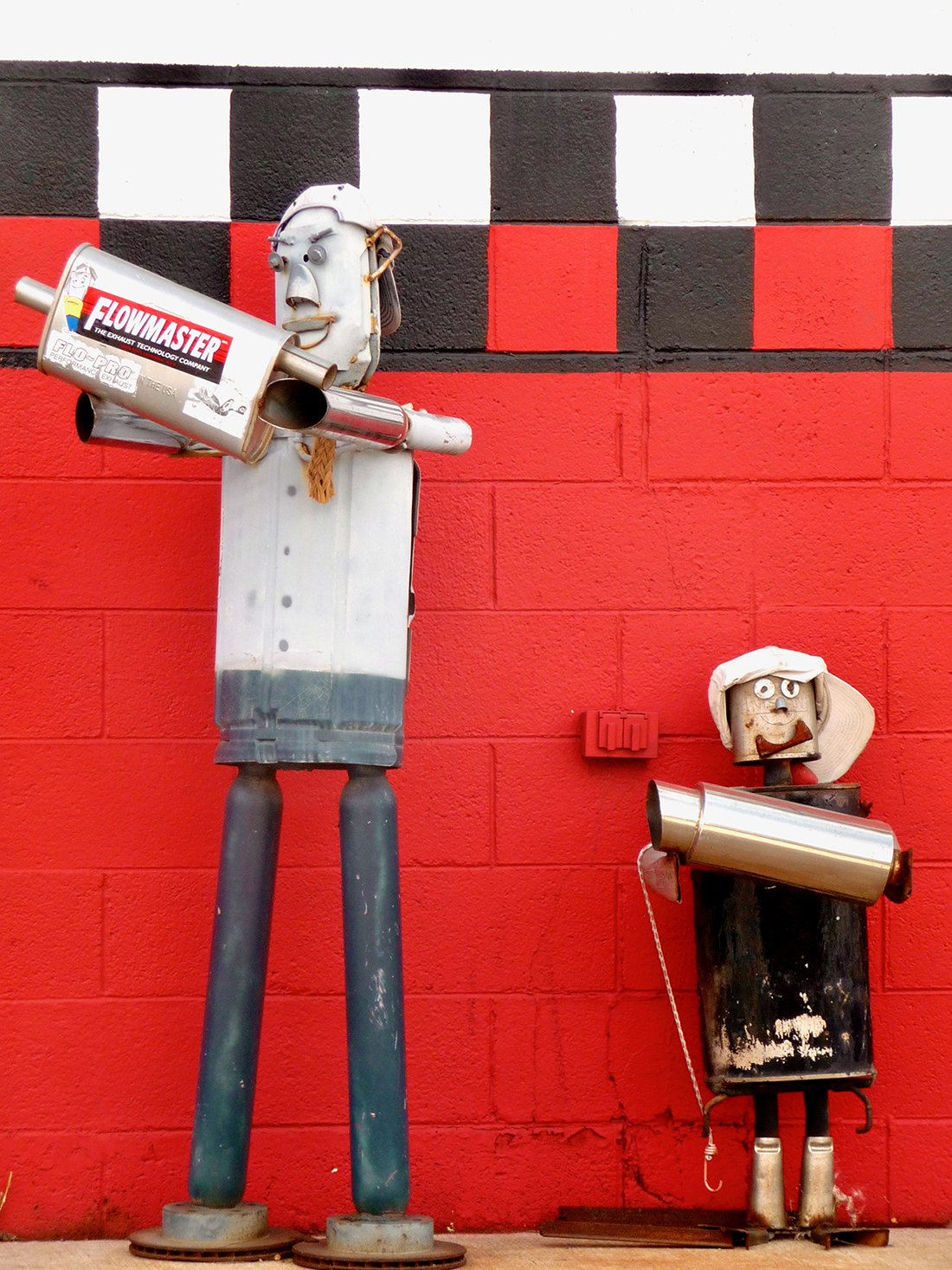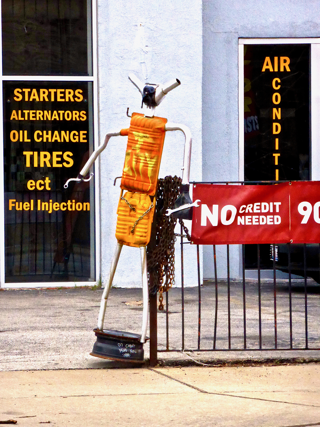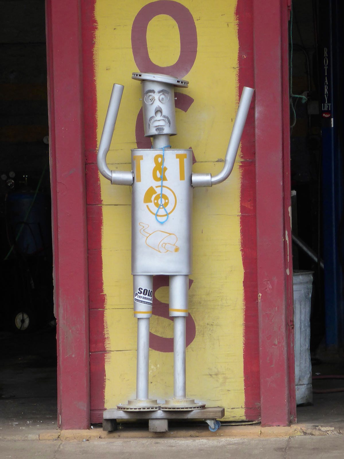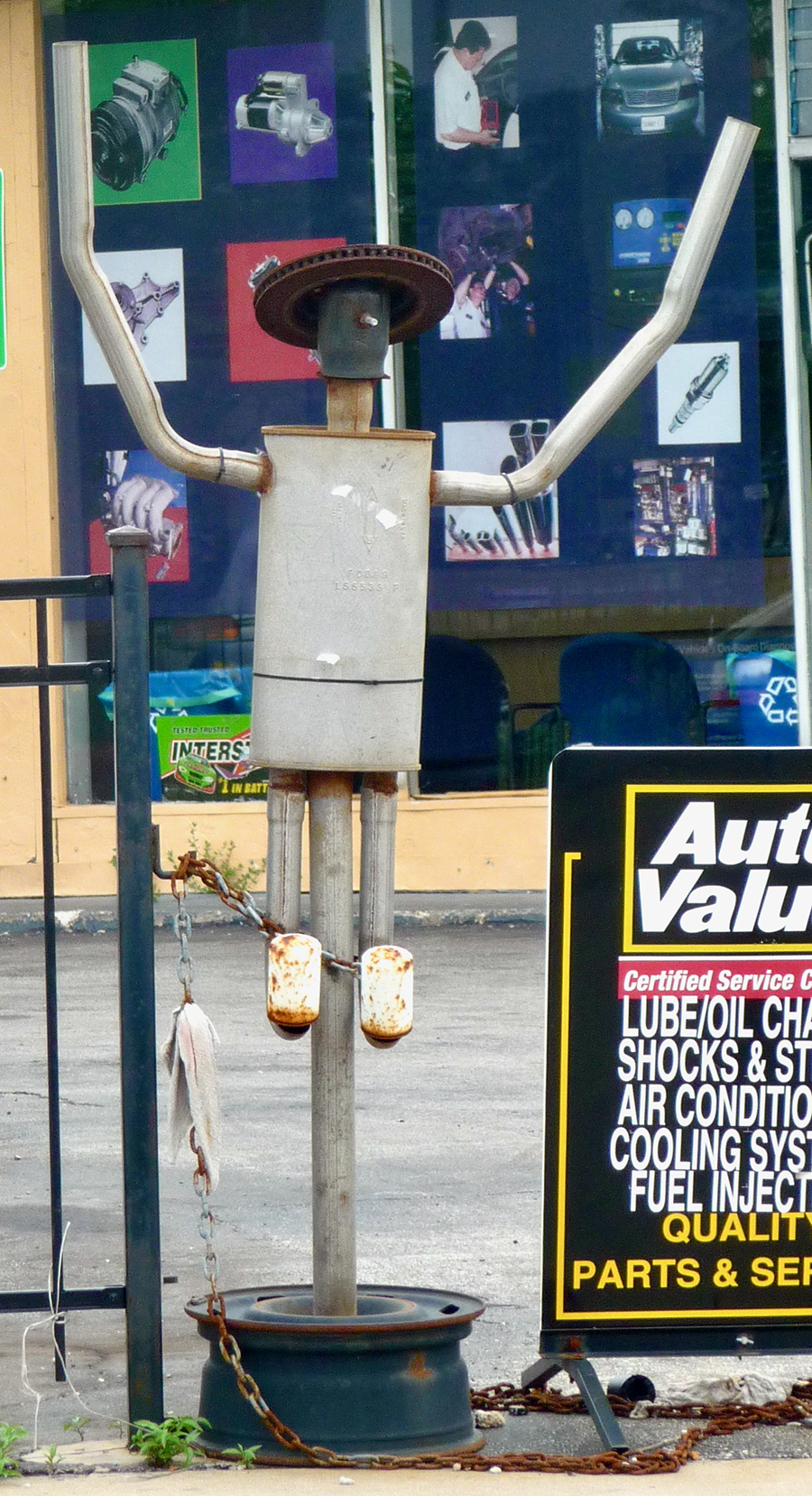 Muffler people are made by skilled artisans, even if their skill working with metal is in a different context than making art. What their creators know they know from repairing cars and from what they’ve seen other repairmen do with spare and used parts to create a sculpture/advertisement.