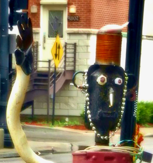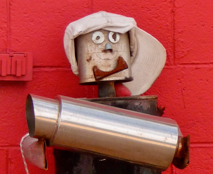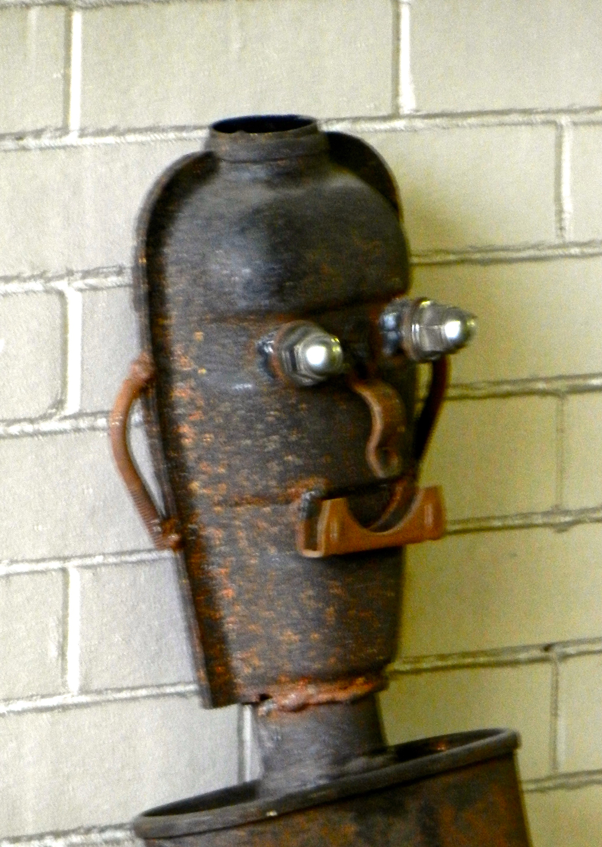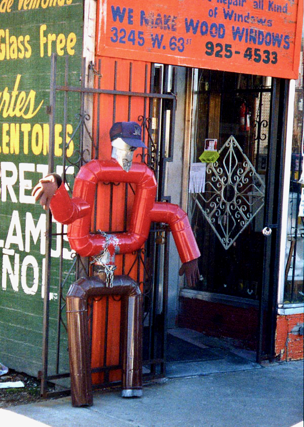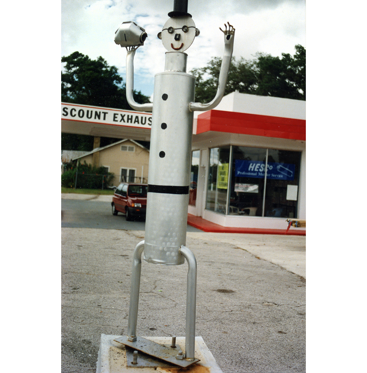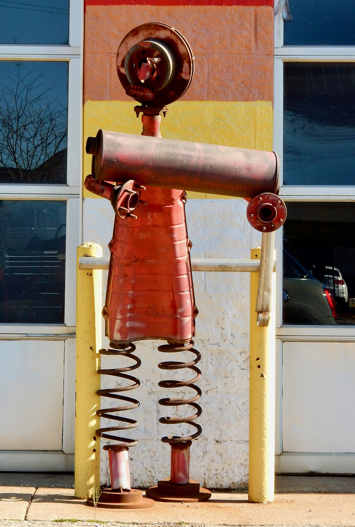 Muffler people are made by skilled artisans, even if their skill working with metal is in a different context than making art. What their creators know they know from repairing cars and from what they’ve seen other repairmen do with spare and used parts to create a sculpture/advertisement.