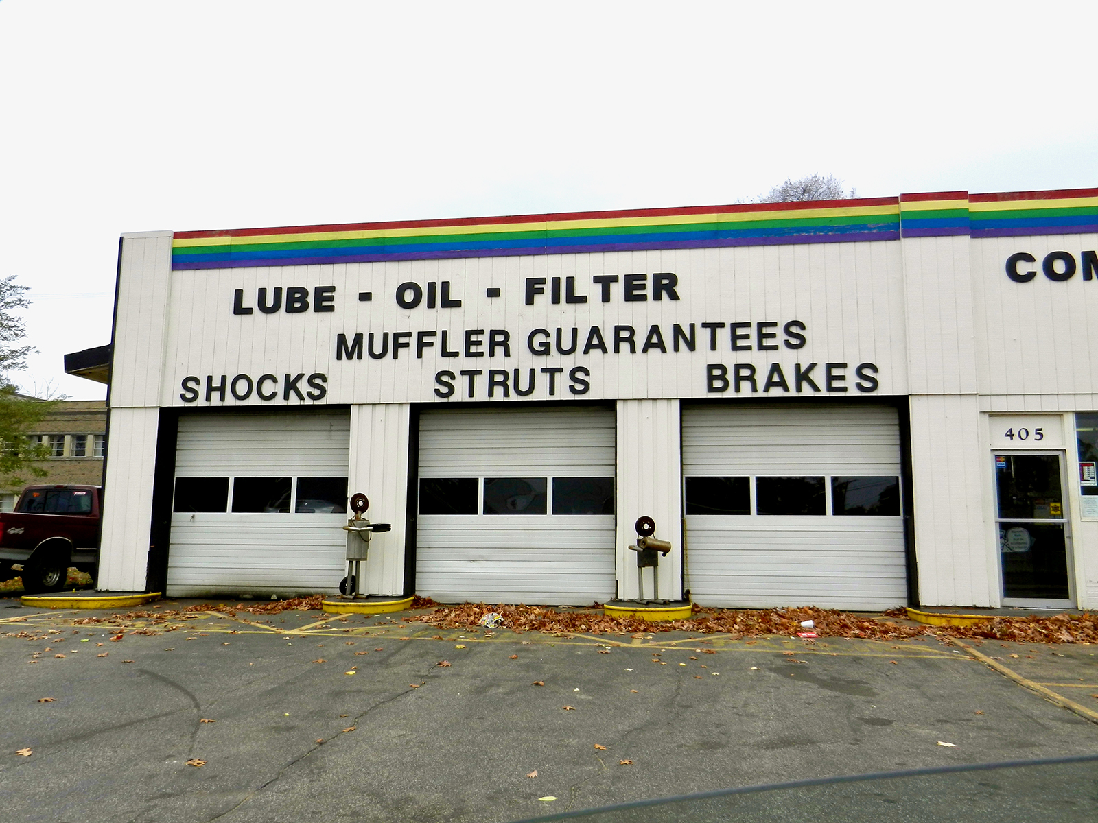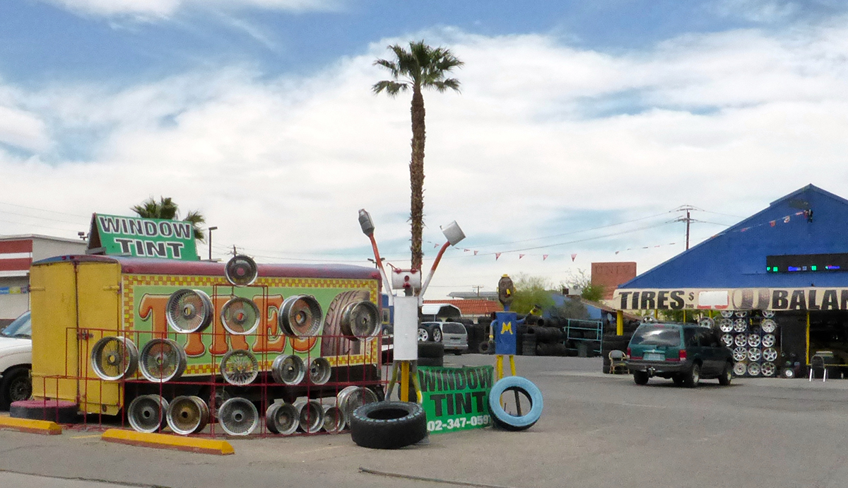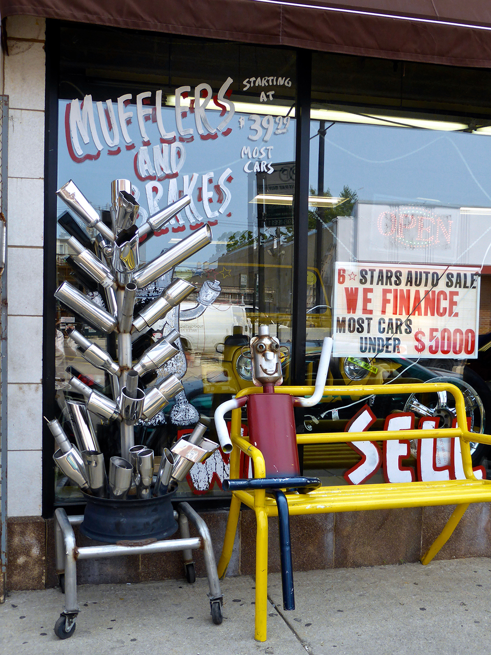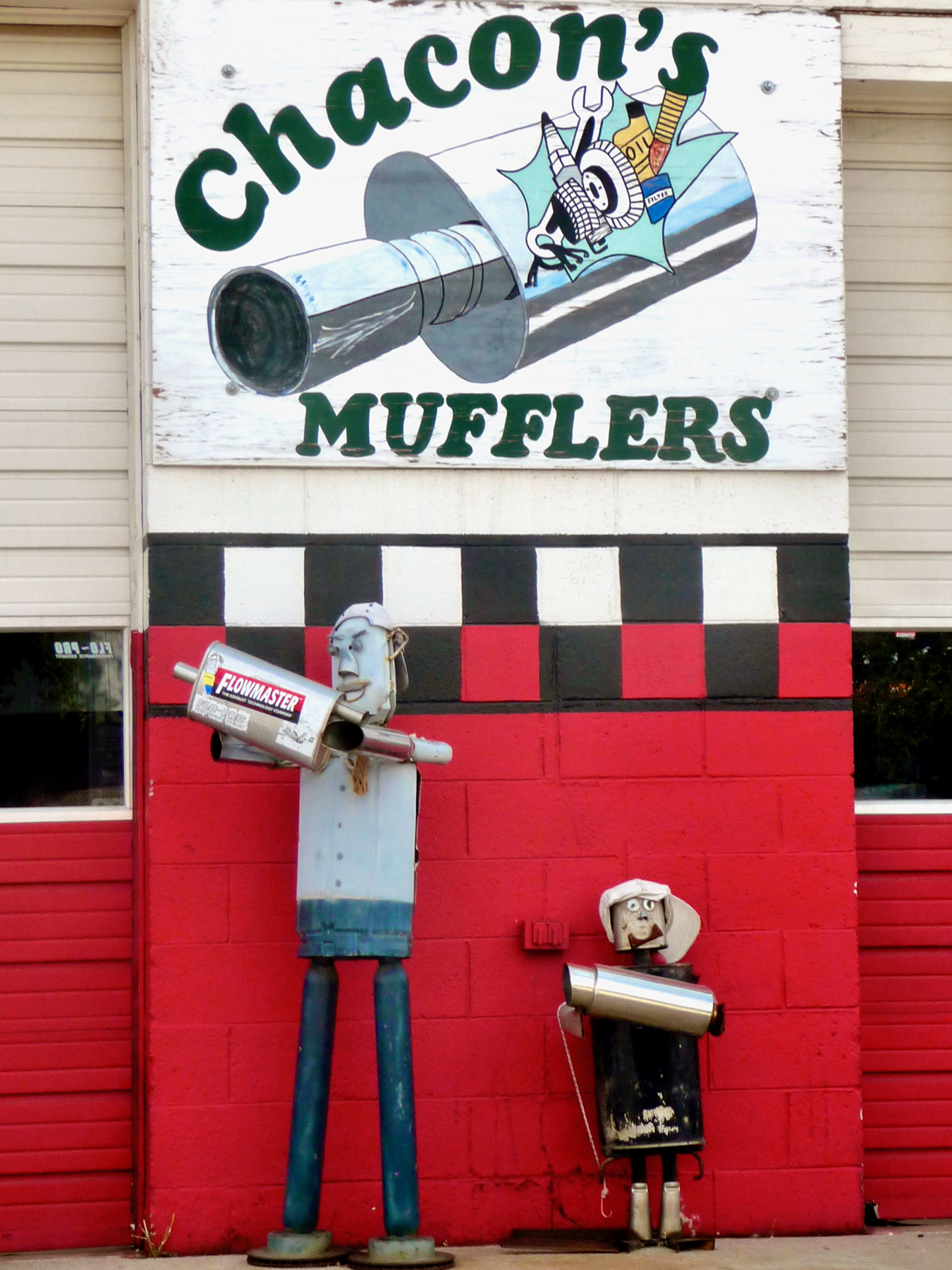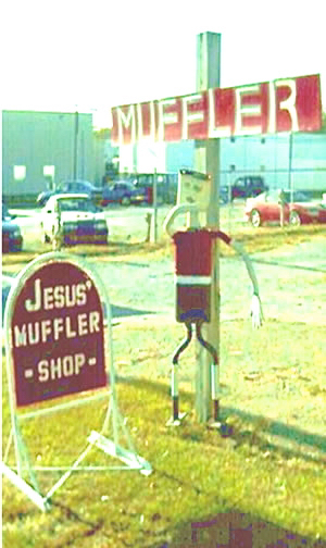 Mufflers don’t only inspire sculpture. Many of the same shops with muffler figures in front also demonstrate the artistic possibilities of auto parts in their 2D signs. Click here for some examples.