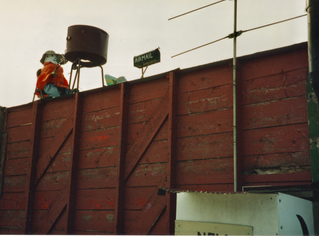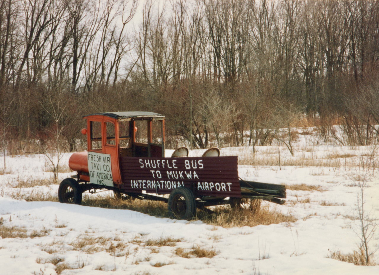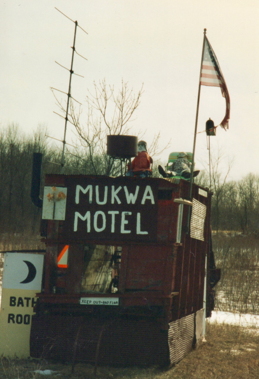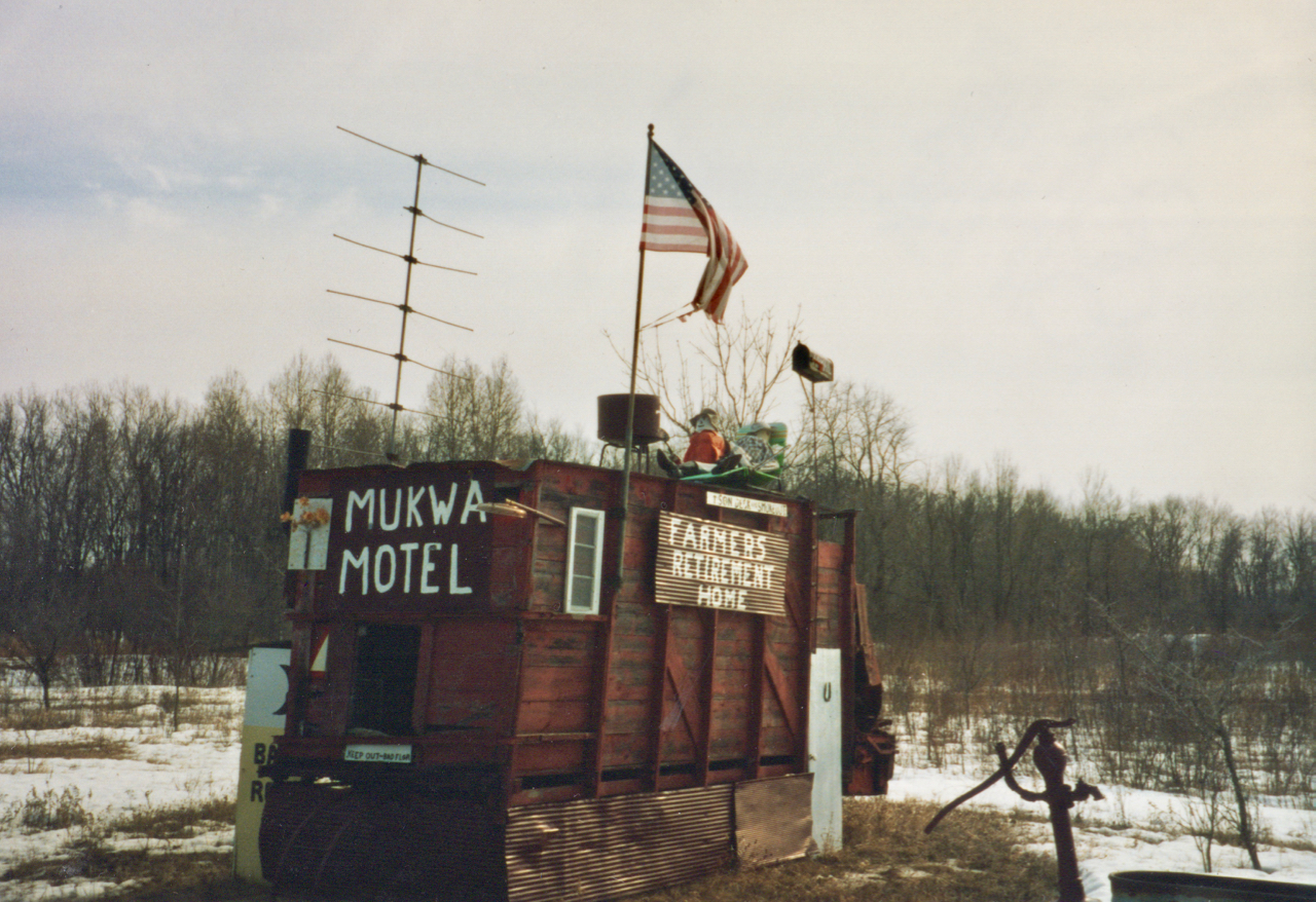 The Mukwa Motel/Farmers Retirement Home is a vernacular art environment on Wisconsin Highway 54 west of New London. It’s on the northern edge of the Mukwa State Wildlife Area and was photographed before 1995. An artful bit of rural humor built by farmer John Kraske shortly before his retirement.
