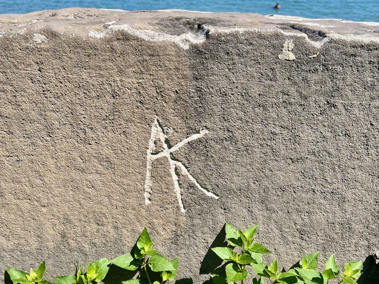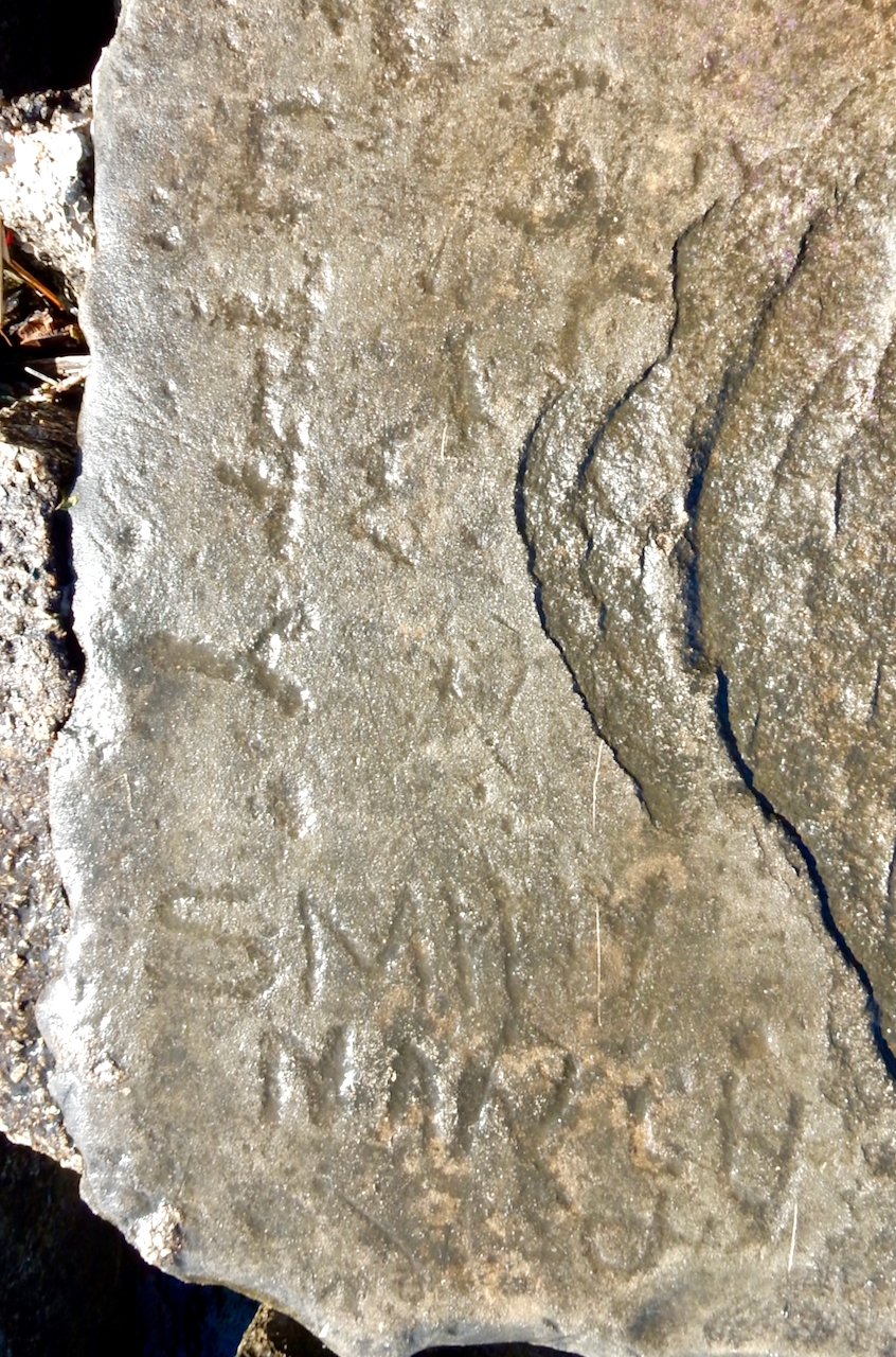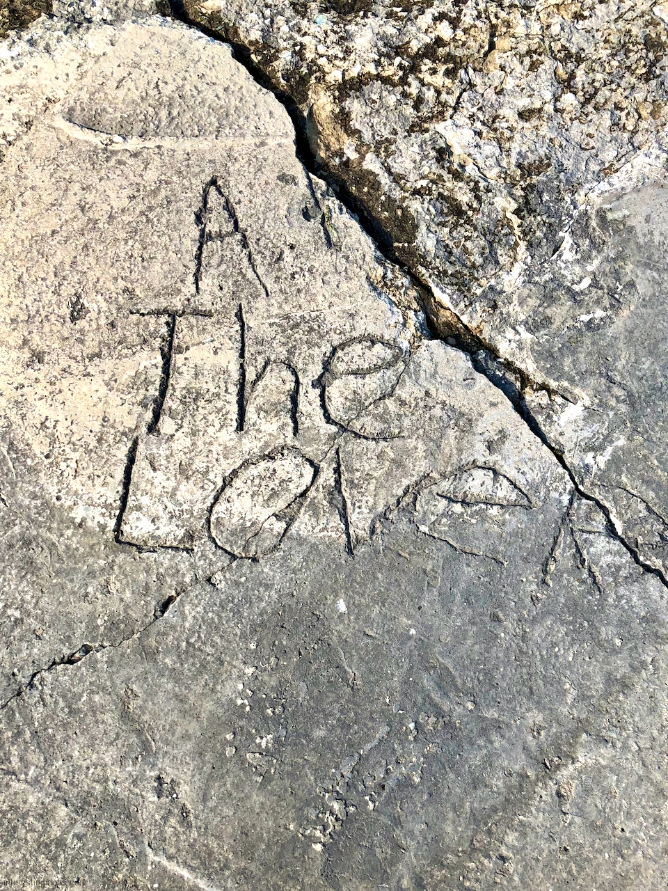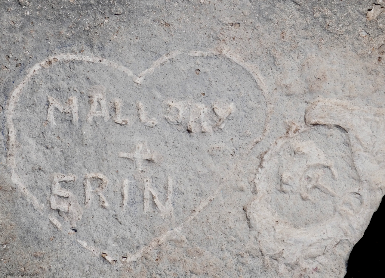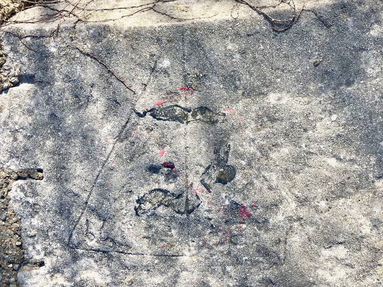 This PDF contains maps to help you find the most interesting carvings. If you do go on the hunt, please proceed with caution. There are many gaps, holes, even chasms in the old revetments; keep your eyes open. There also are many more carvings than the maps show, so be sure to keep eyes open for them as well.