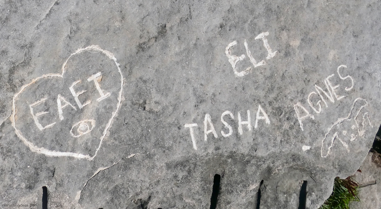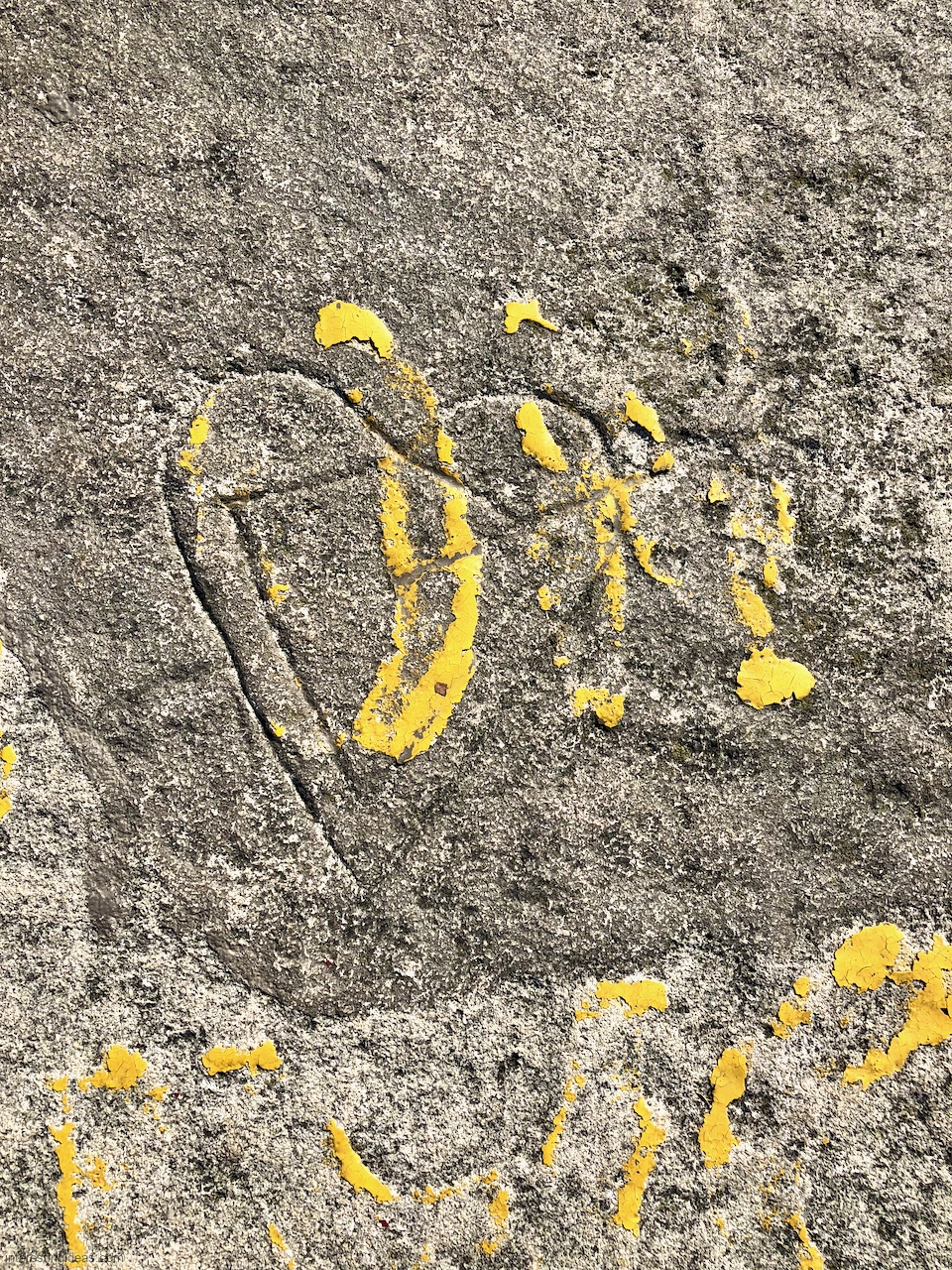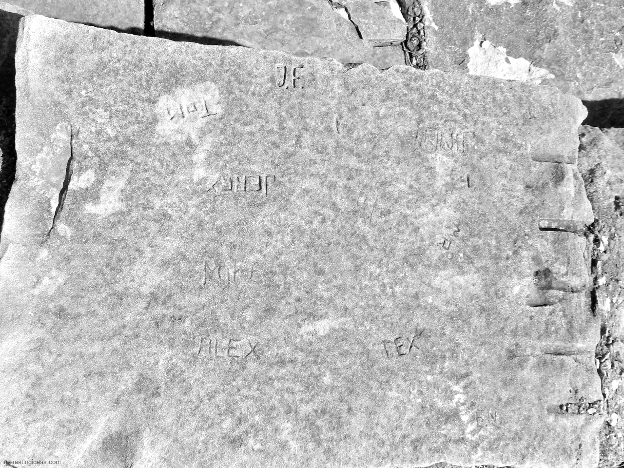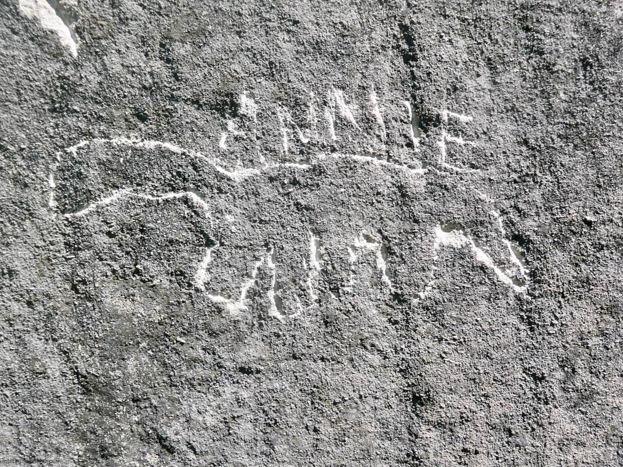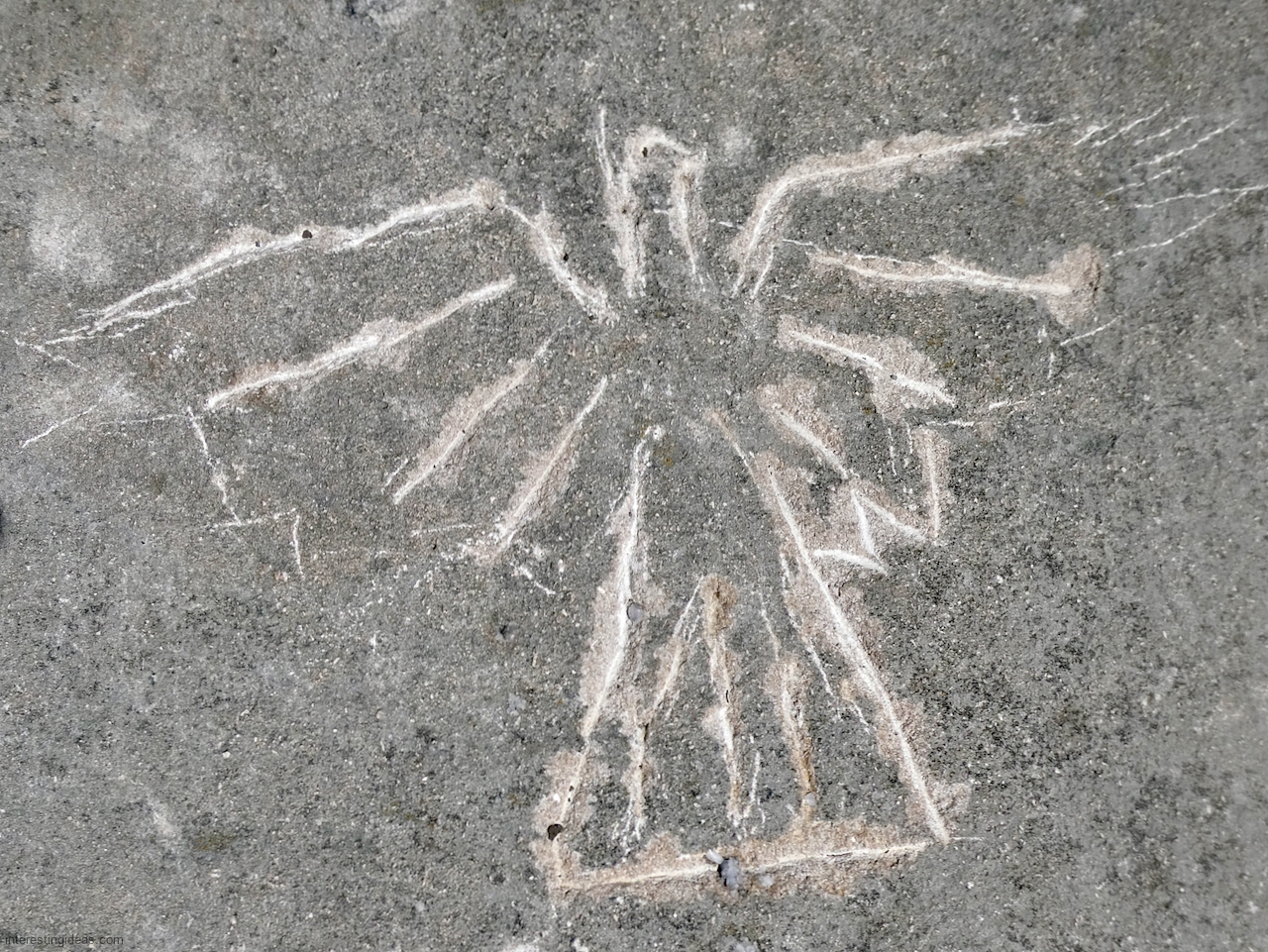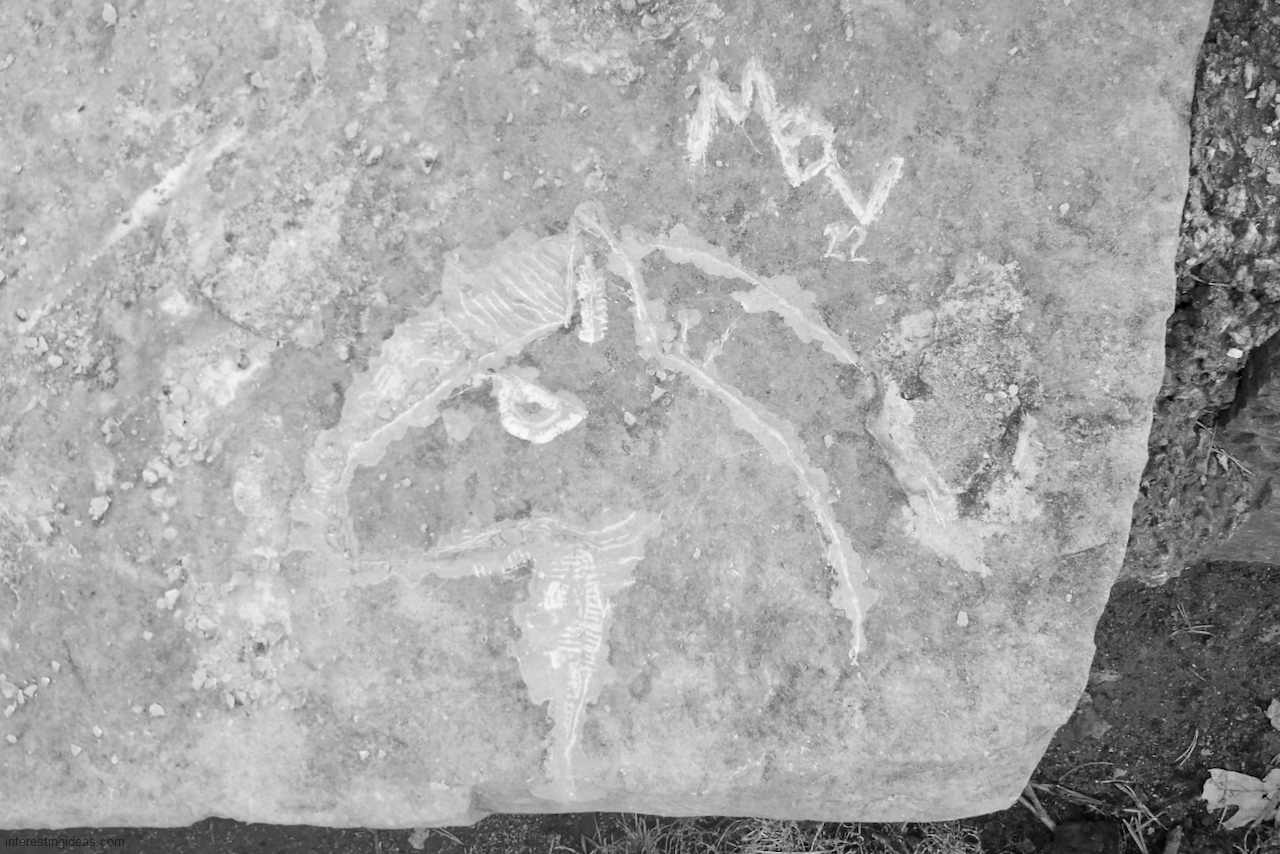 This PDF contains maps to help you find the most interesting carvings. If you do go on the hunt, please proceed with caution. There are many gaps, holes, even chasms in the old revetments; keep your eyes open. There also are many more carvings than the maps show, so be sure to keep eyes open for them as well.