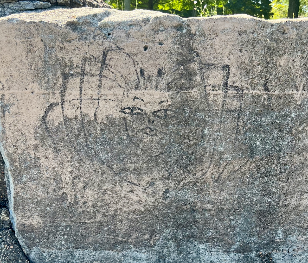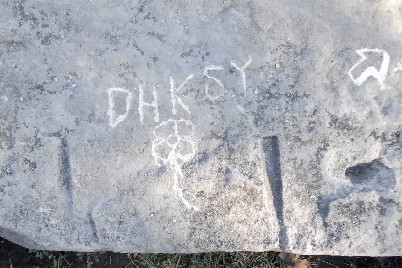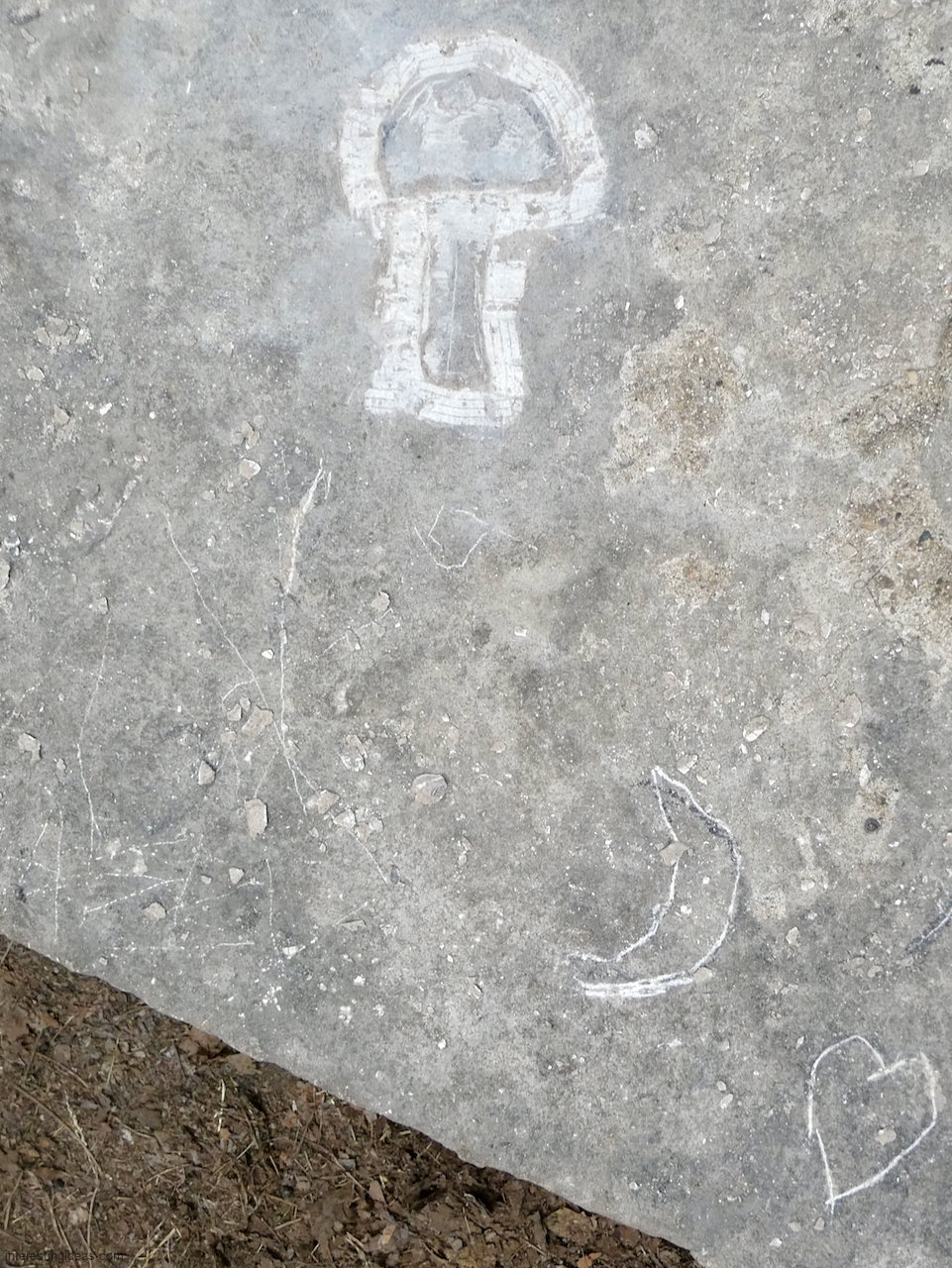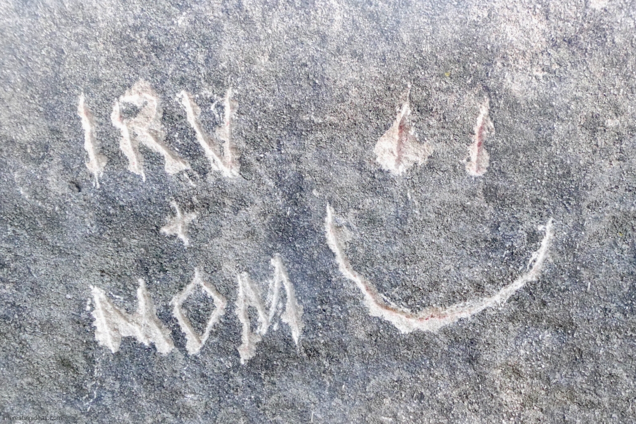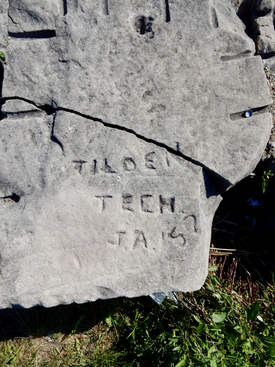 This PDF contains maps to help you find the most interesting carvings. If you do go on the hunt, please proceed with caution. There are many gaps, holes, even chasms in the old revetments; keep your eyes open. There also are many more carvings than the maps show, so be sure to keep eyes open for them as well.