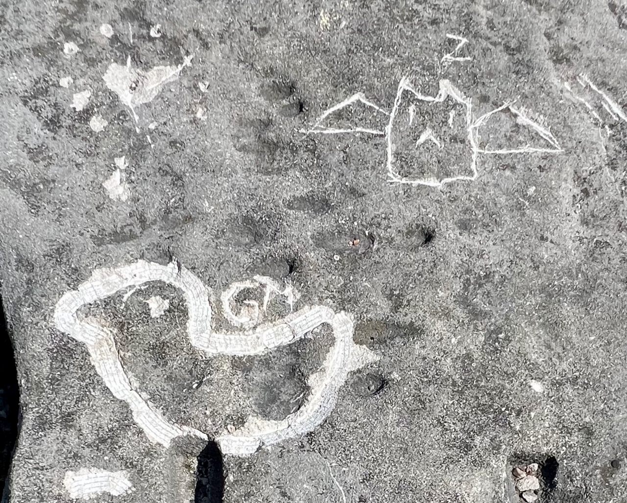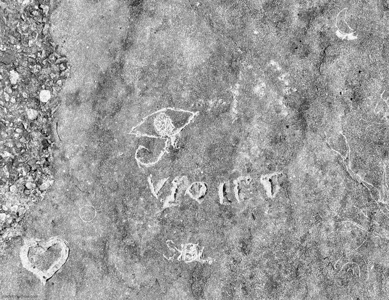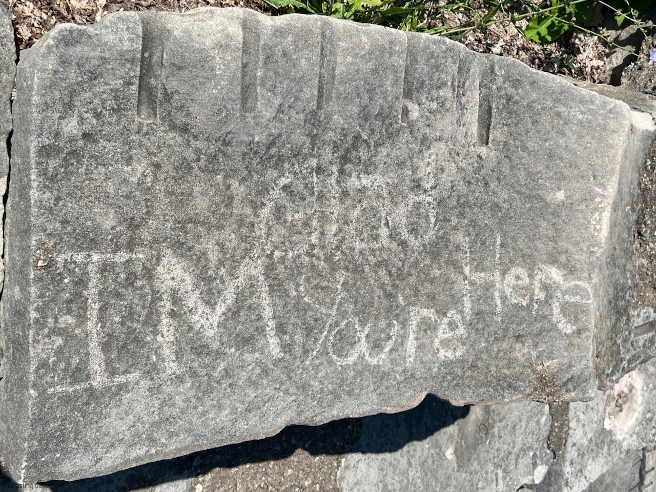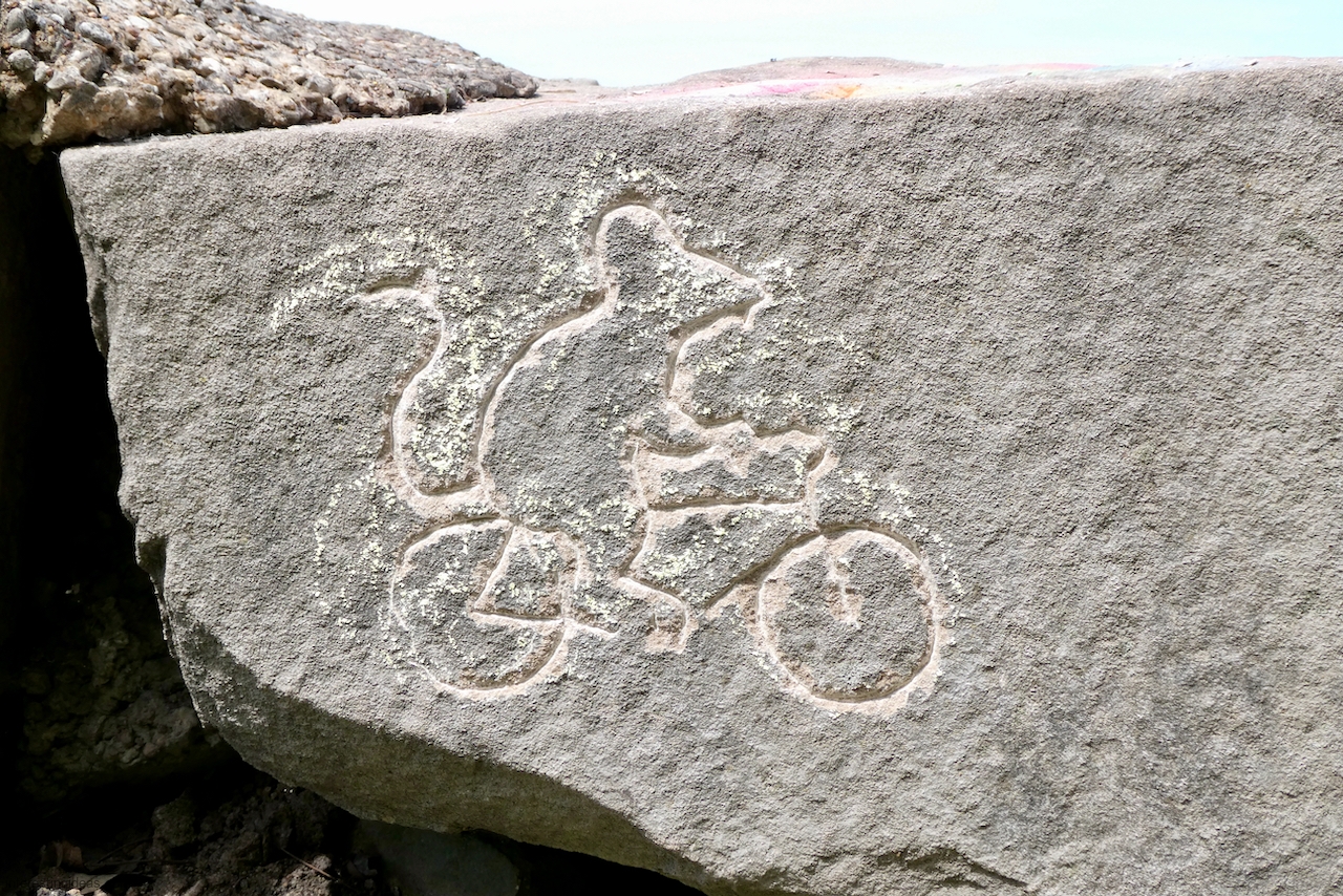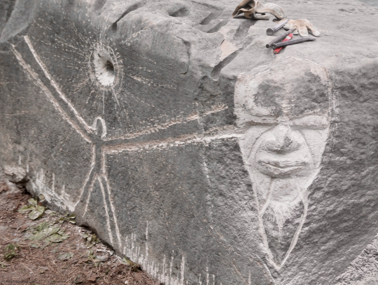 This PDF contains maps to help you find the most interesting carvings. If you do go on the hunt, please proceed with caution. There are many gaps, holes, even chasms in the old revetments; keep your eyes open. There also are many more carvings than the maps show, so be sure to keep eyes open for them as well.