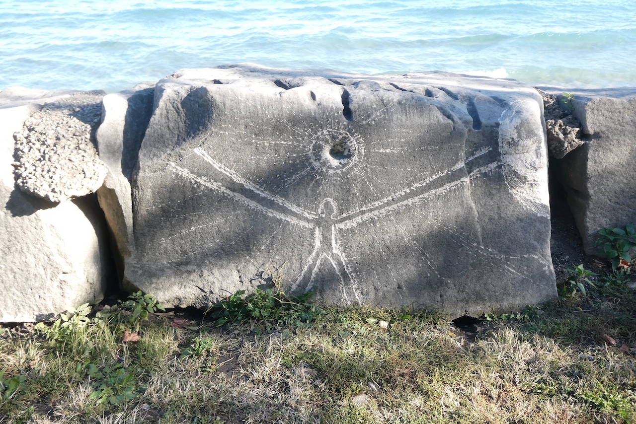 (Those revetments and the carvings they host are under threat from possible lakeshore protection measures. For more information on that issue, please visit the Promontory Point Conservancy.)