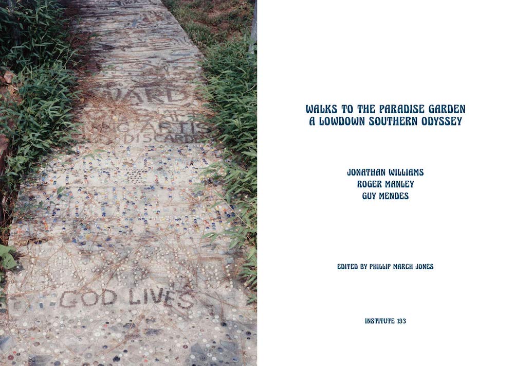 Walks to the Paradise Garden: A Lowdown Southern Odyssey, by Jonathan Williams, photos by Roger Manley & Guy Mendes. Institute 193, Lexington Kentucky and New York, 352 pages, 100 color images and 80 black and white , 2019. ISBN: 978-1732848207. Hardcover, $45.
