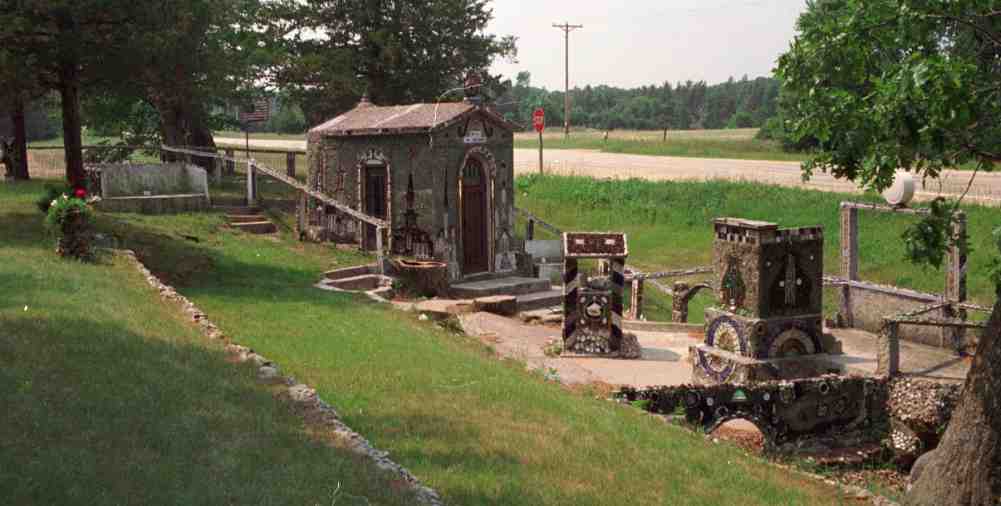 The Wegners followed with an ensemble of creations on their Cataract, Wis., property, including the chapel at right above and left below, on whose outer walls they memorialized other great places of worship, along with the religions that built them