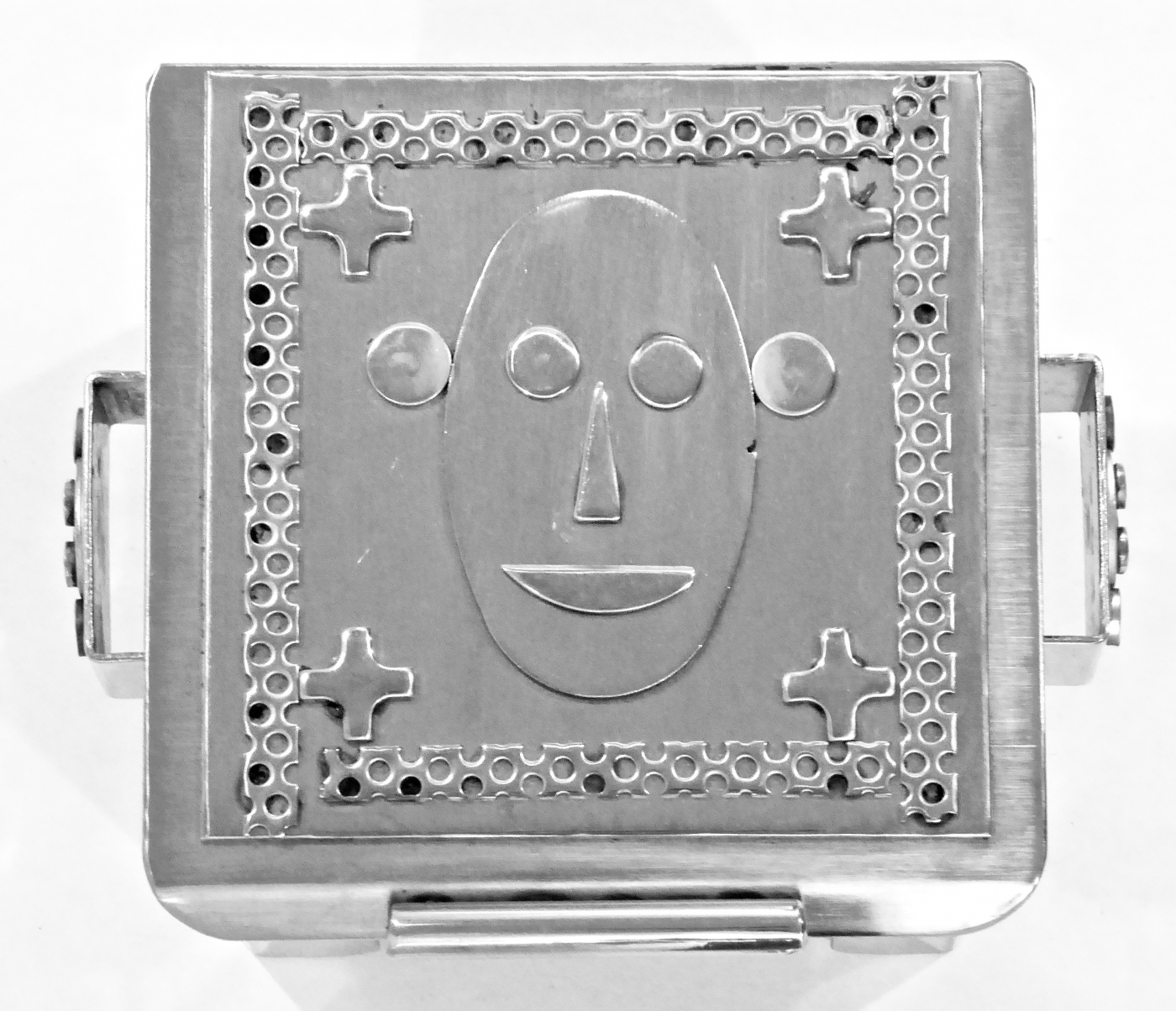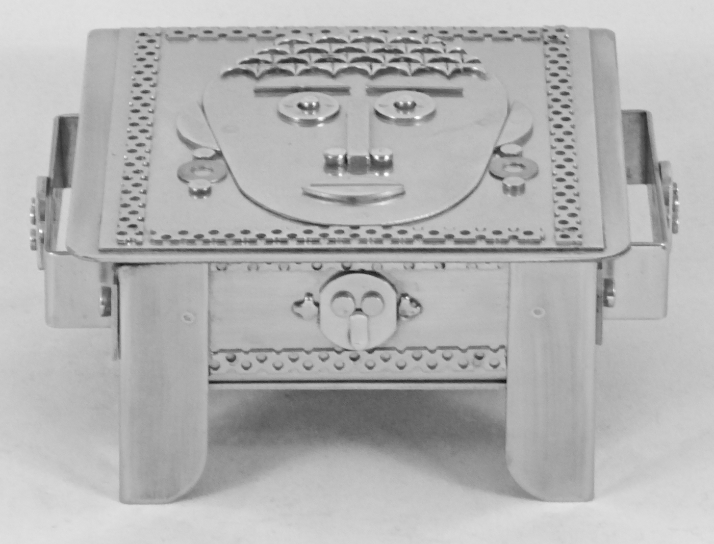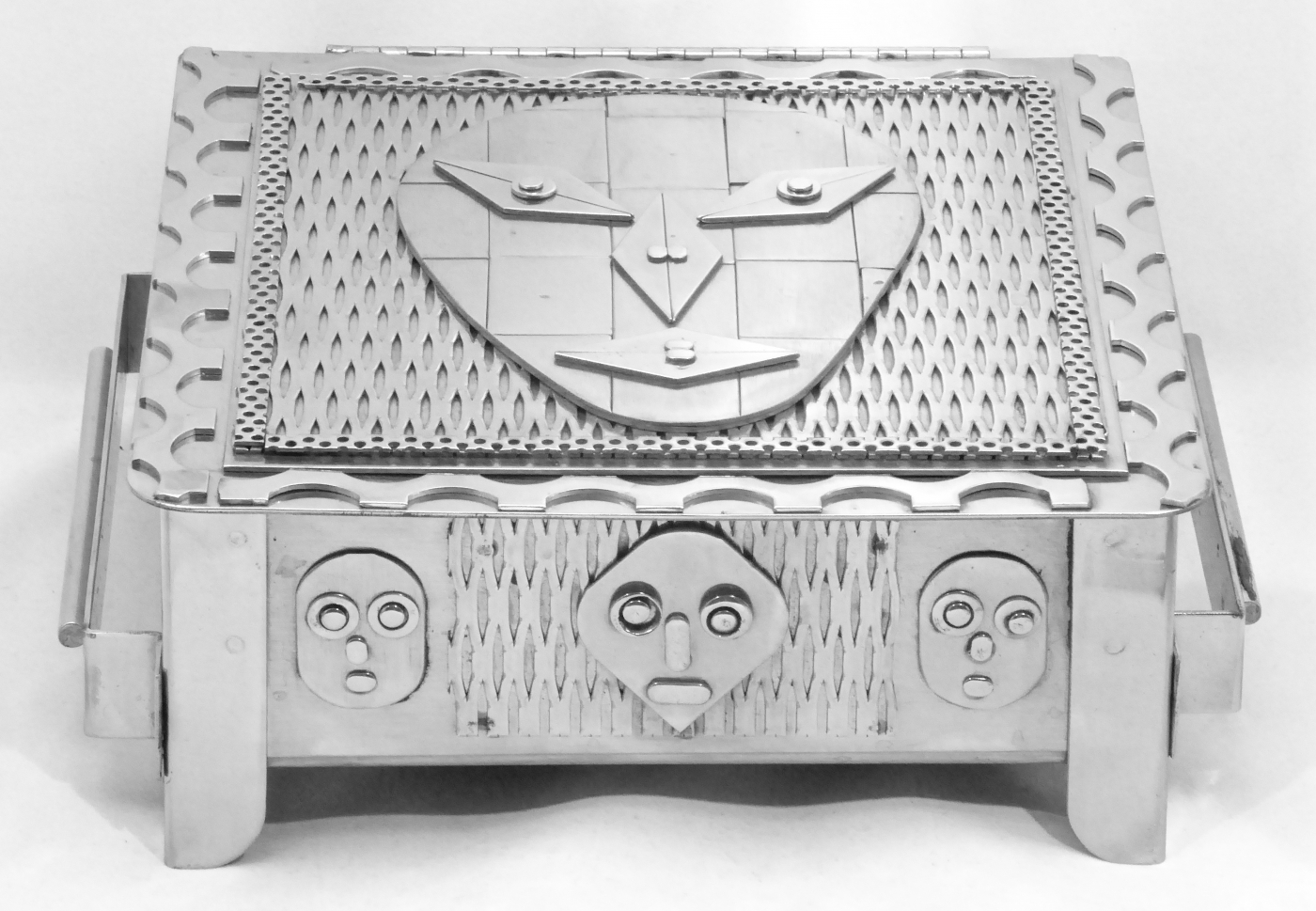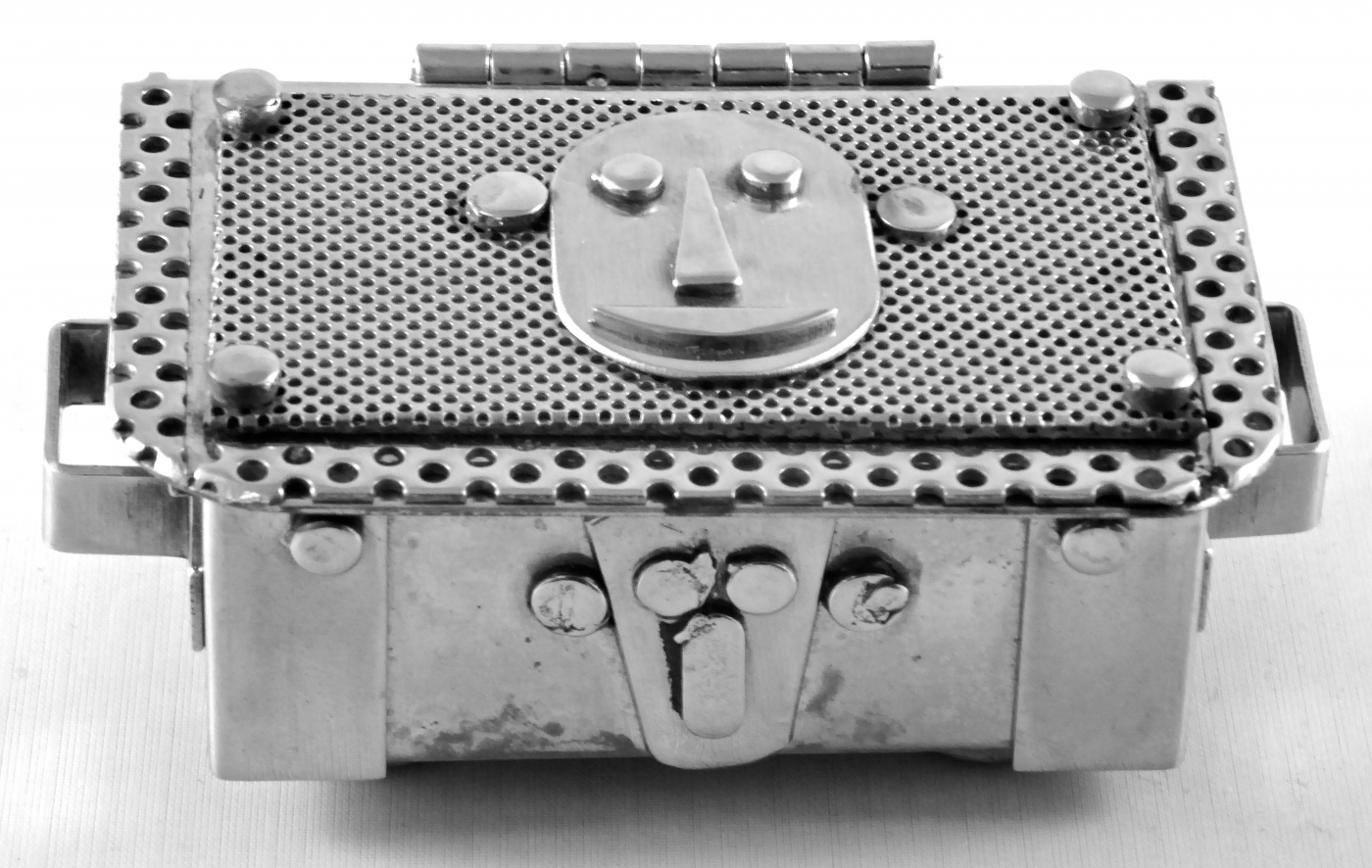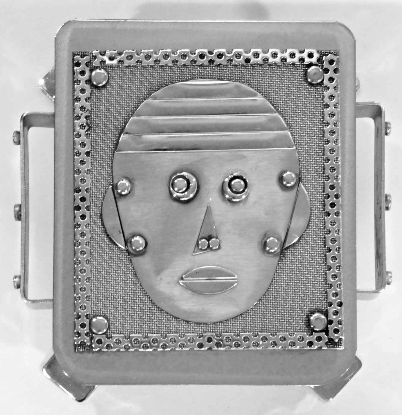 Stanley Szwarc’s most typical creations are marvels of decoration, stainless steel boxes lathered in abstract ornamentation. But he also applied his geometric talent to creating faces, some ominous, some cartoony, some robotic, and some quite dressy. When the book keeper turned metal worker took up representational imagery, his imagination was stunning.