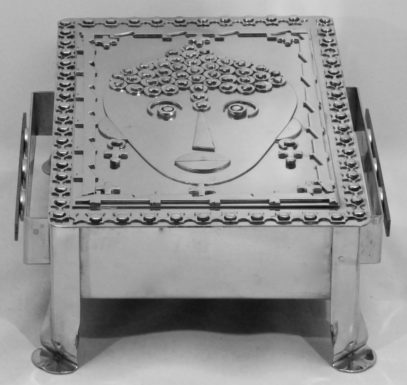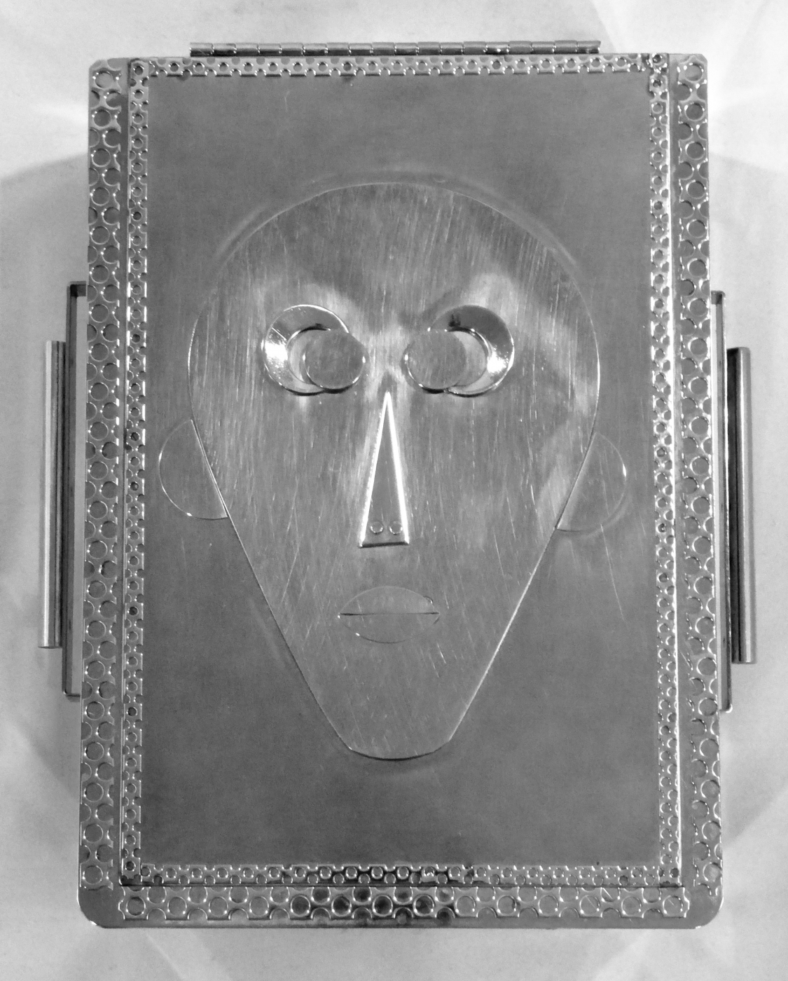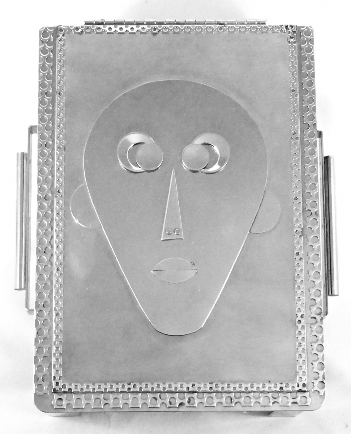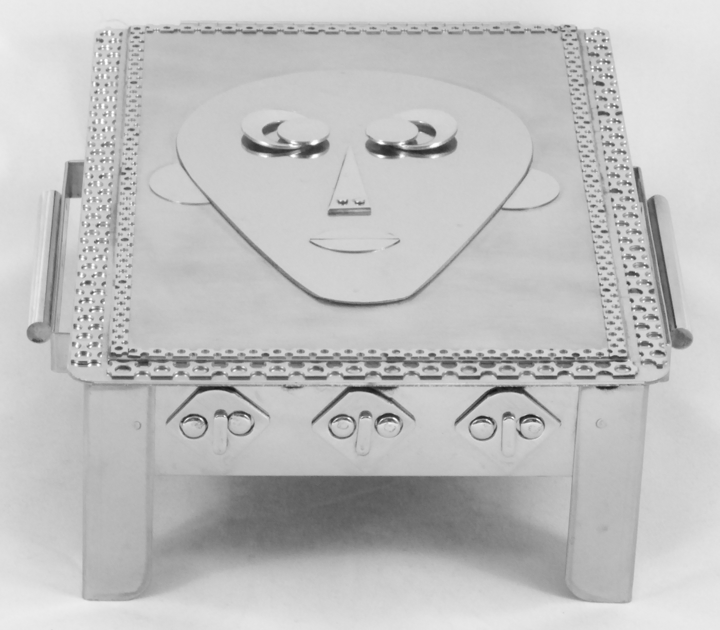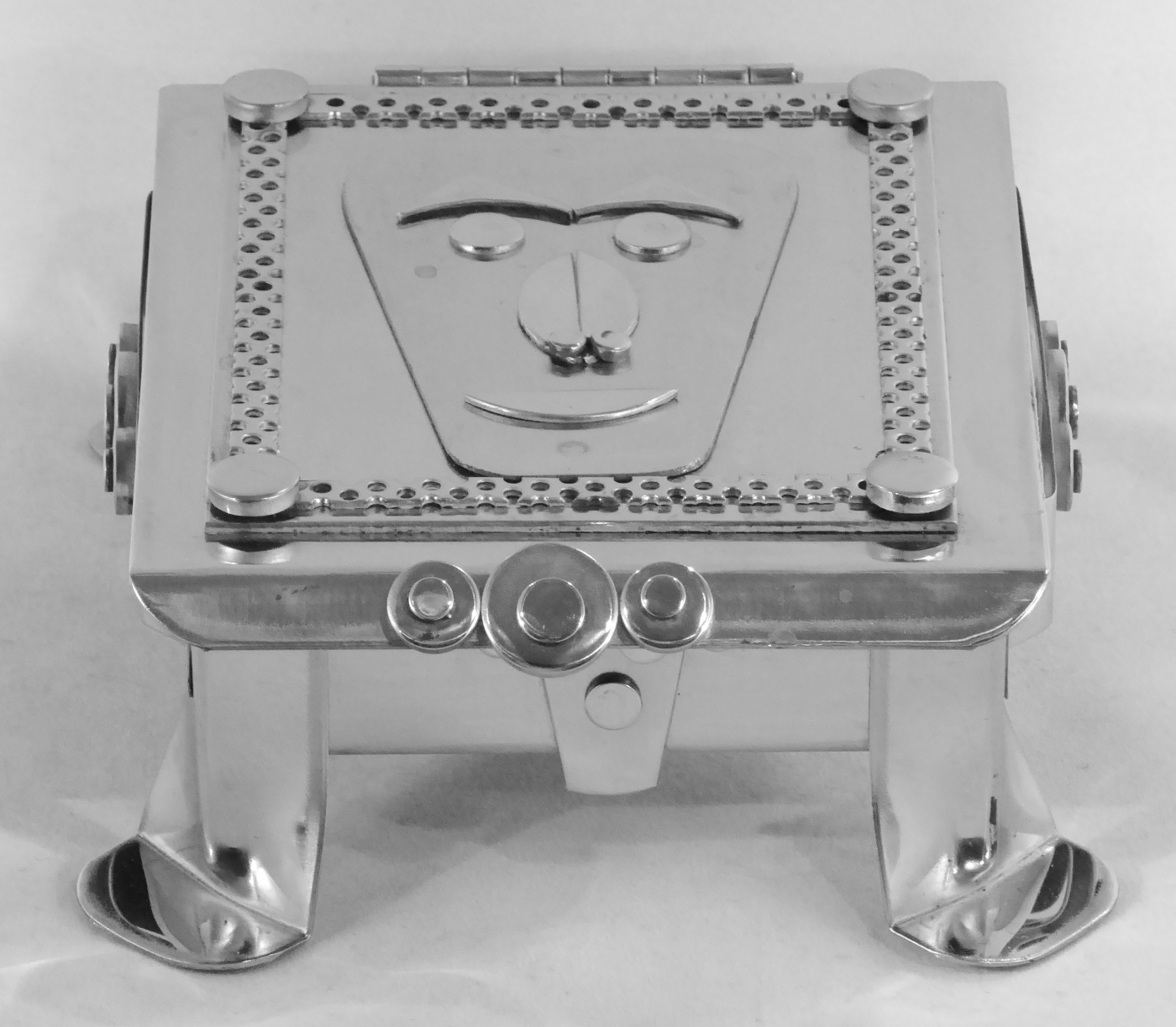 Stanley Szwarc’s most typical creations are marvels of decoration, stainless steel boxes lathered in abstract ornamentation. But he also applied his geometric talent to creating faces, some ominous, some cartoony, some robotic, and some quite dressy. When the book keeper turned metal worker took up representational imagery, his imagination was stunning.