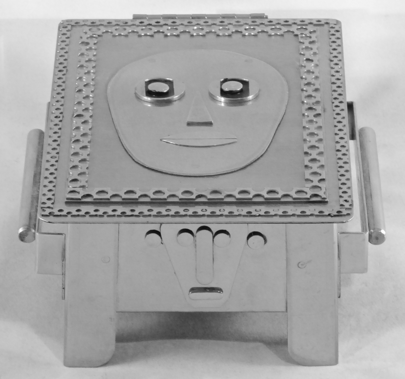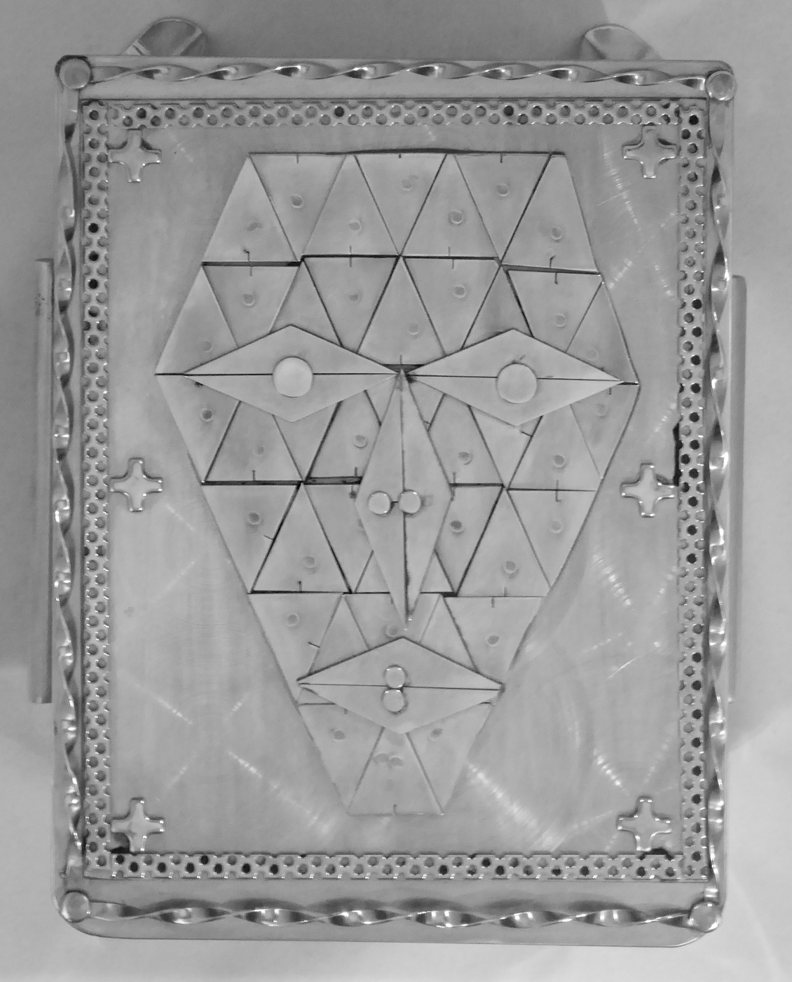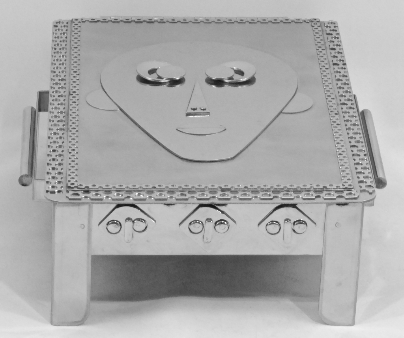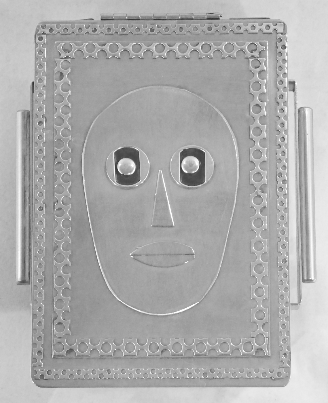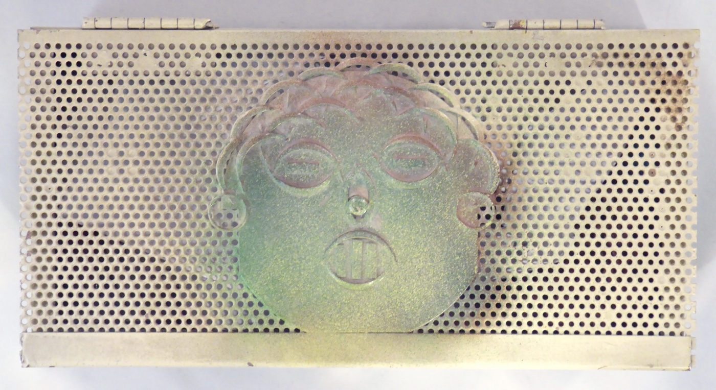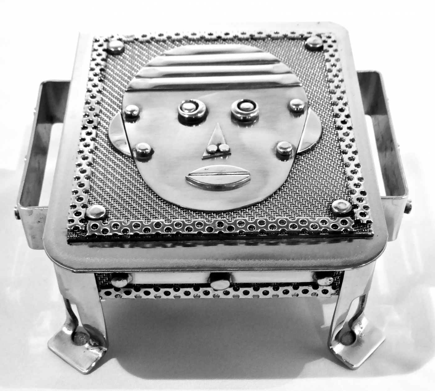 Stanley Szwarc’s most typical creations are marvels of decoration, stainless steel boxes lathered in abstract ornamentation. But he also applied his geometric talent to creating faces, some ominous, some cartoony, some robotic, and some quite dressy. When the book keeper turned metal worker took up representational imagery, his imagination was stunning.