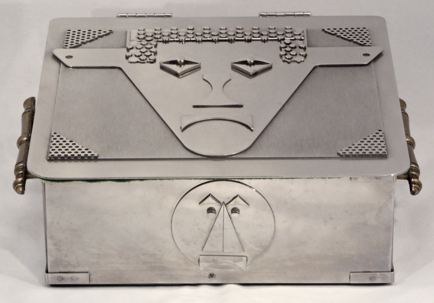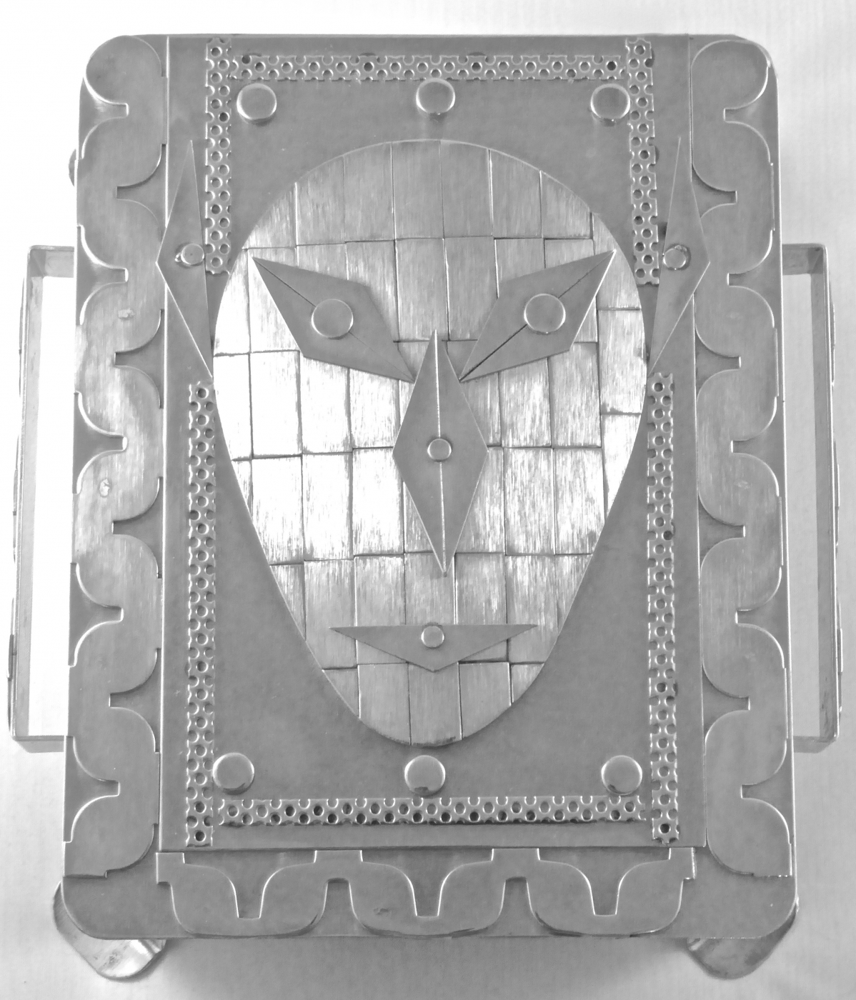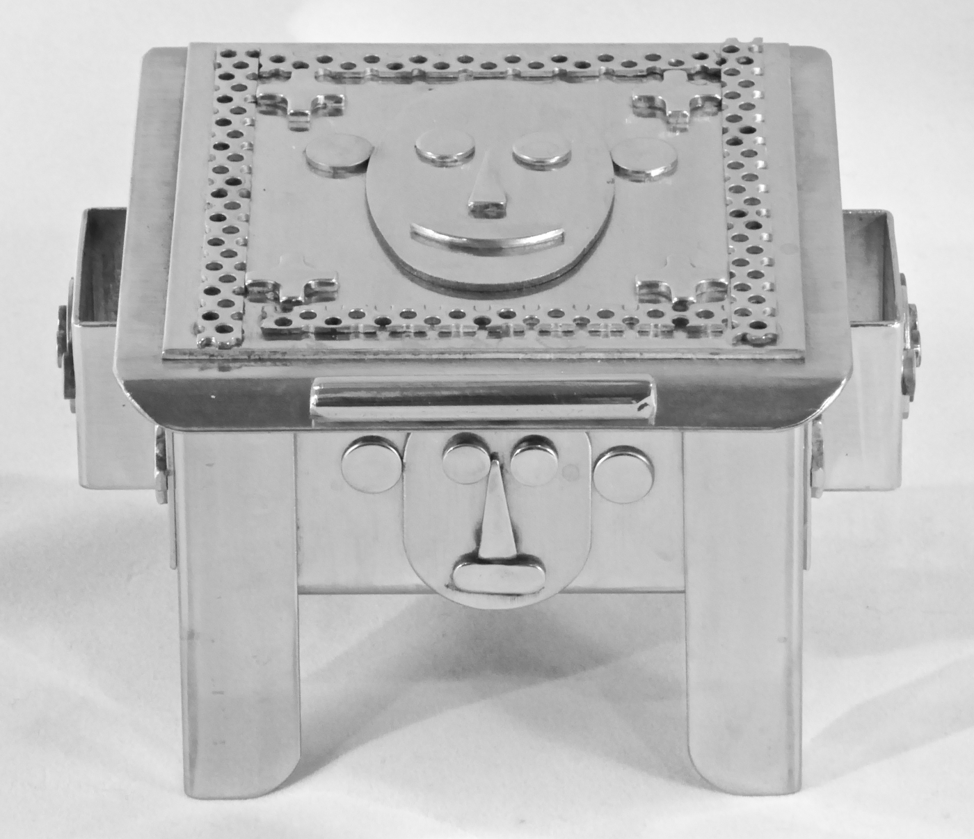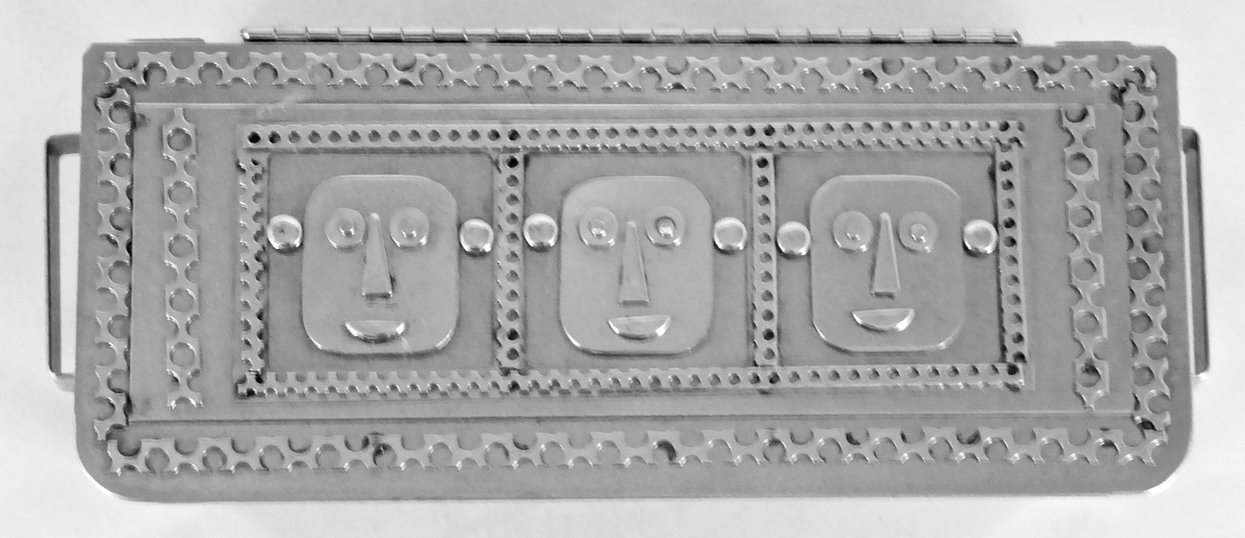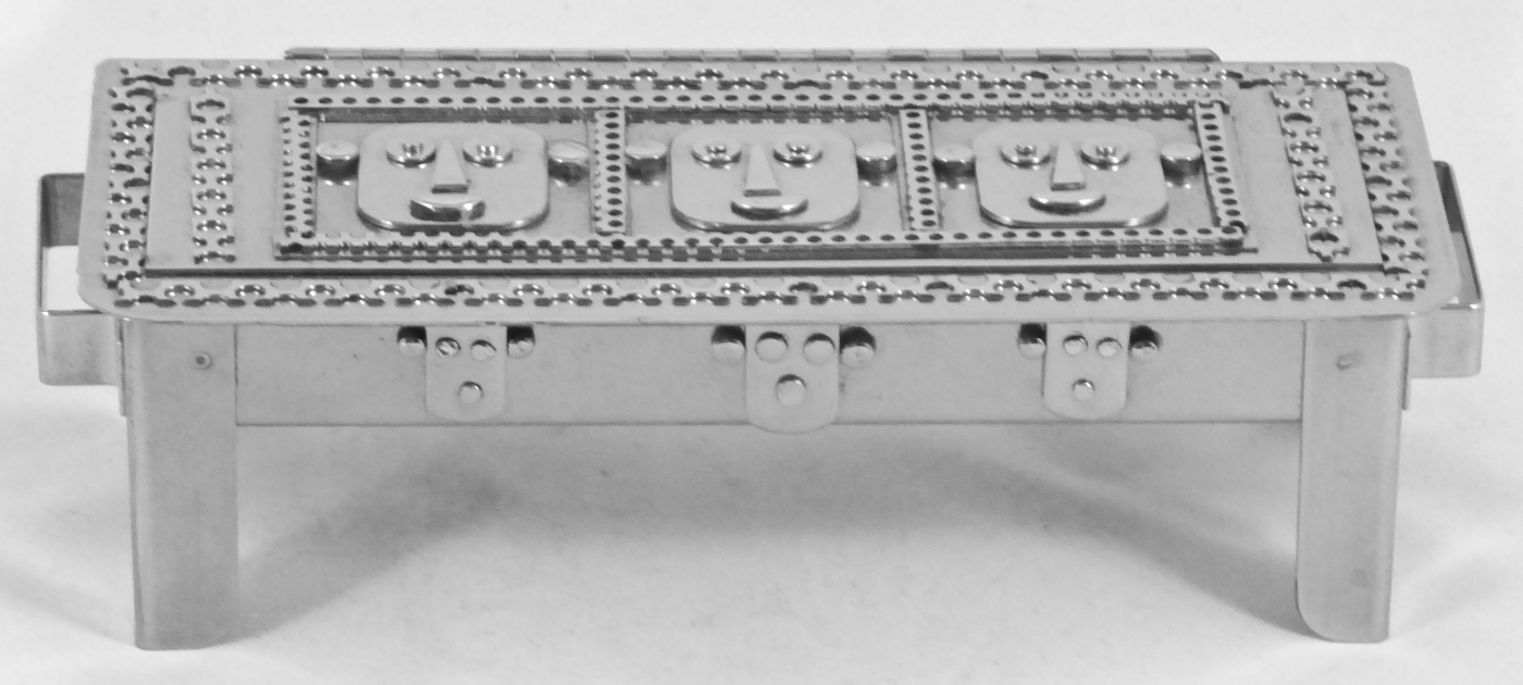 Stanley Szwarc’s most typical creations are marvels of decoration, stainless steel boxes lathered in abstract ornamentation. But he also applied his geometric talent to creating faces, some ominous, some cartoony, some robotic, and some quite dressy. When the book keeper turned metal worker took up representational imagery, his imagination was stunning.