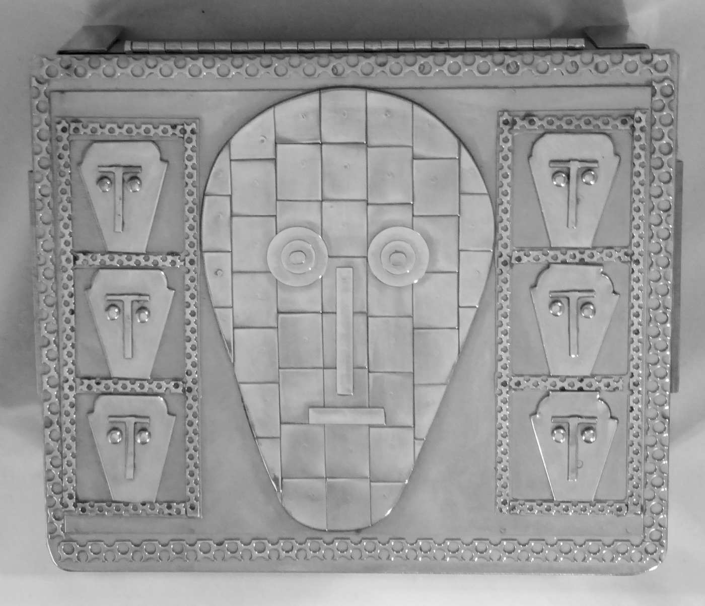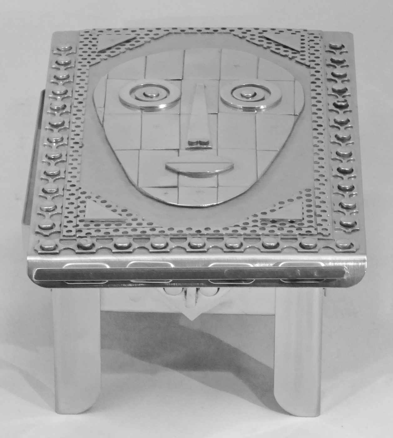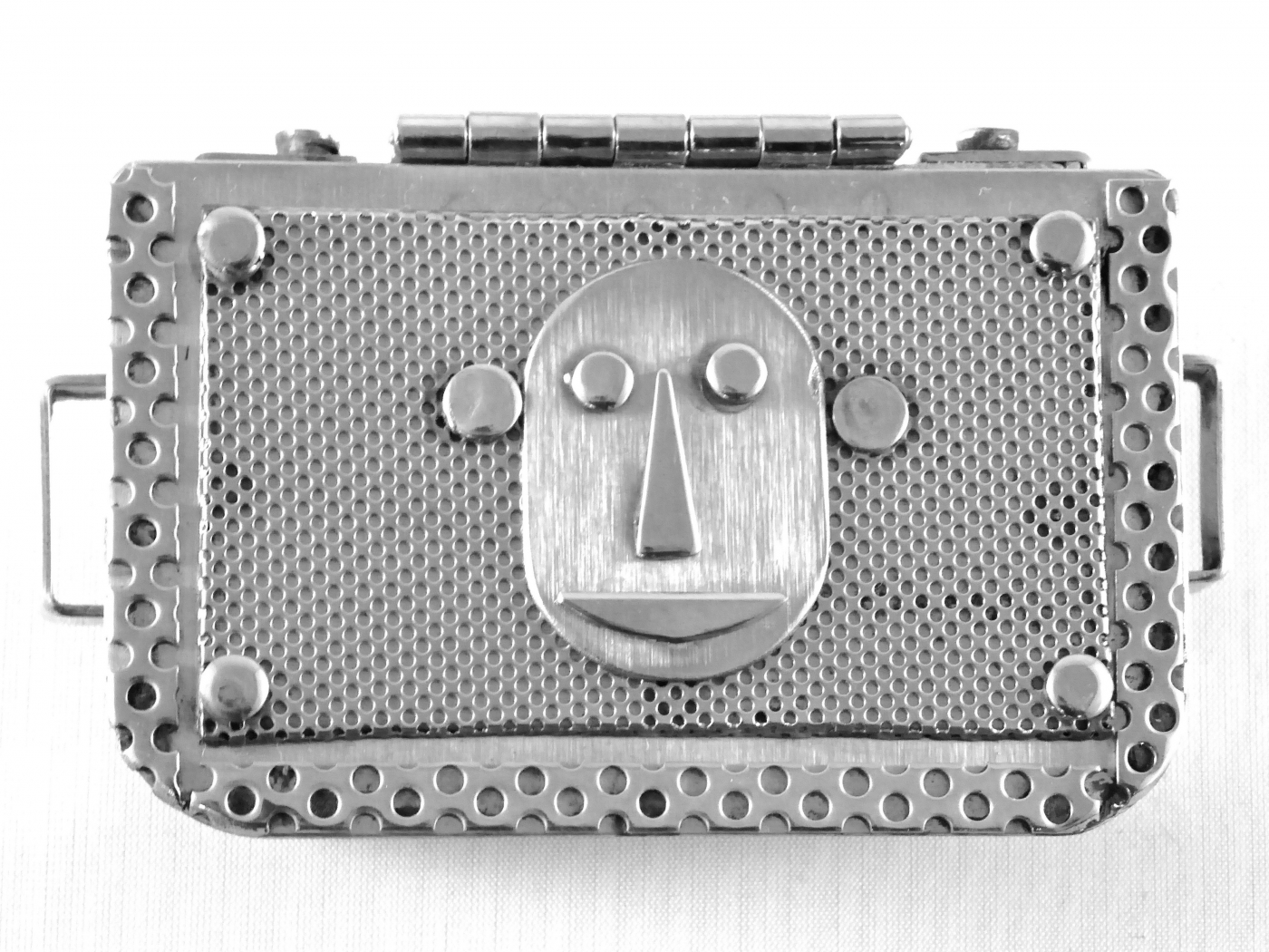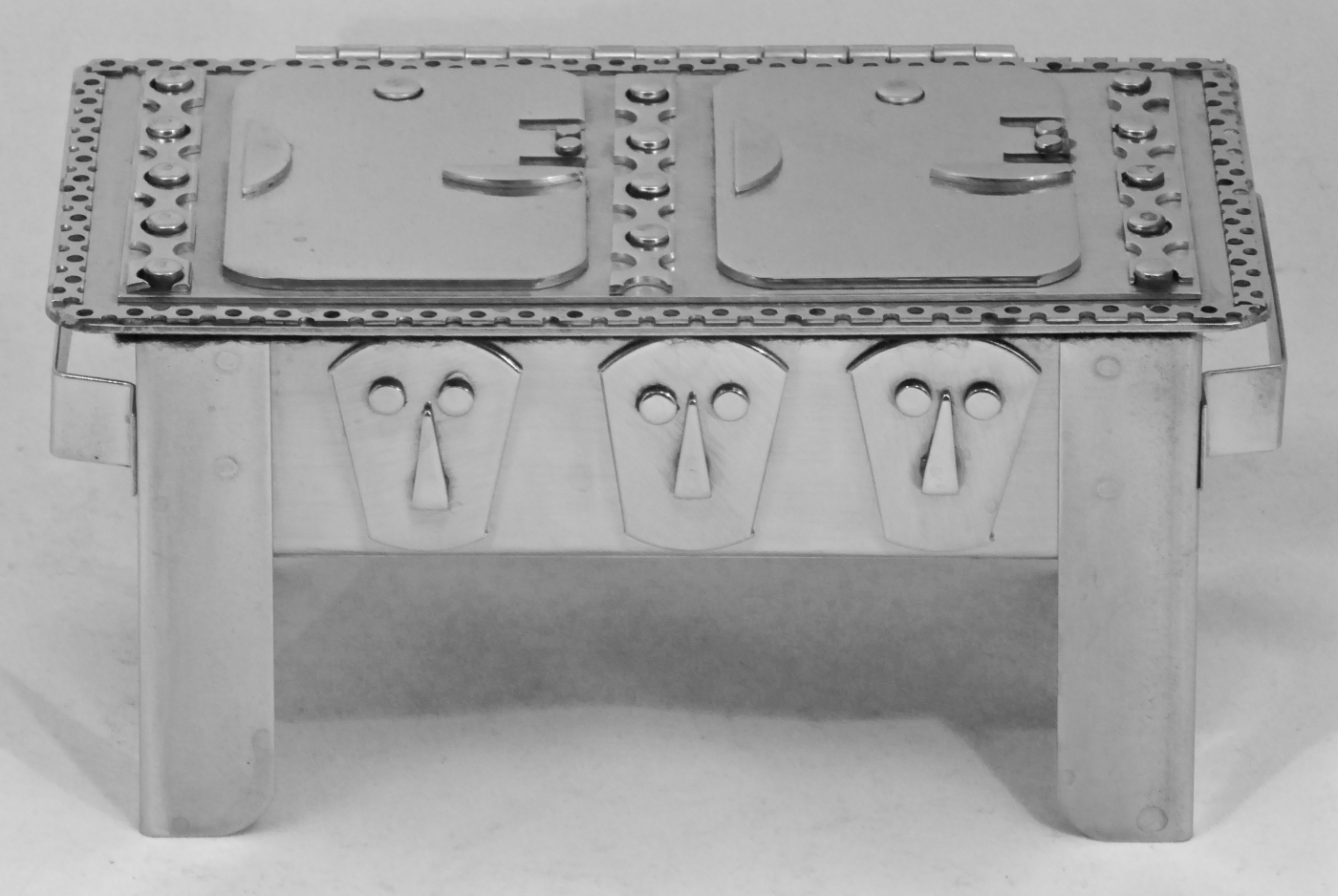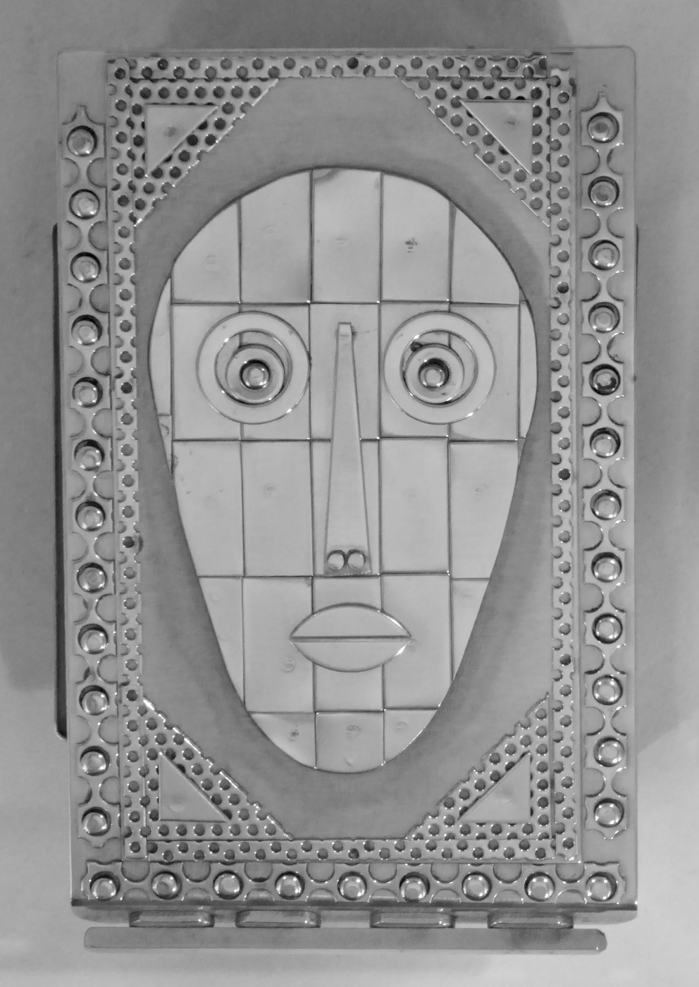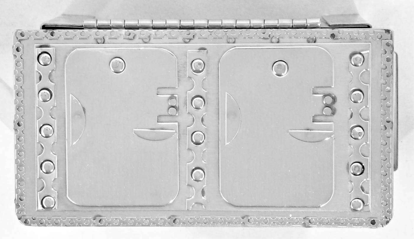 Stanley Szwarc’s most typical creations are marvels of decoration, stainless steel boxes lathered in abstract ornamentation. But he also applied his geometric talent to creating faces, some ominous, some cartoony, some robotic, and some quite dressy. When the book keeper turned metal worker took up representational imagery, his imagination was stunning.