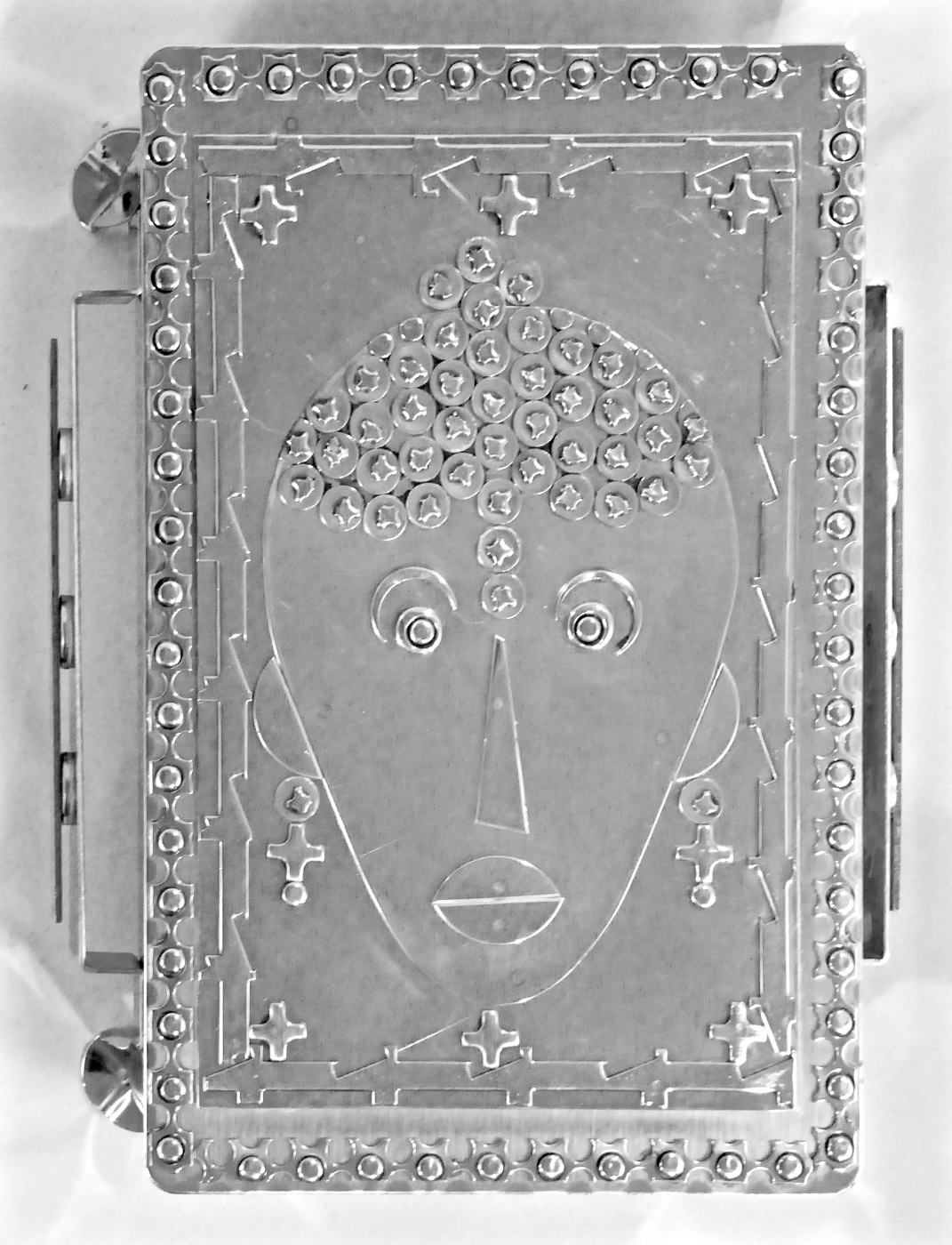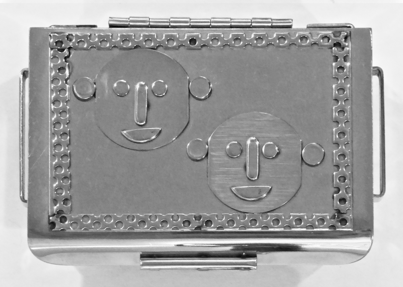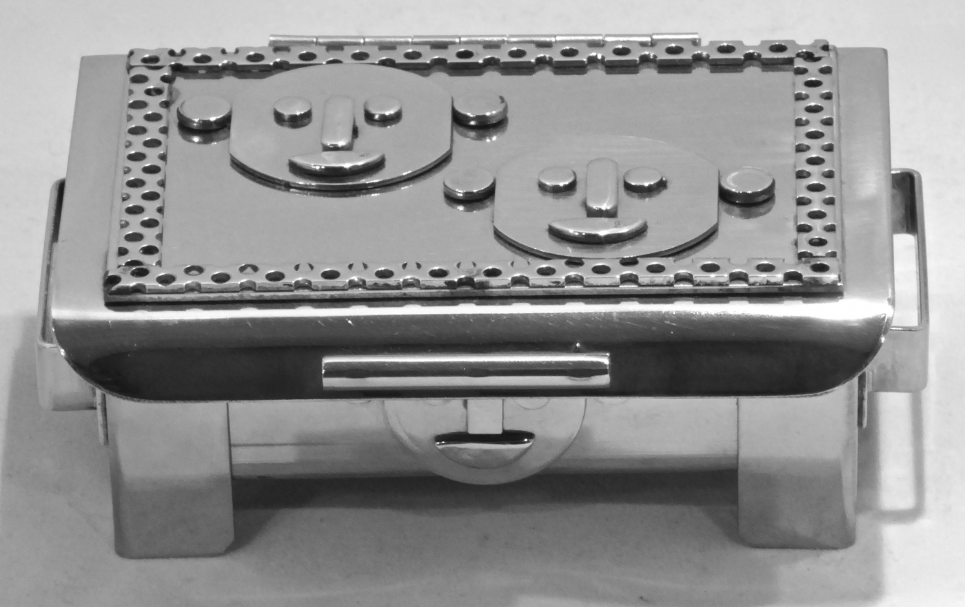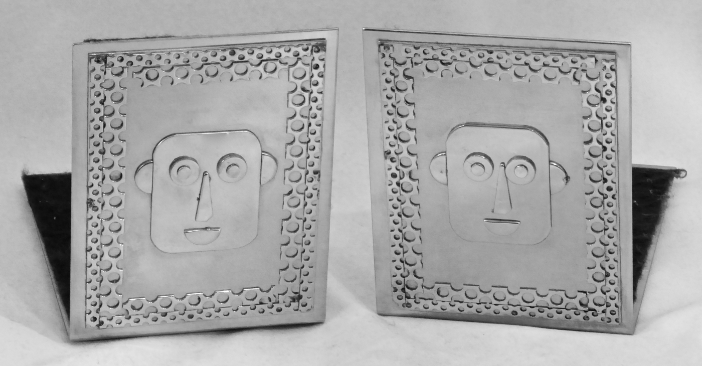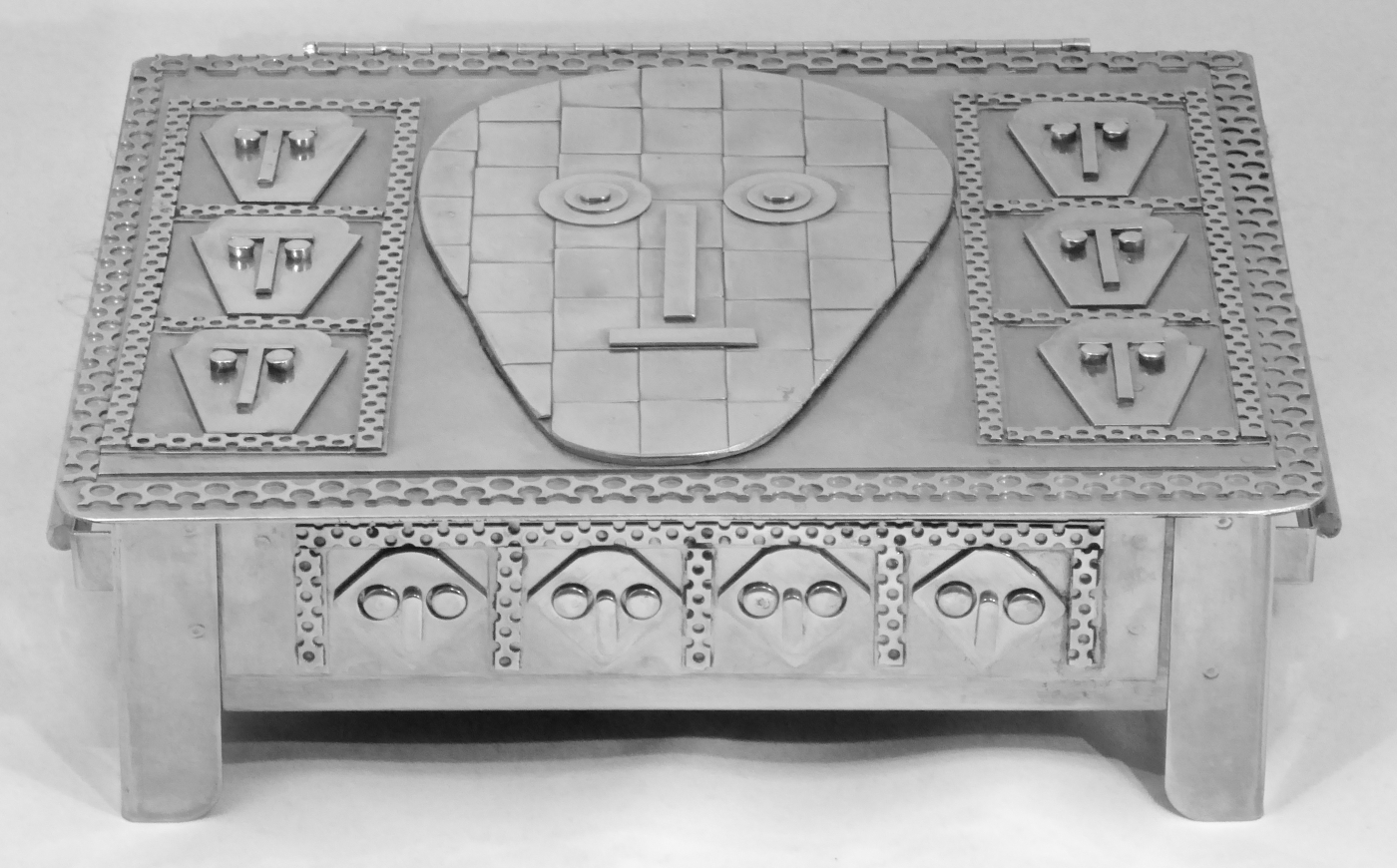 Stanley Szwarc’s most typical creations are marvels of decoration, stainless steel boxes lathered in abstract ornamentation. But he also applied his geometric talent to creating faces, some ominous, some cartoony, some robotic, and some quite dressy. When the book keeper turned metal worker took up representational imagery, his imagination was stunning.
