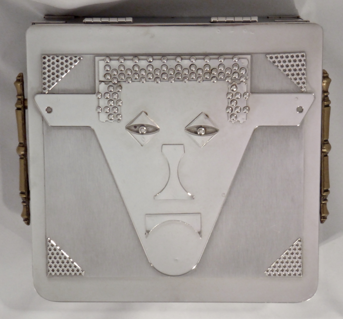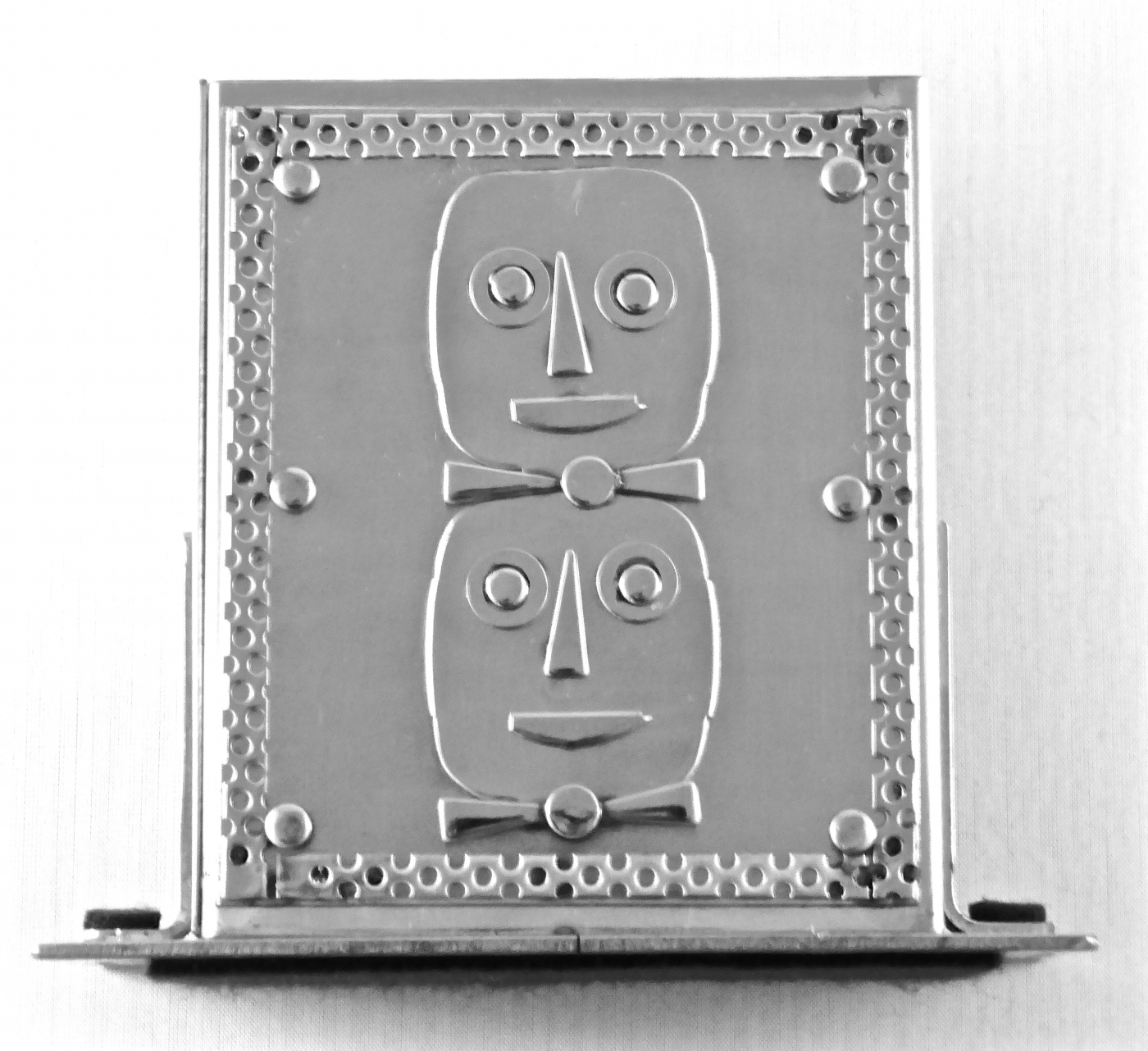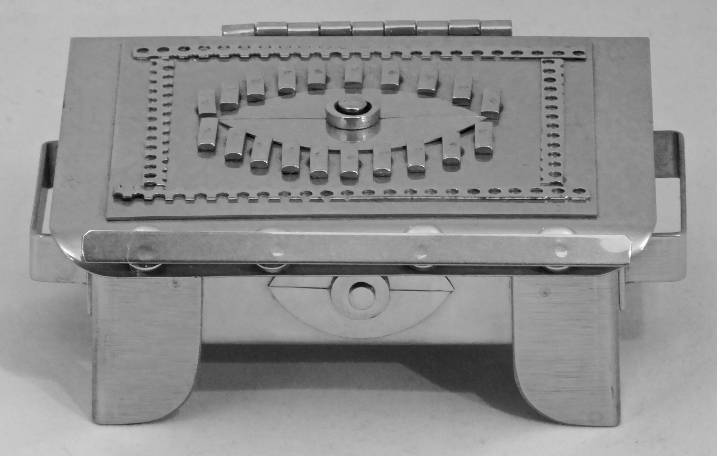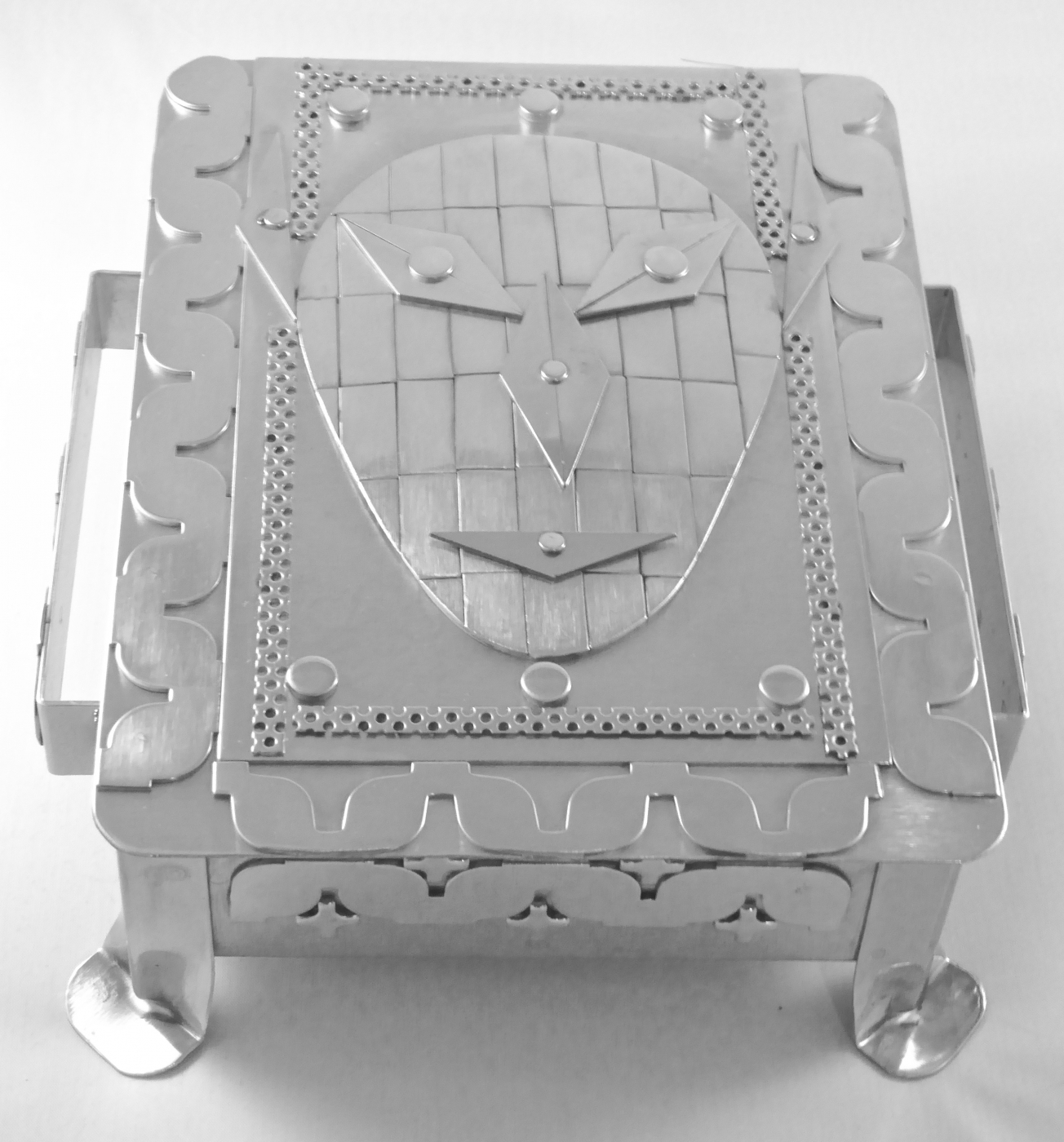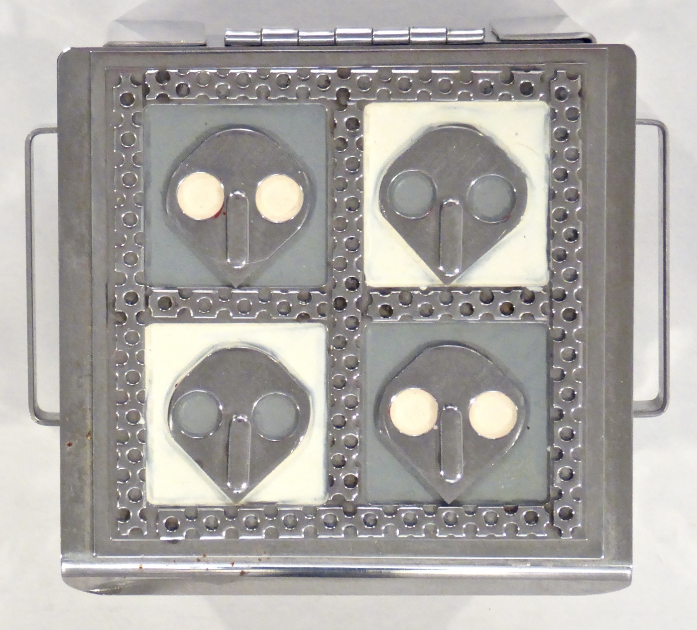 Stanley Szwarc’s most typical creations are marvels of decoration, stainless steel boxes lathered in abstract ornamentation. But he also applied his geometric talent to creating faces, some ominous, some cartoony, some robotic, and some quite dressy. When the book keeper turned metal worker took up representational imagery, his imagination was stunning.