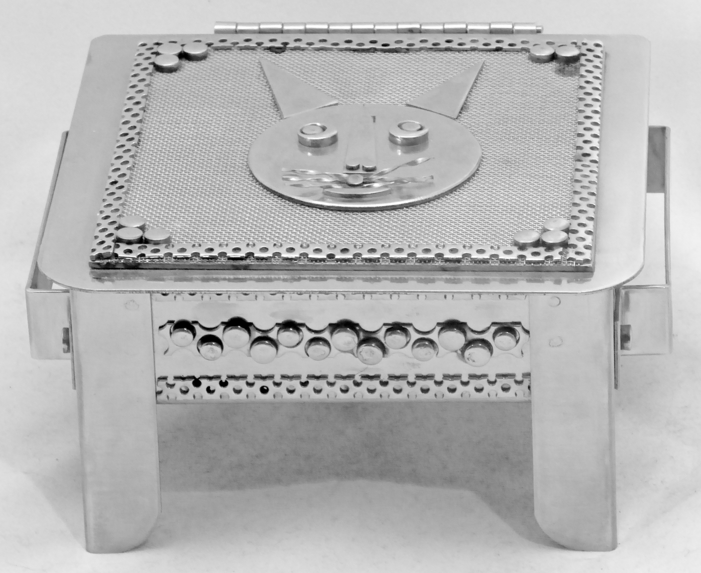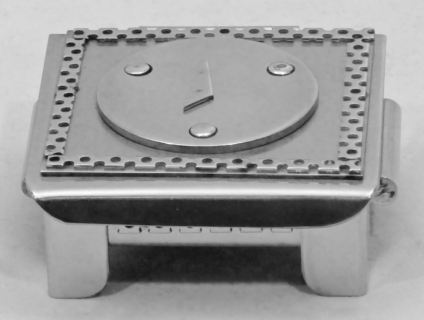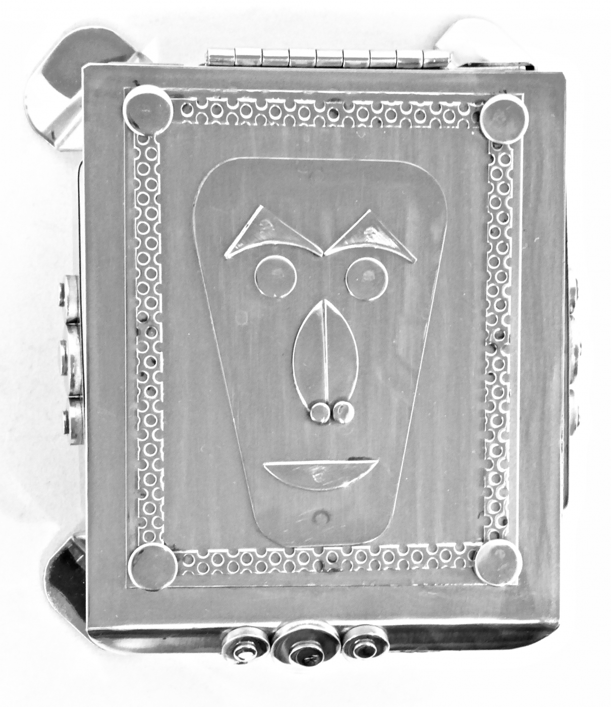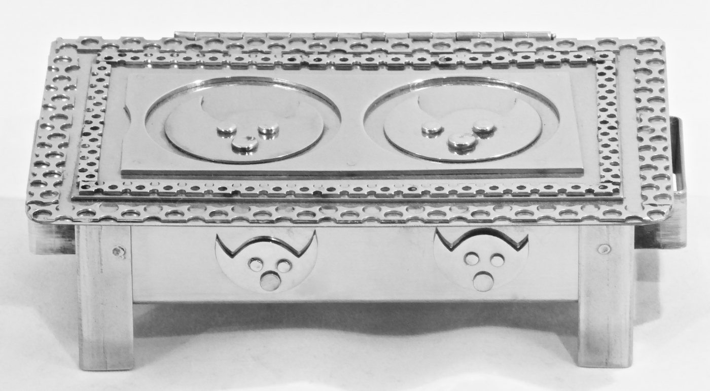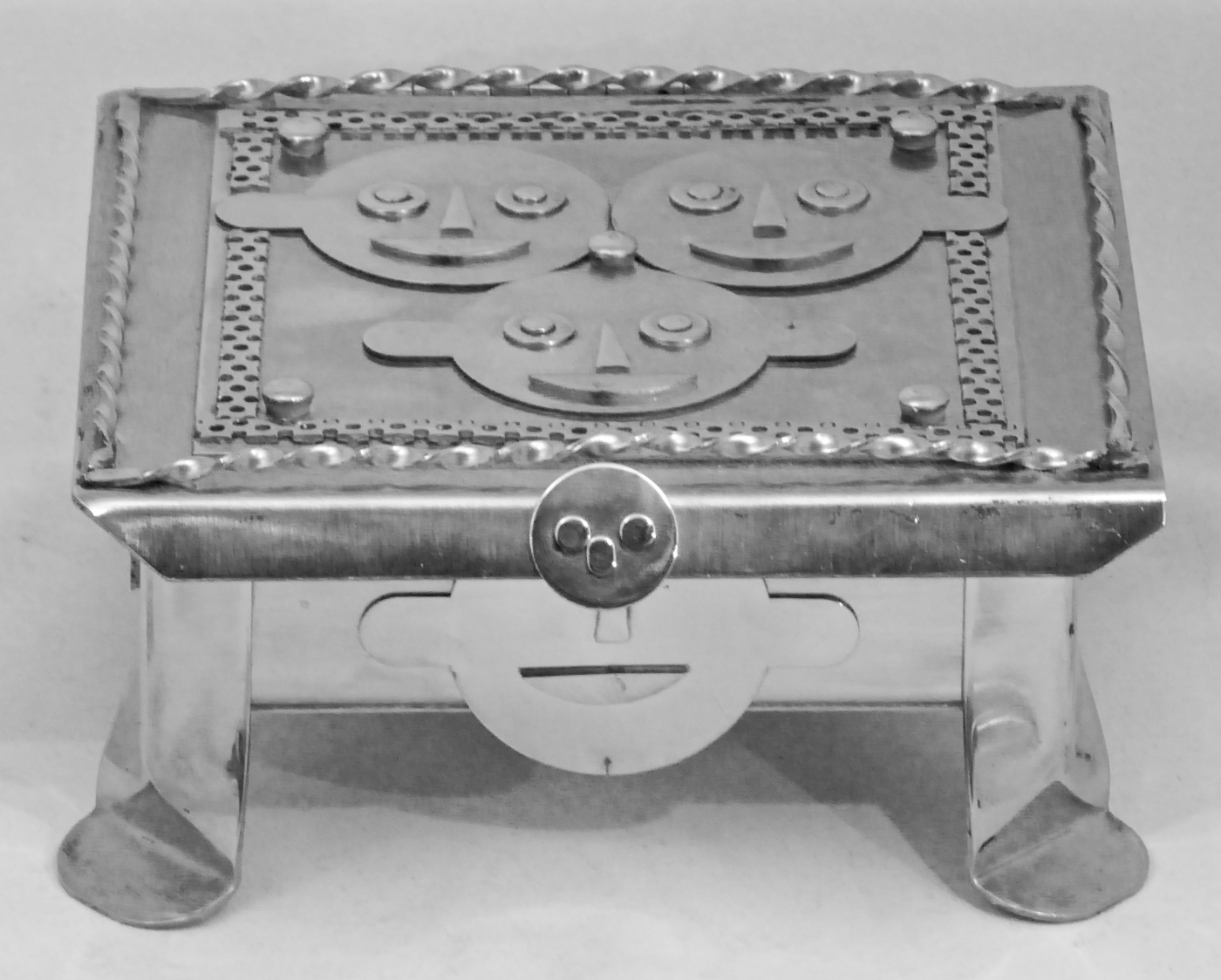 Stanley Szwarc’s most typical creations are marvels of decoration, stainless steel boxes lathered in abstract ornamentation. But he also applied his geometric talent to creating faces, some ominous, some cartoony, some robotic, and some quite dressy. When the book keeper turned metal worker took up representational imagery, his imagination was stunning.
