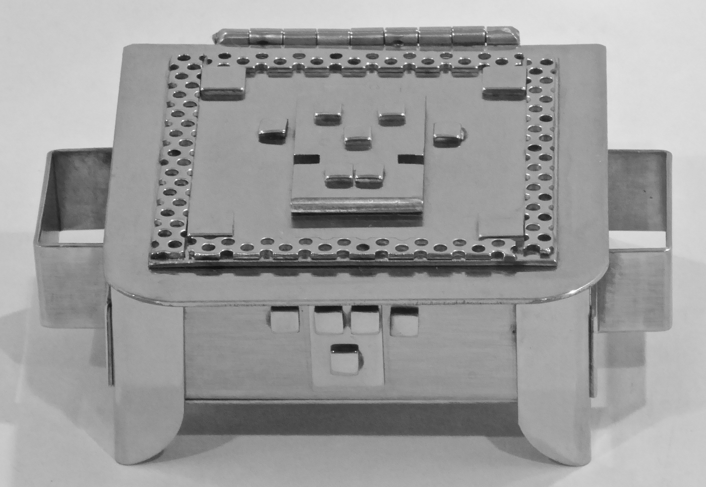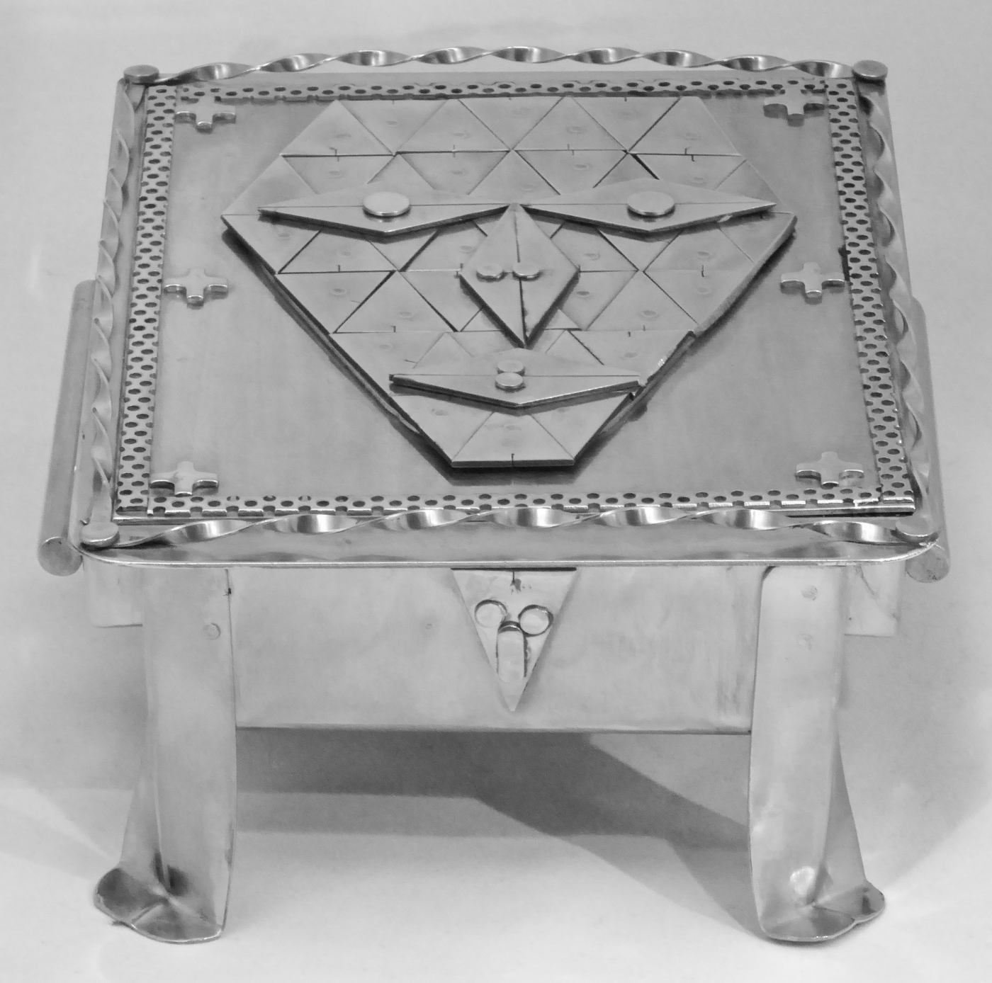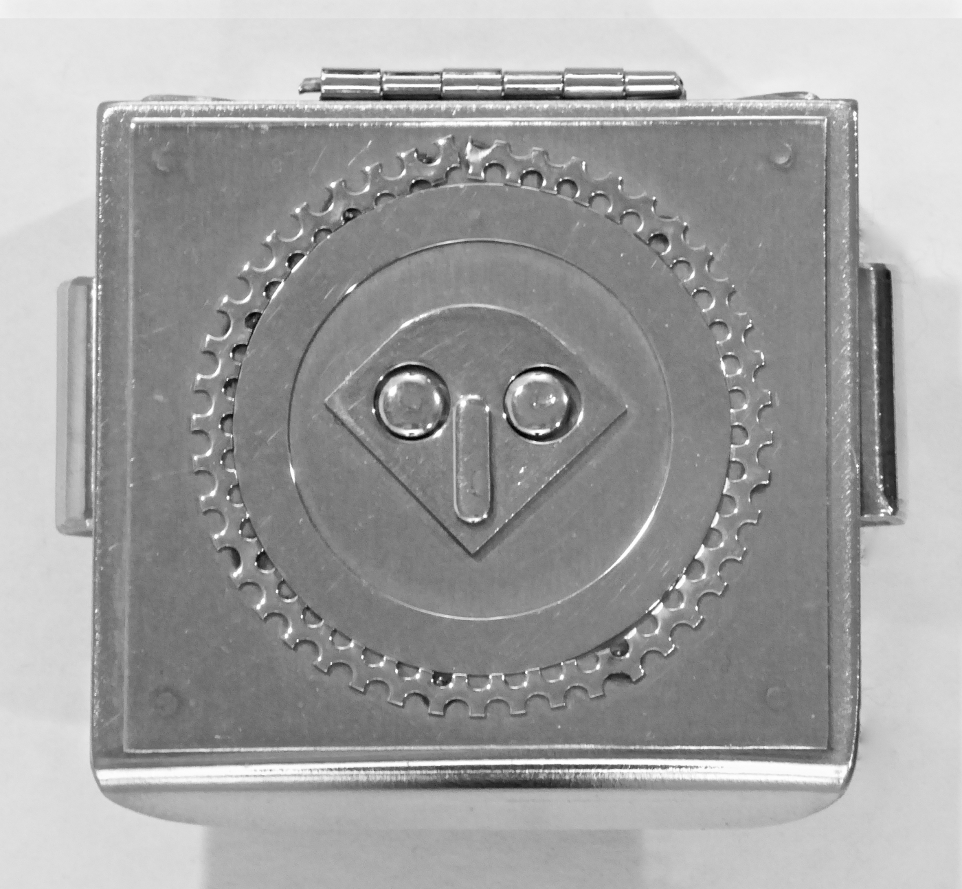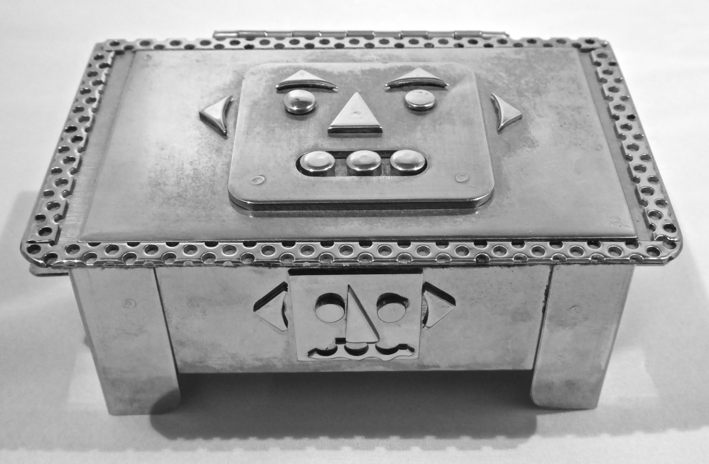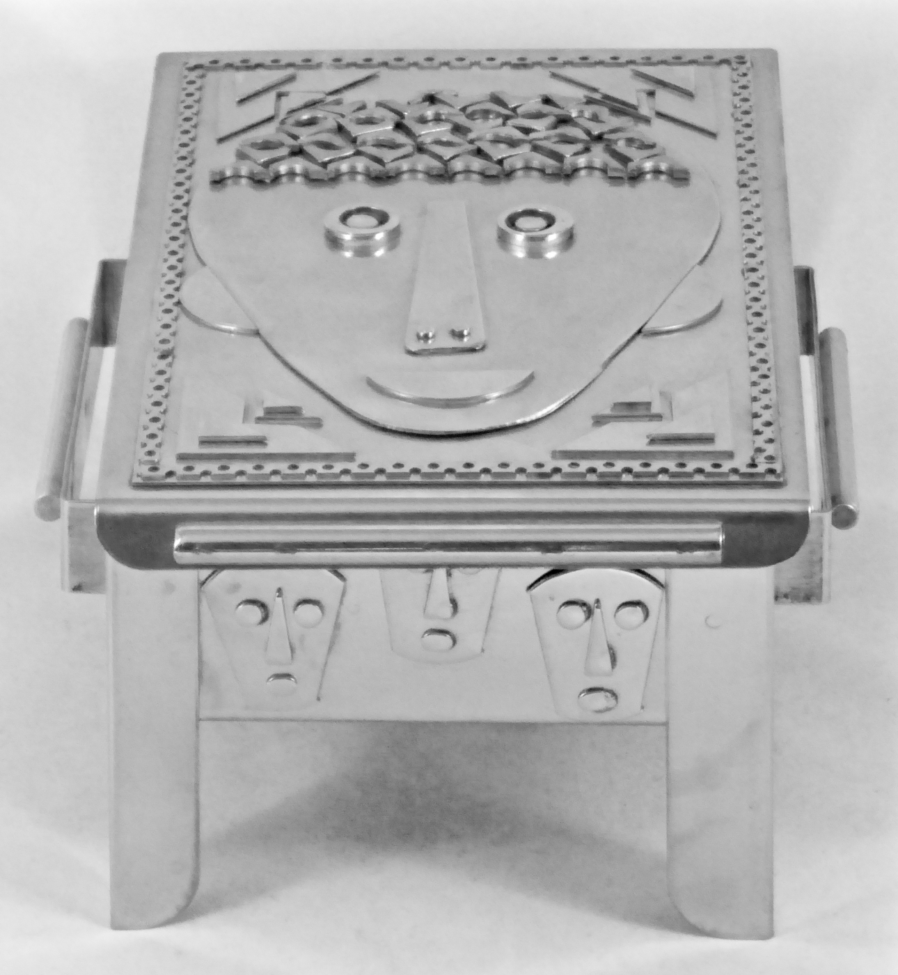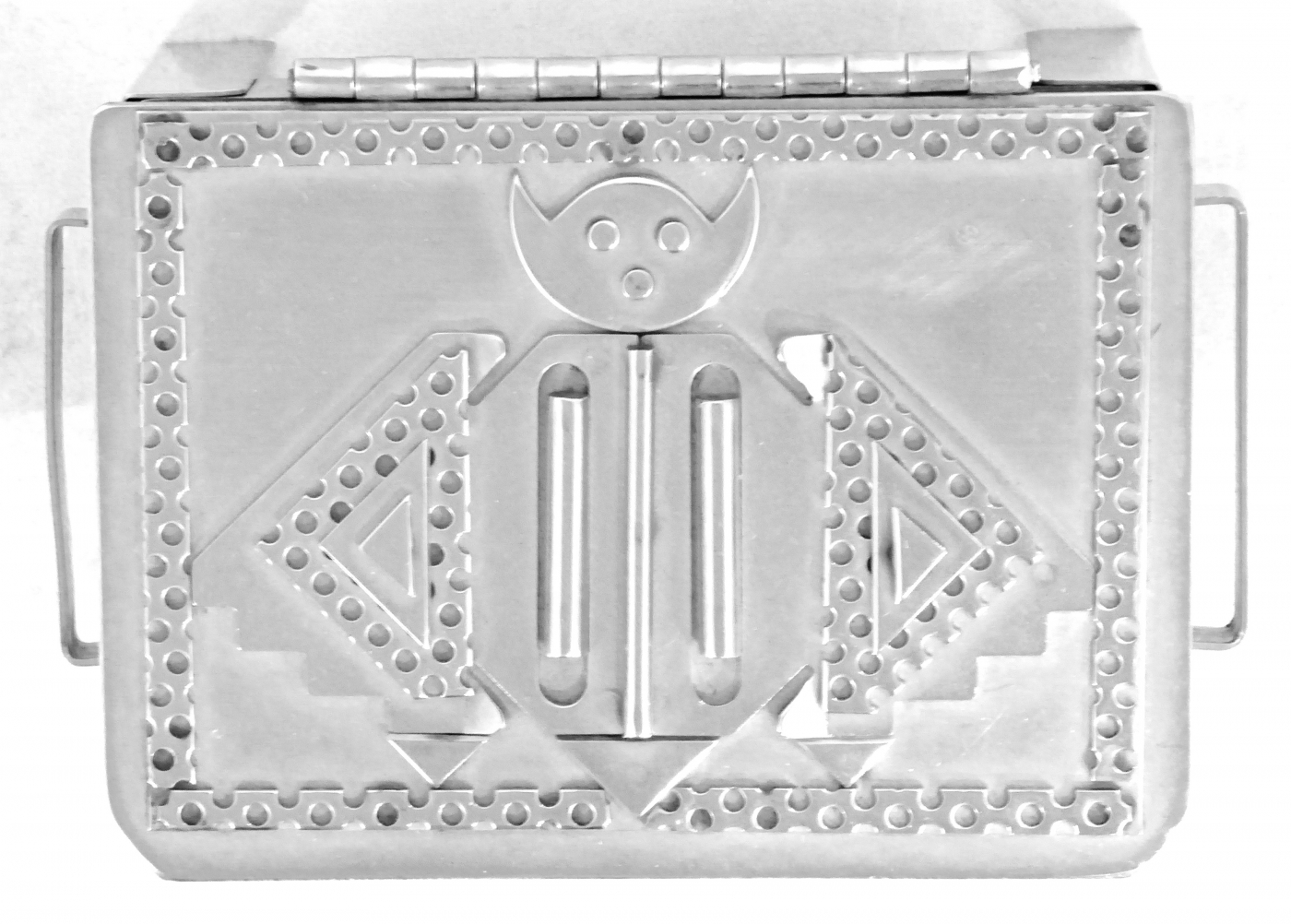 Stanley Szwarc’s most typical creations are marvels of decoration, stainless steel boxes lathered in abstract ornamentation. But he also applied his geometric talent to creating faces, some ominous, some cartoony, some robotic, and some quite dressy. When the book keeper turned metal worker took up representational imagery, his imagination was stunning.