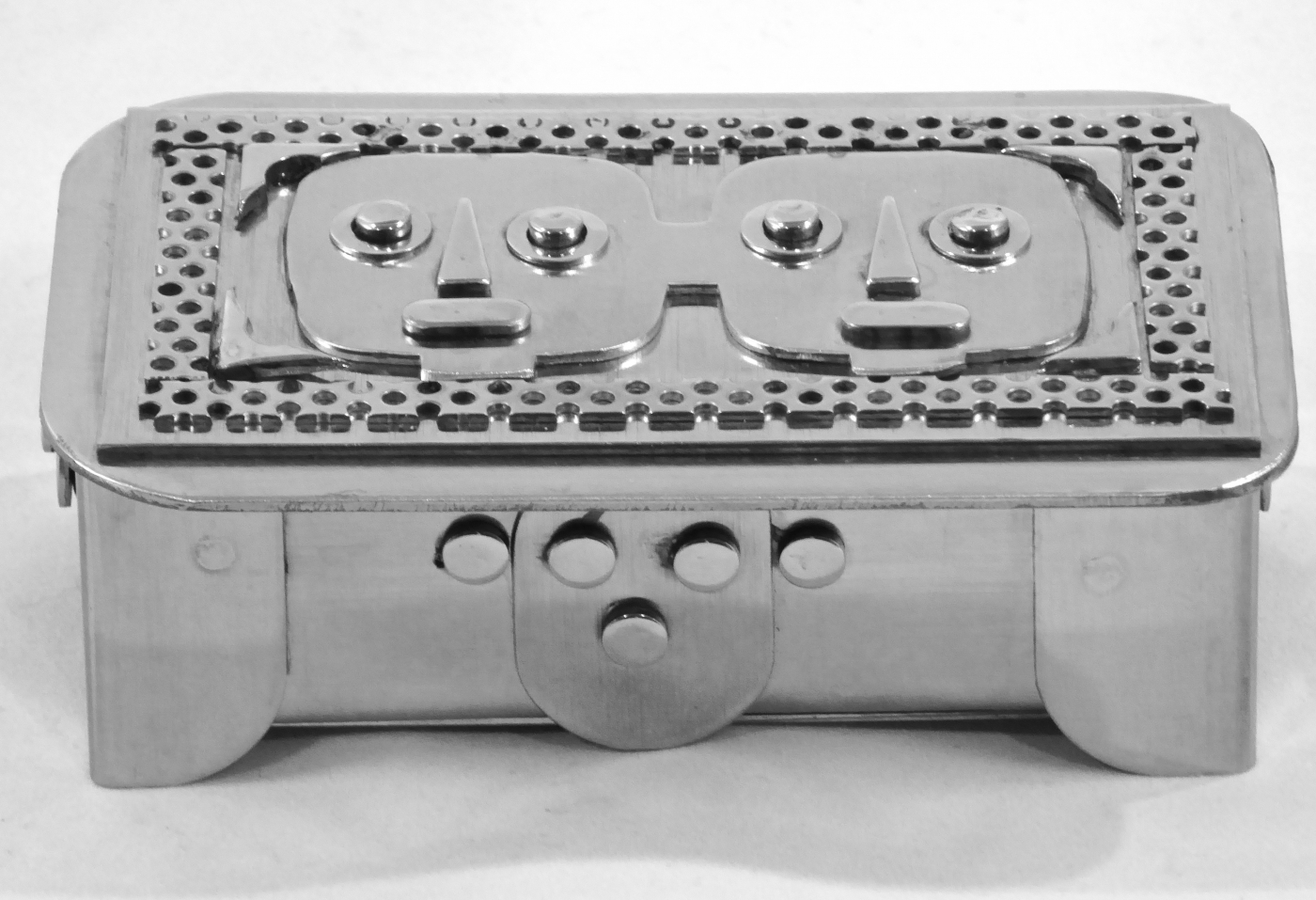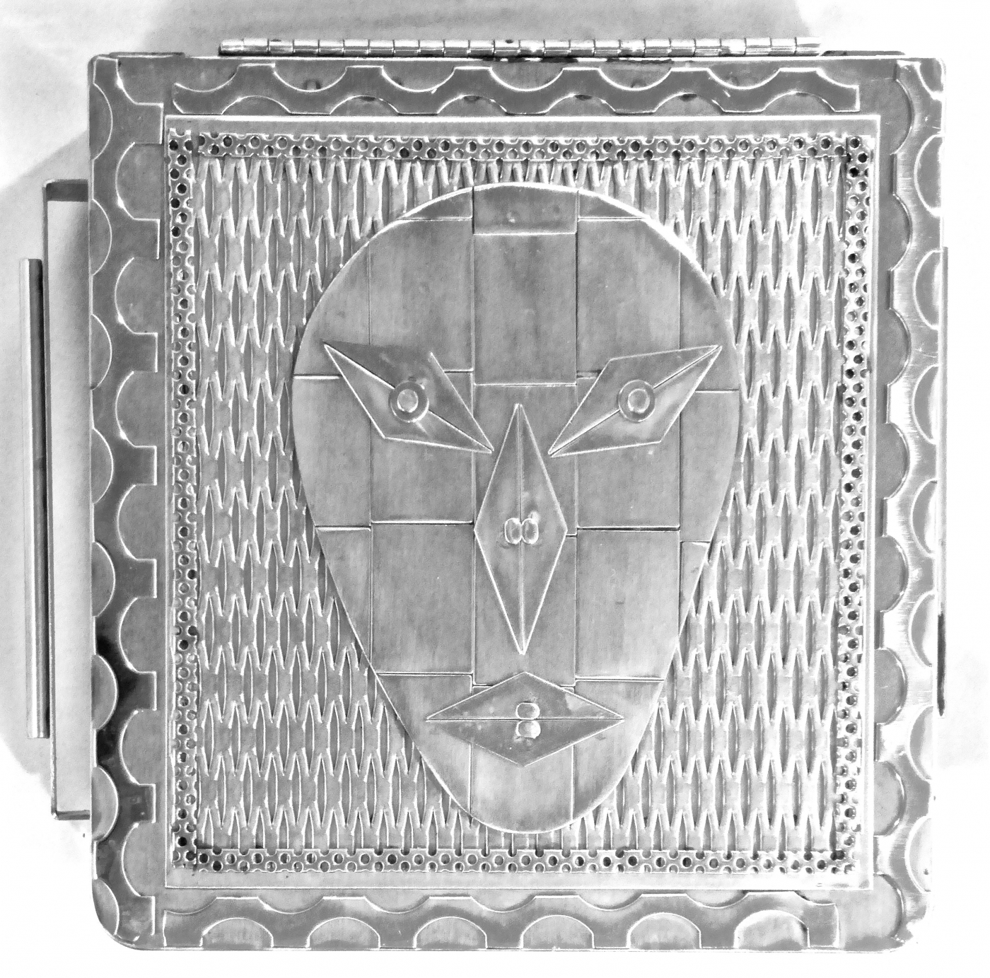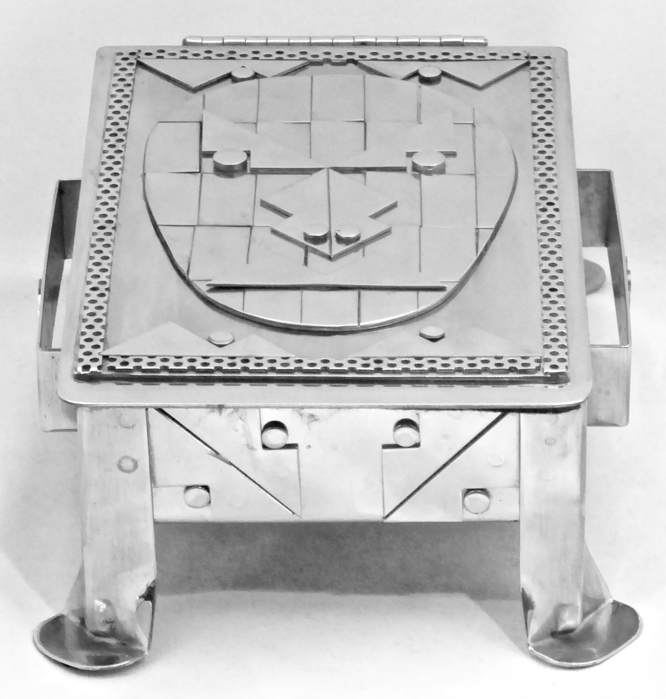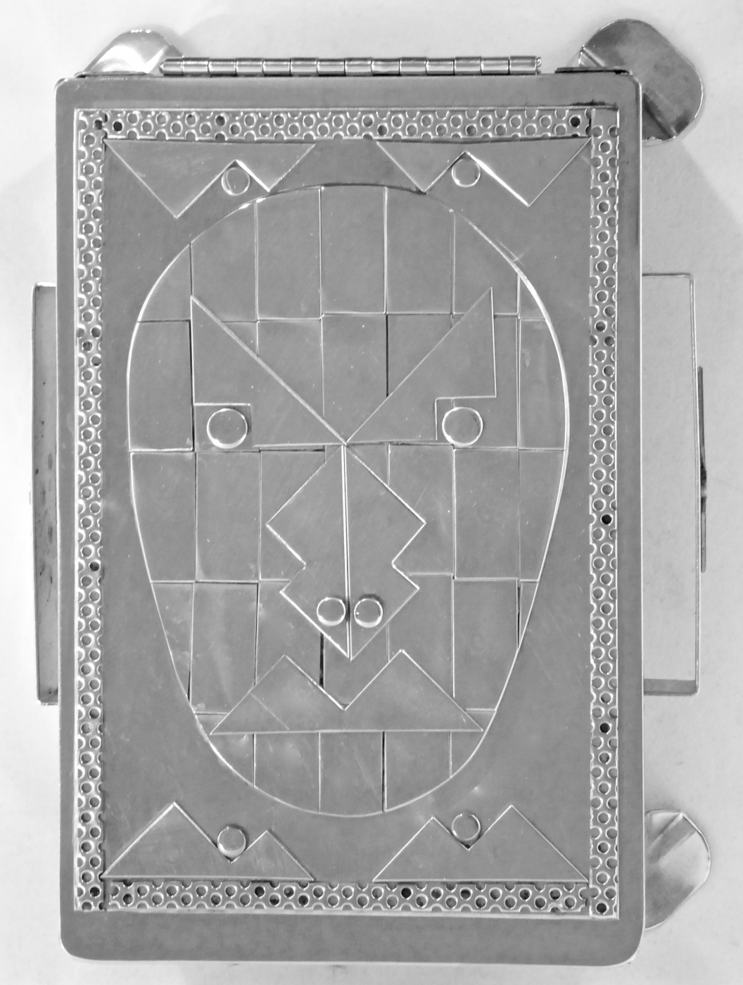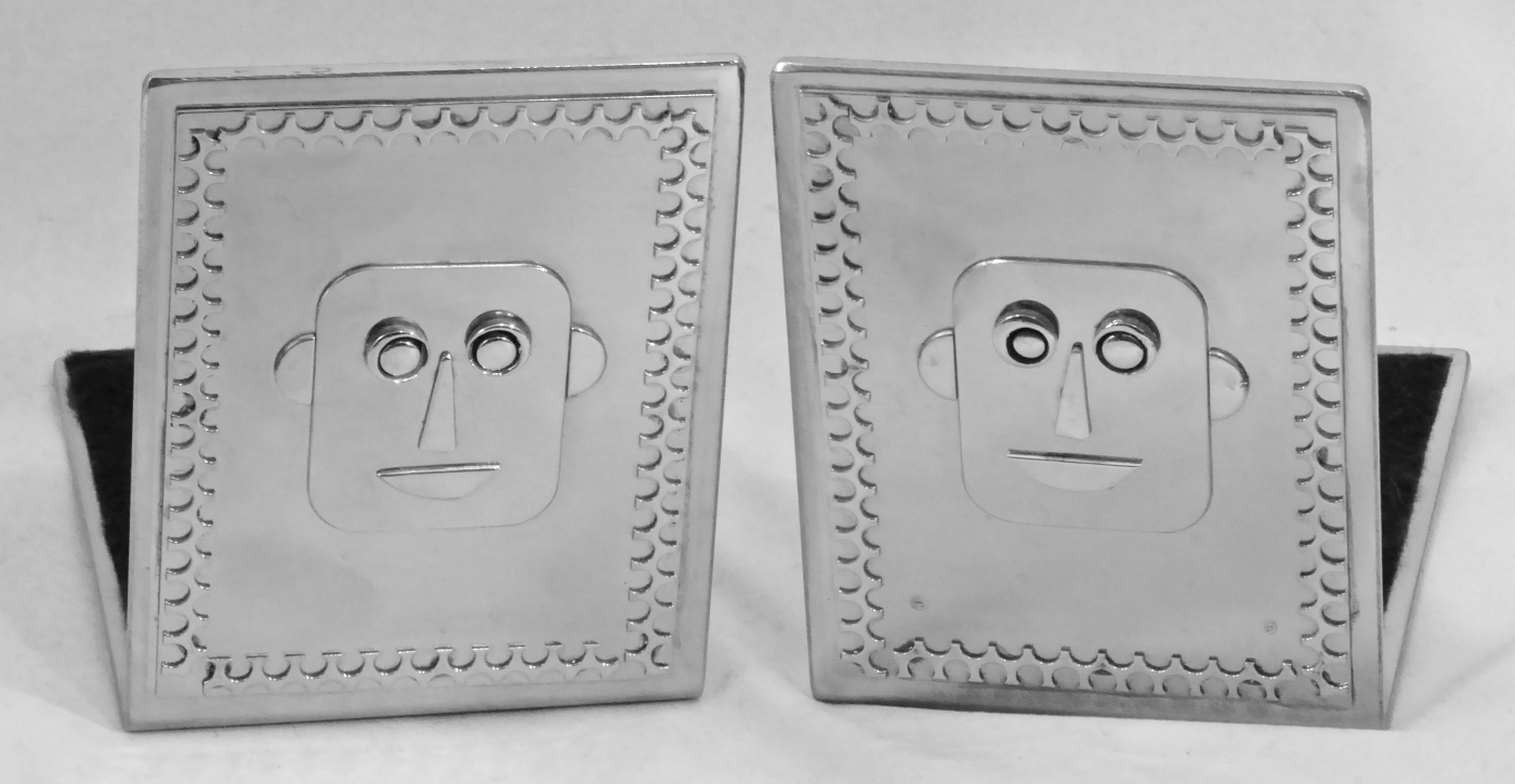 Stanley Szwarc’s most typical creations are marvels of decoration, stainless steel boxes lathered in abstract ornamentation. But he also applied his geometric talent to creating faces, some ominous, some cartoony, some robotic, and some quite dressy. When the book keeper turned metal worker took up representational imagery, his imagination was stunning.