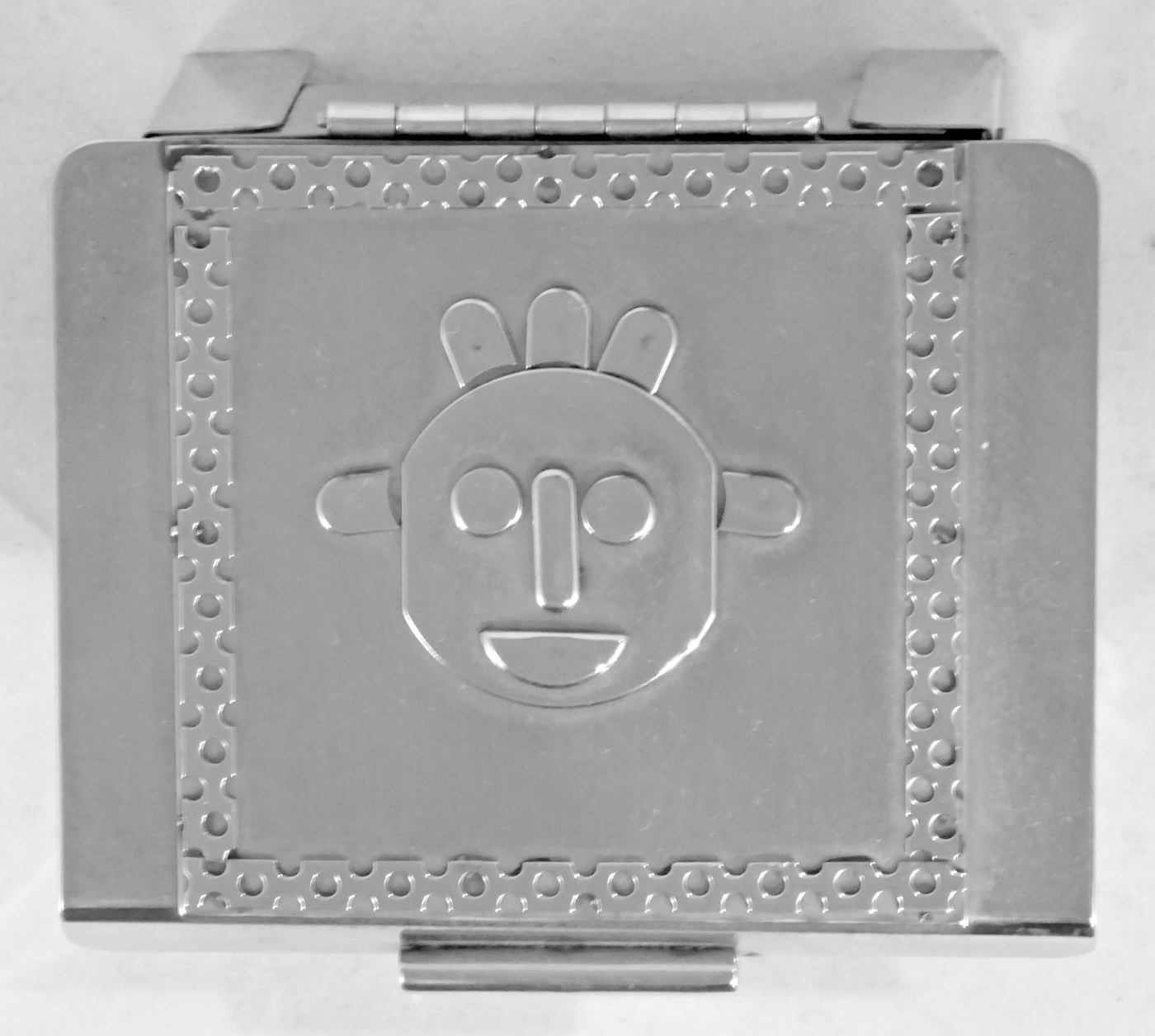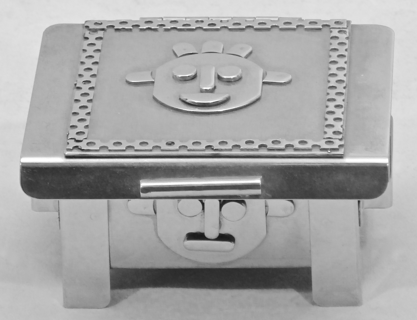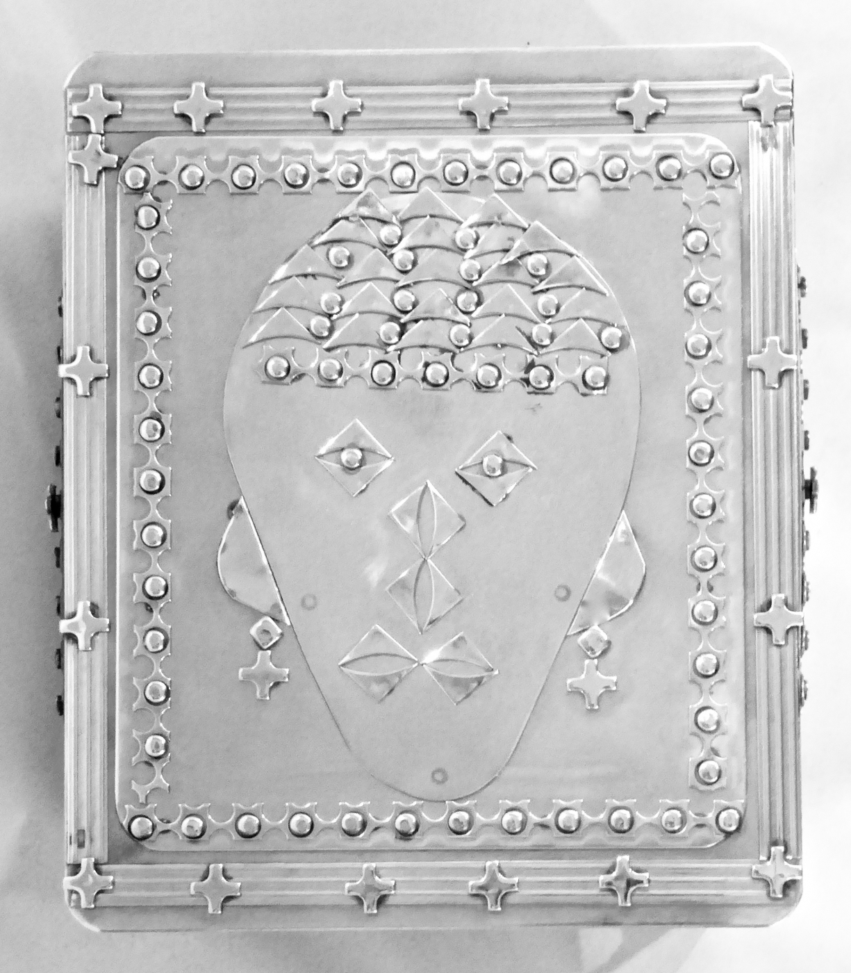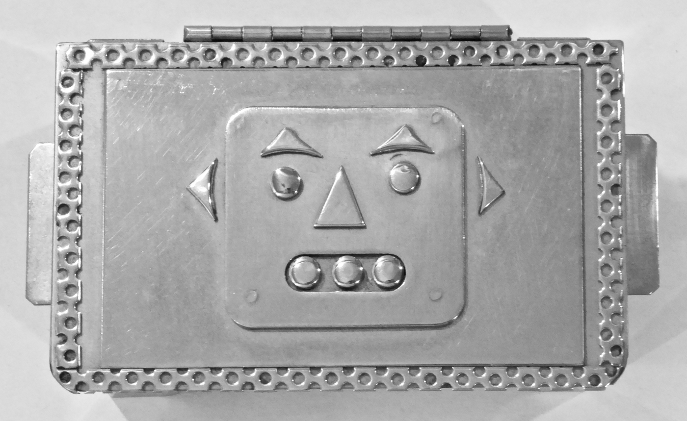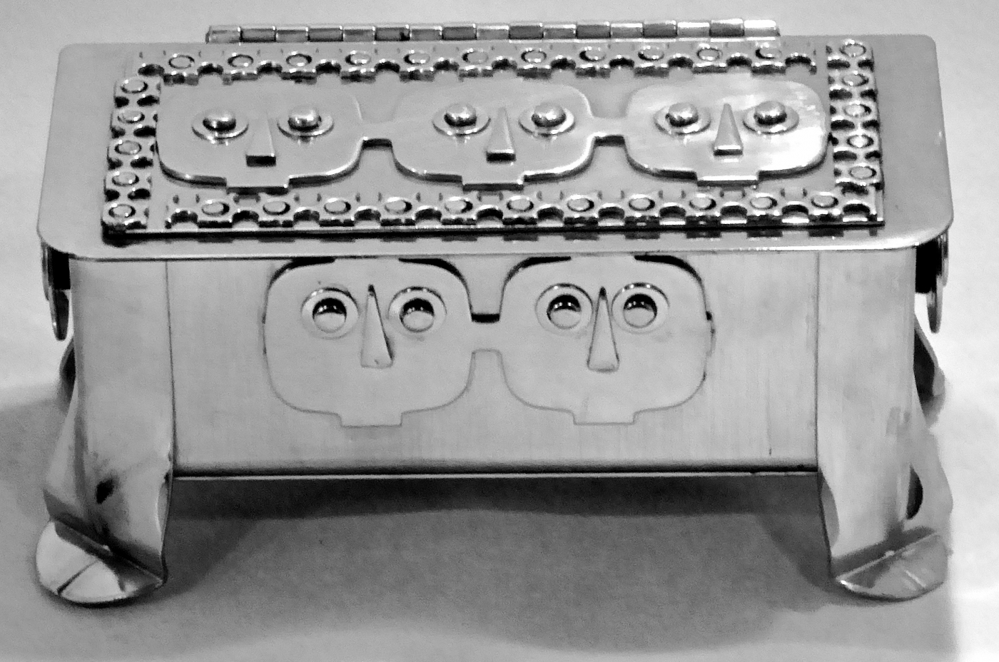 Stanley Szwarc’s most typical creations are marvels of decoration, stainless steel boxes lathered in abstract ornamentation. But he also applied his geometric talent to creating faces, some ominous, some cartoony, some robotic, and some quite dressy. When the book keeper turned metal worker took up representational imagery, his imagination was stunning.