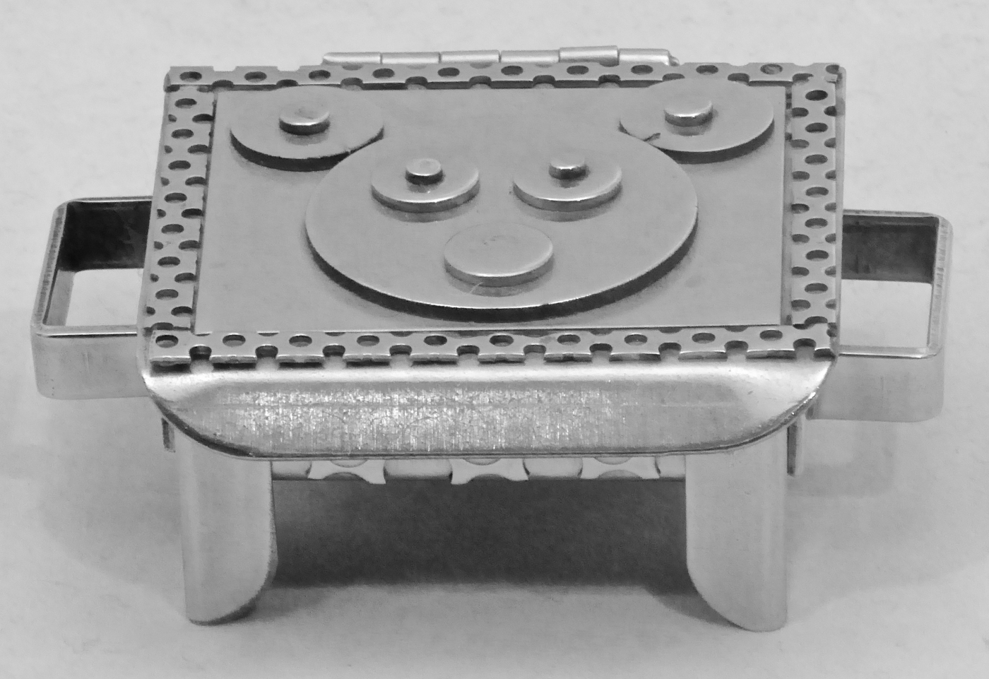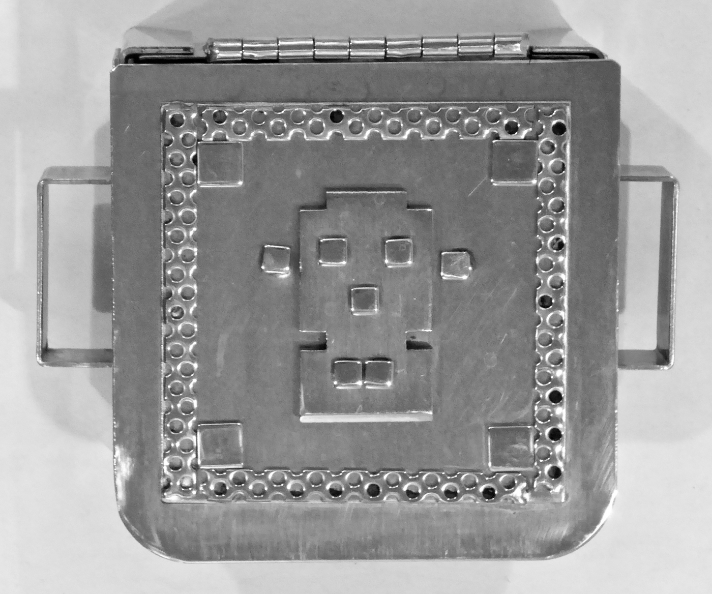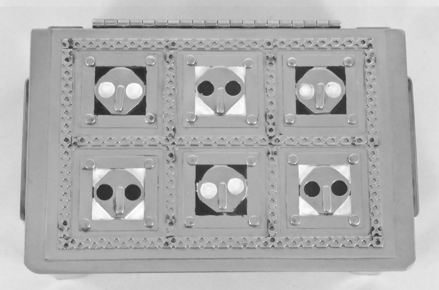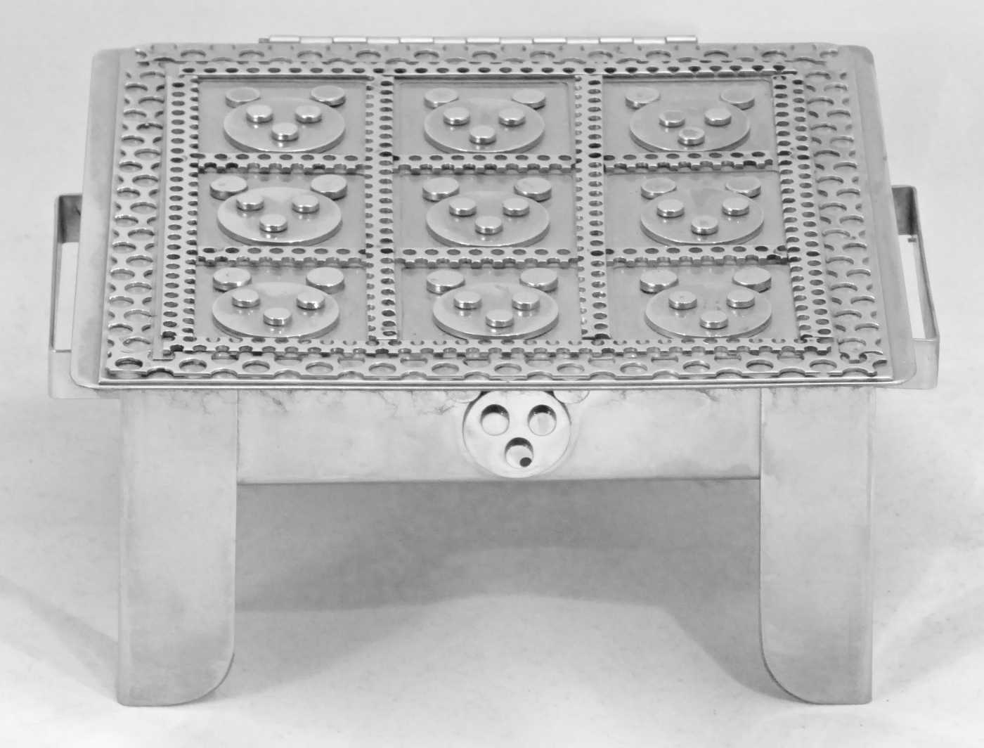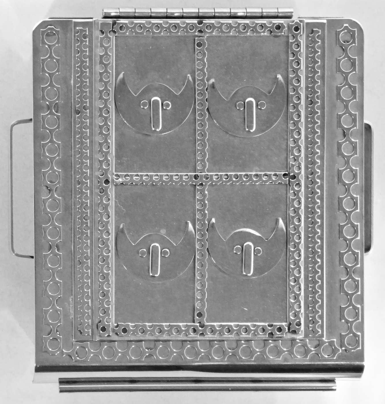 Stanley Szwarc’s most typical creations are marvels of decoration, stainless steel boxes lathered in abstract ornamentation. But he also applied his geometric talent to creating faces, some ominous, some cartoony, some robotic, and some quite dressy. When the book keeper turned metal worker took up representational imagery, his imagination was stunning.