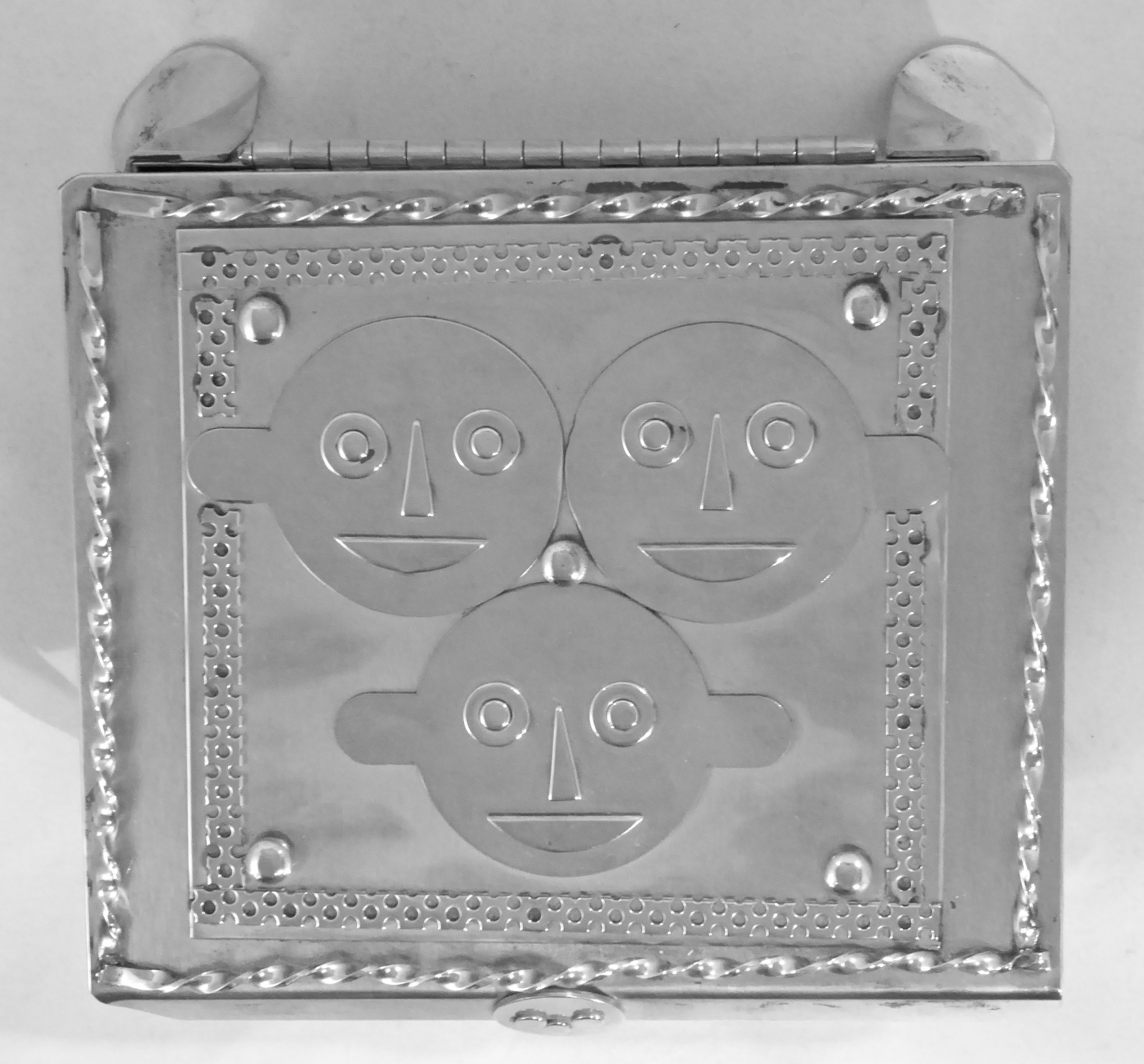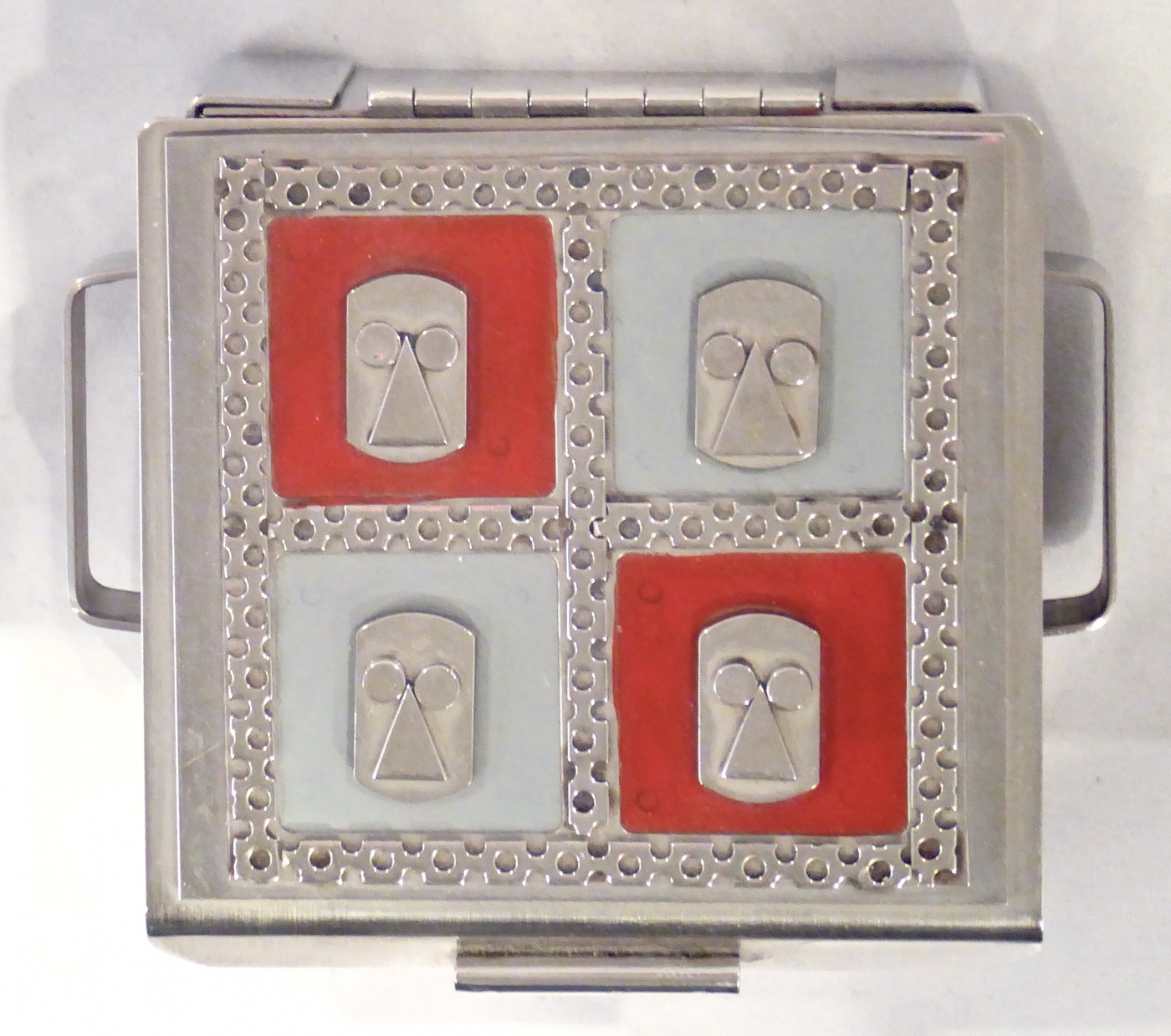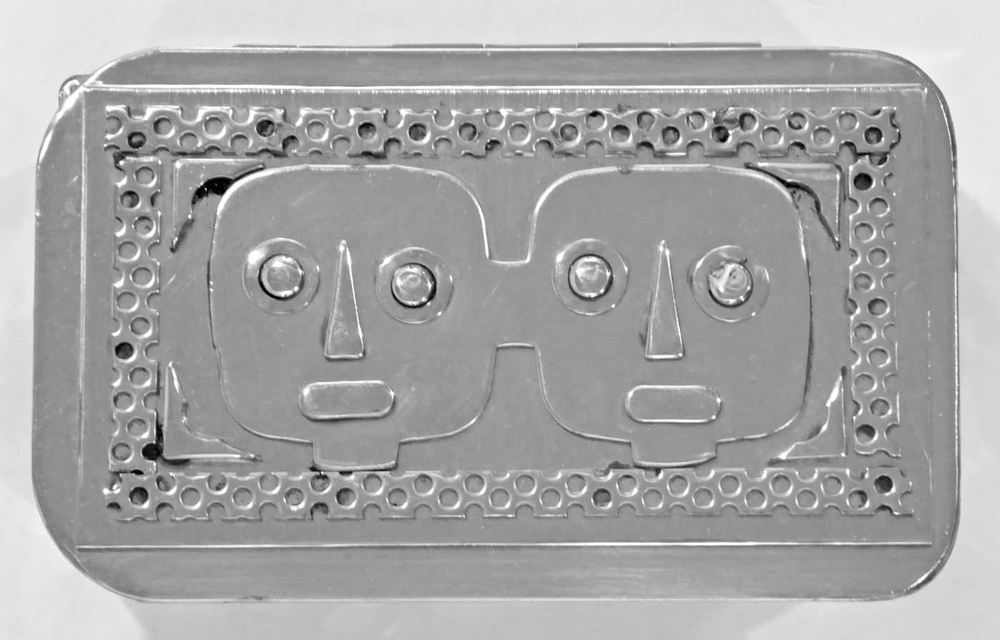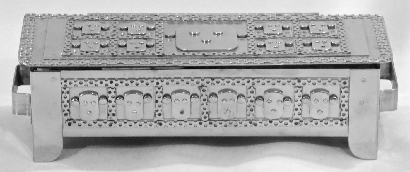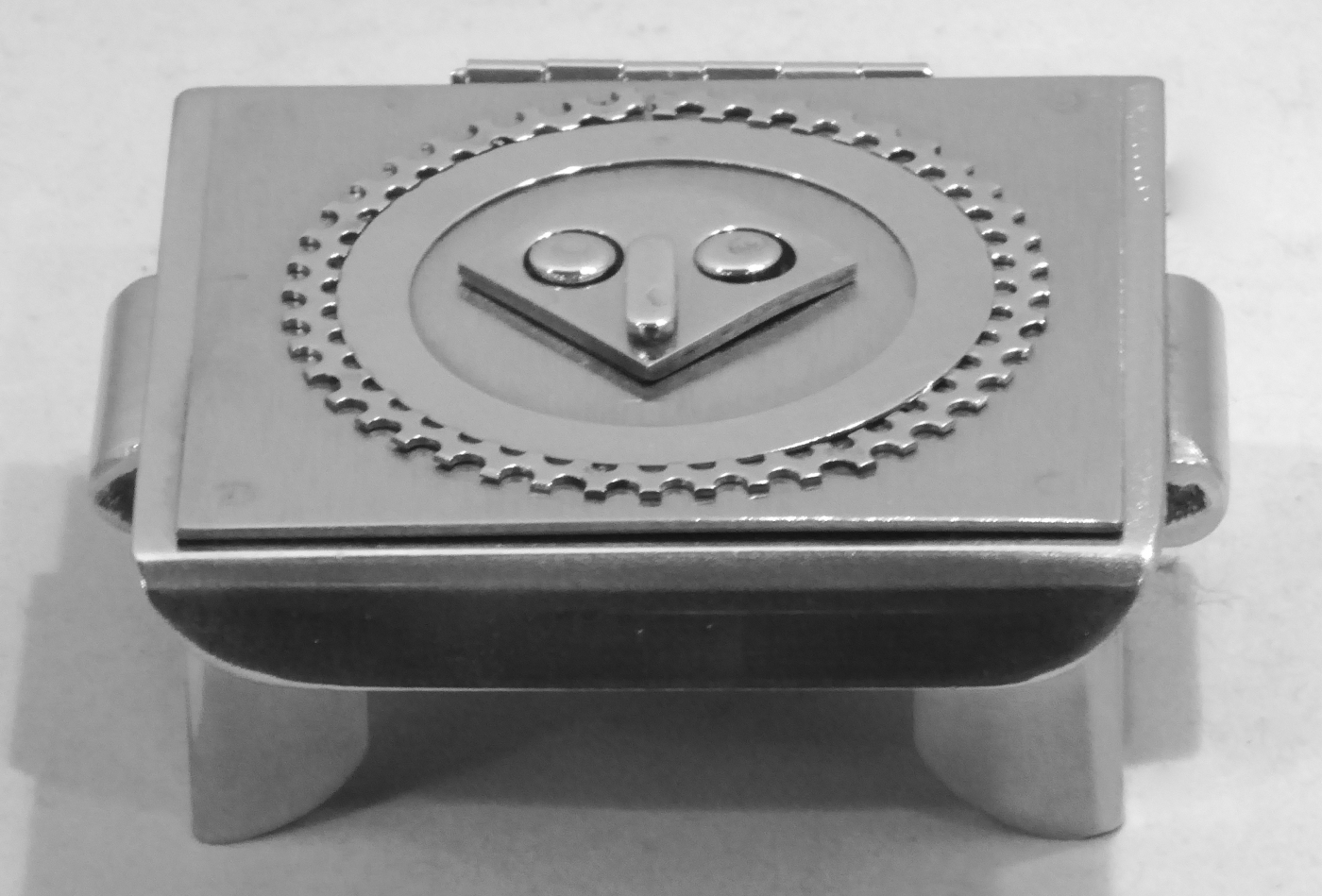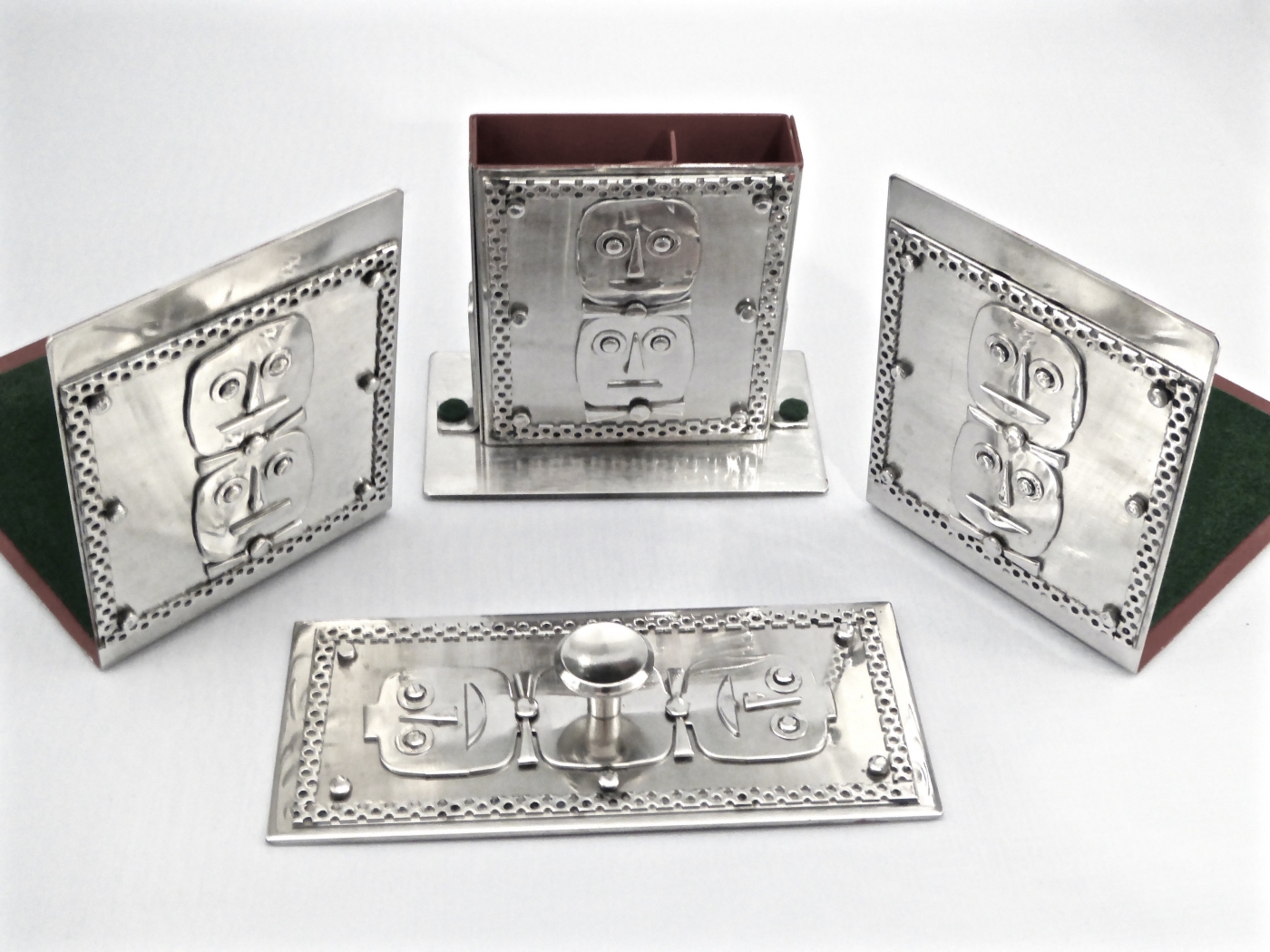 Stanley Szwarc’s most typical creations are marvels of decoration, stainless steel boxes lathered in abstract ornamentation. But he also applied his geometric talent to creating faces, some ominous, some cartoony, some robotic, and some quite dressy. When the book keeper turned metal worker took up representational imagery, his imagination was stunning.