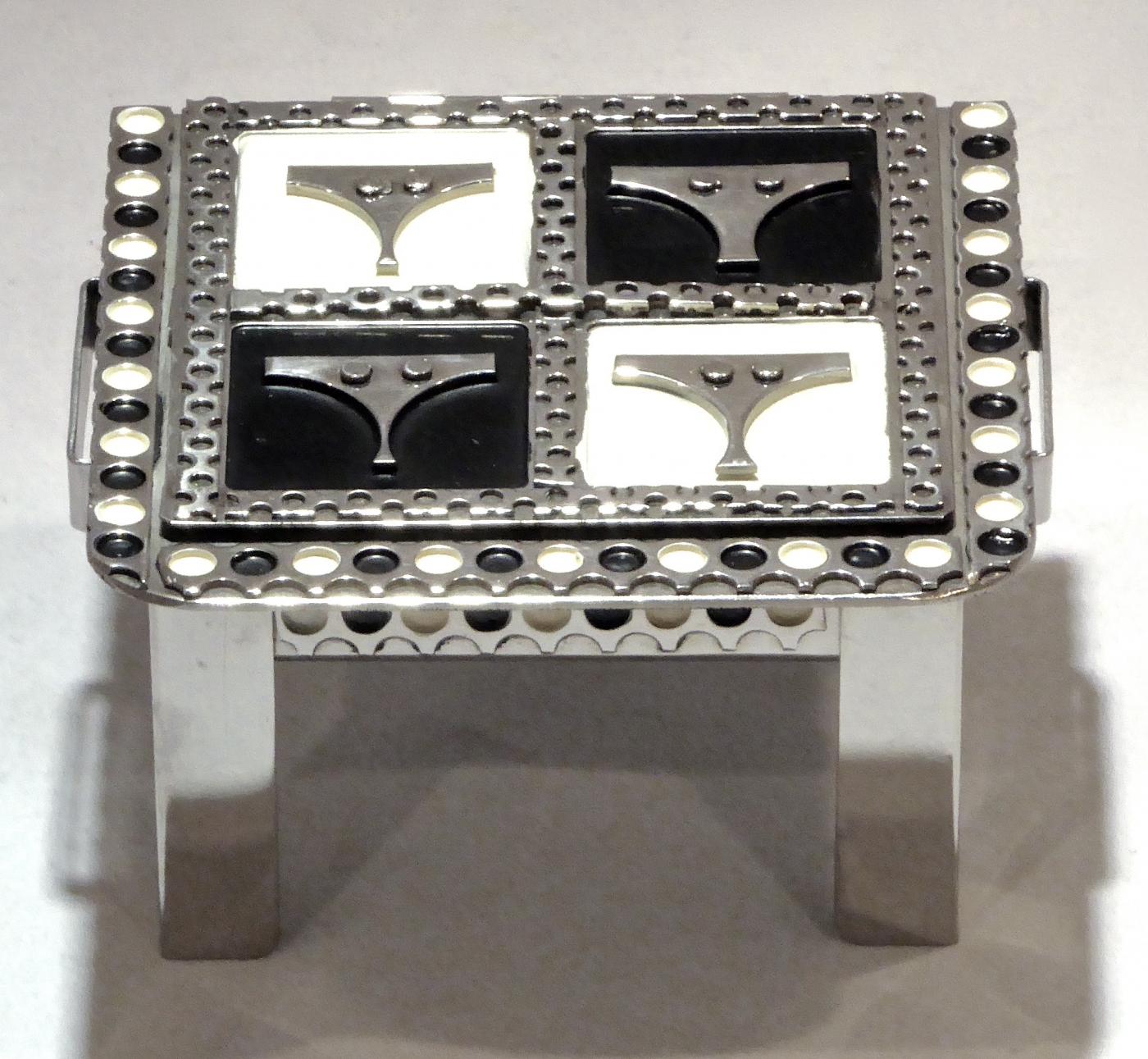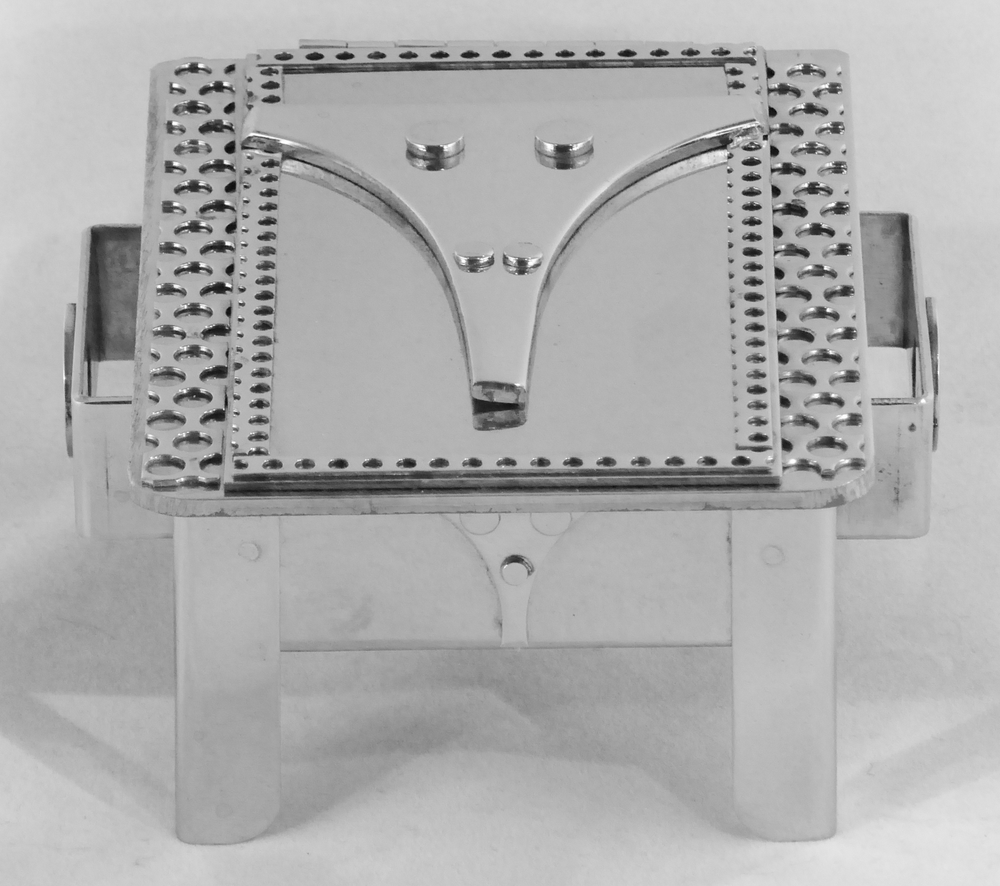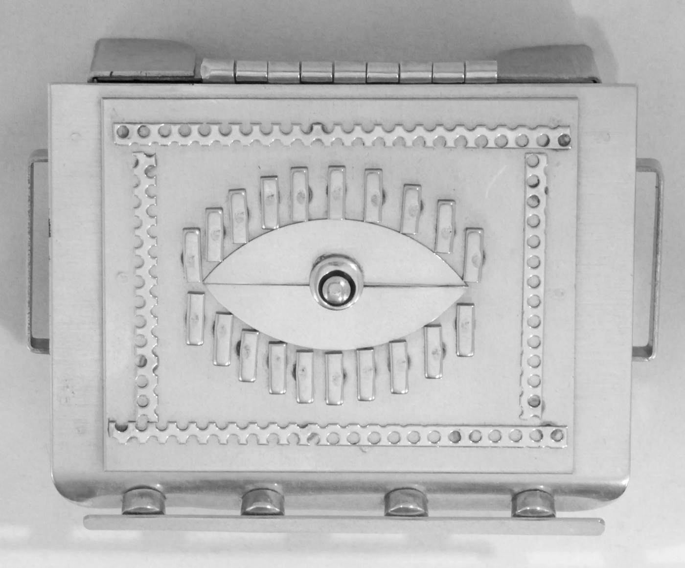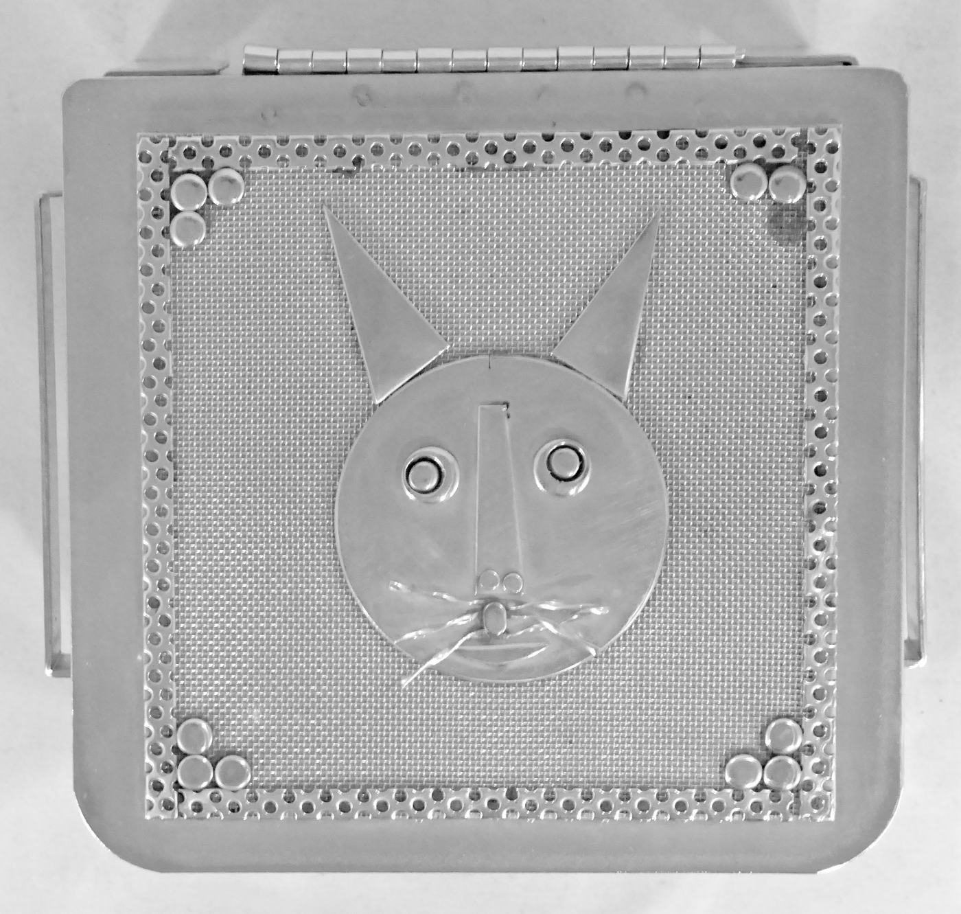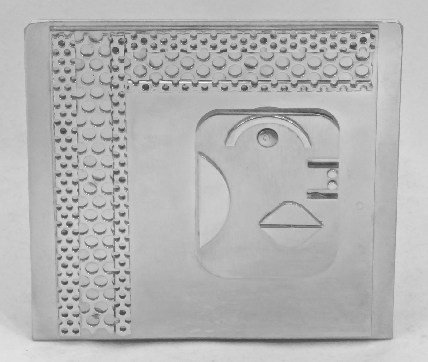 Stanley Szwarc’s most typical creations are marvels of decoration, stainless steel boxes lathered in abstract ornamentation. But he also applied his geometric talent to creating faces, some ominous, some cartoony, some robotic, and some quite dressy. When the book keeper turned metal worker took up representational imagery, his imagination was stunning.