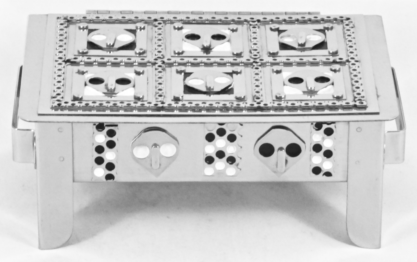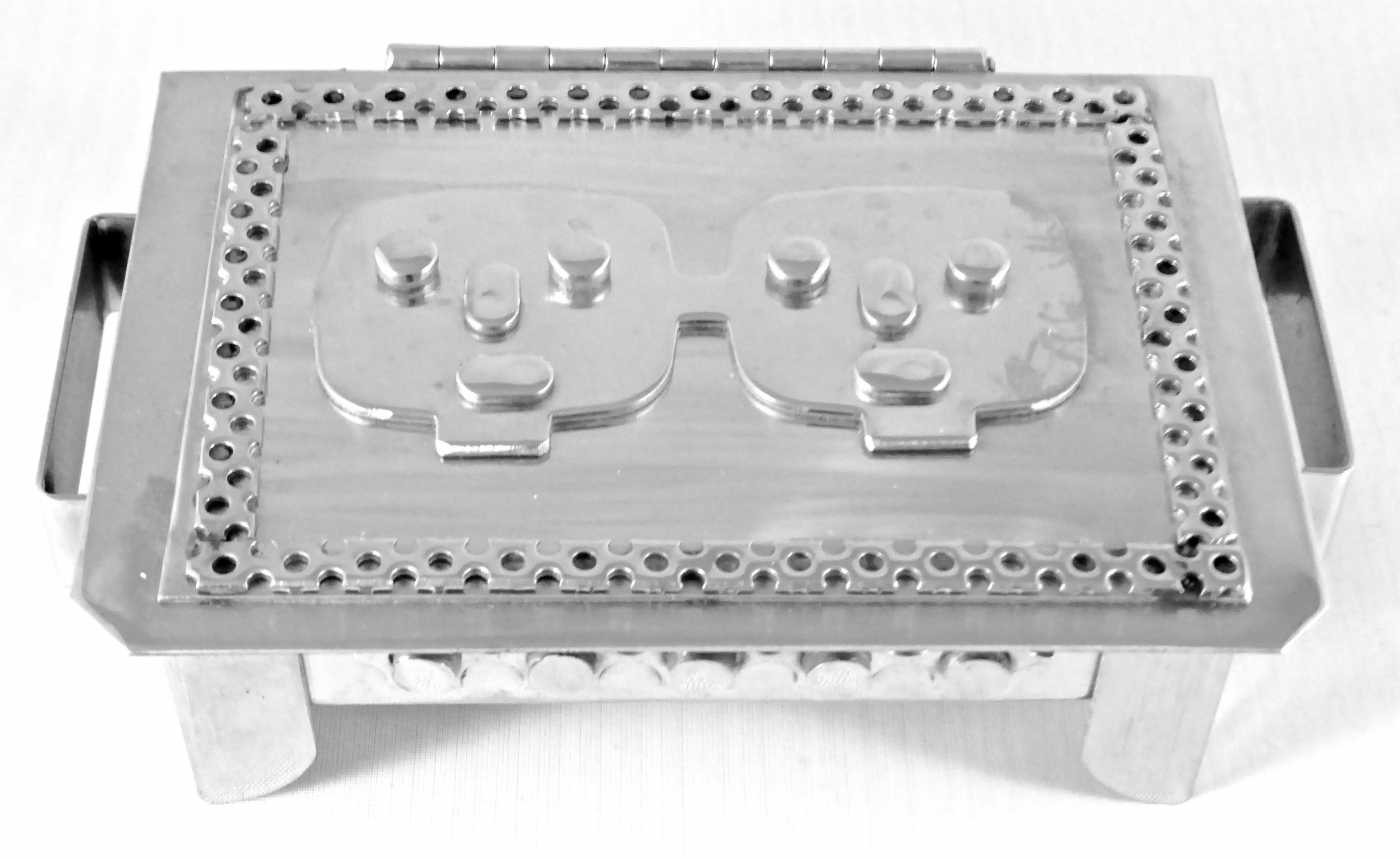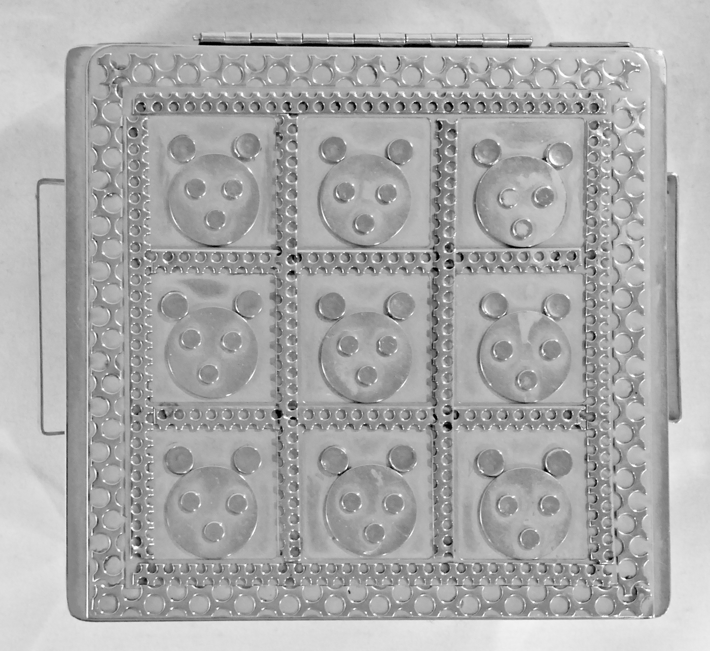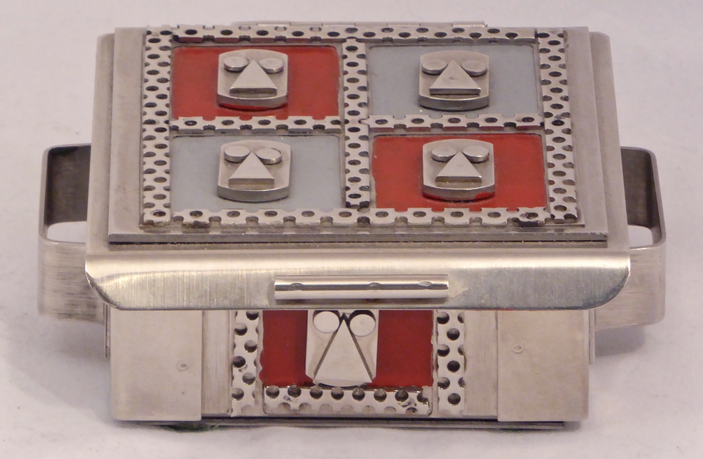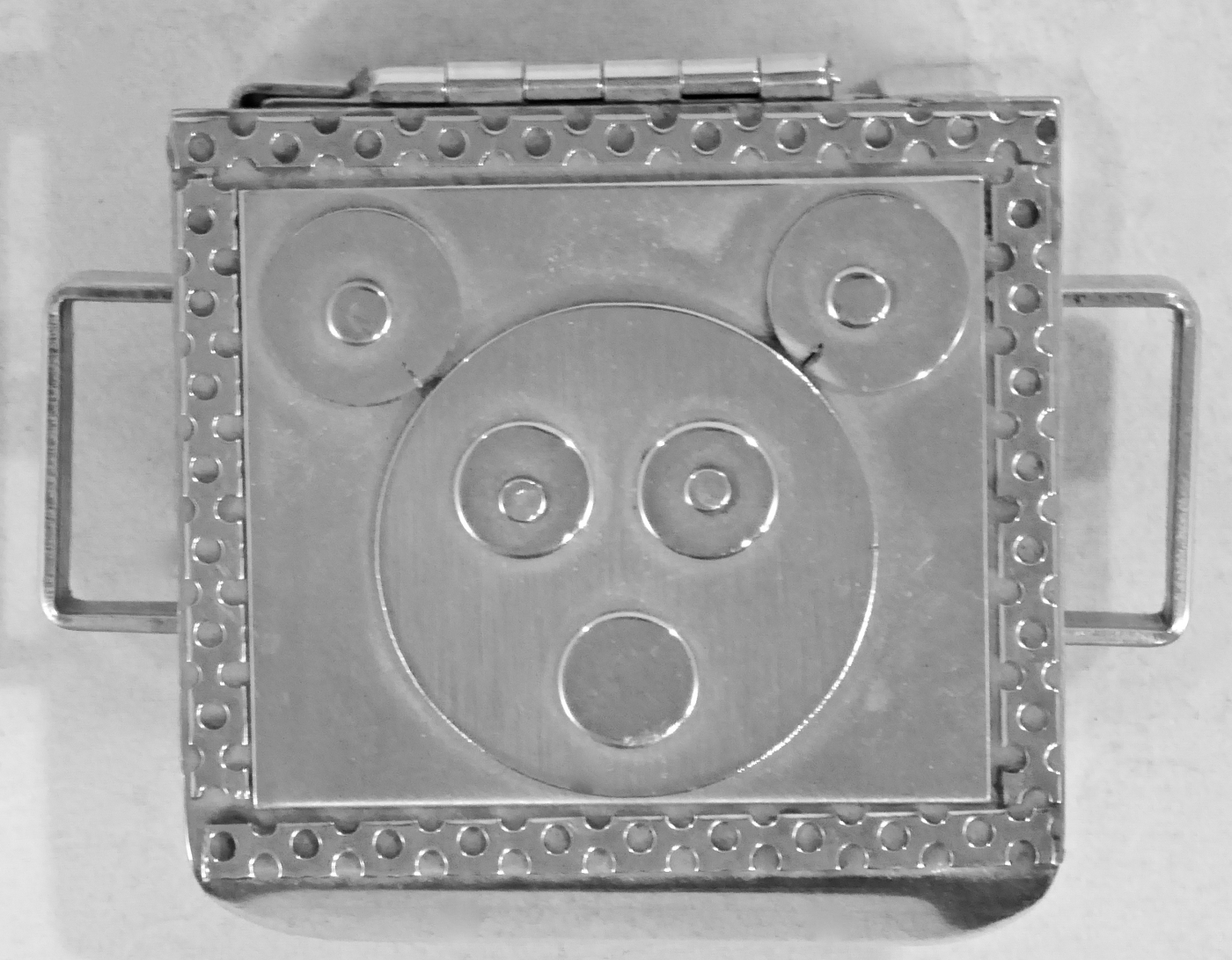 Stanley Szwarc’s most typical creations are marvels of decoration, stainless steel boxes lathered in abstract ornamentation. But he also applied his geometric talent to creating faces, some ominous, some cartoony, some robotic, and some quite dressy. When the book keeper turned metal worker took up representational imagery, his imagination was stunning.