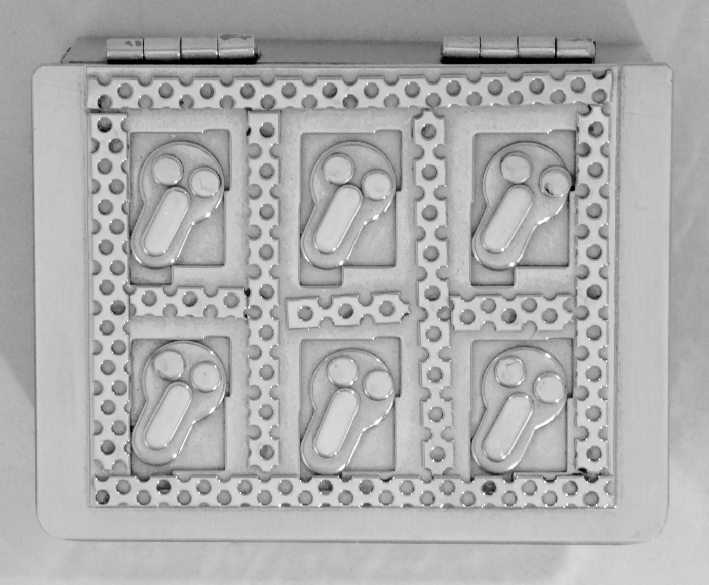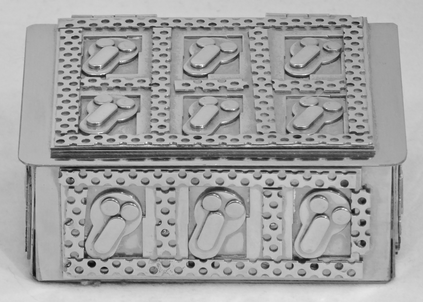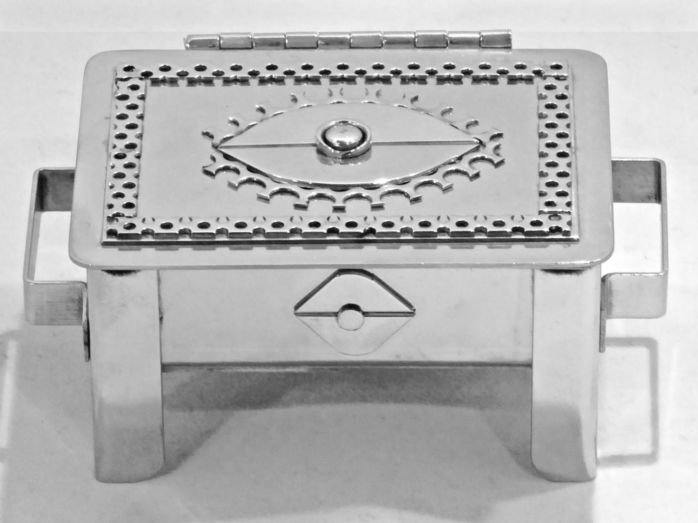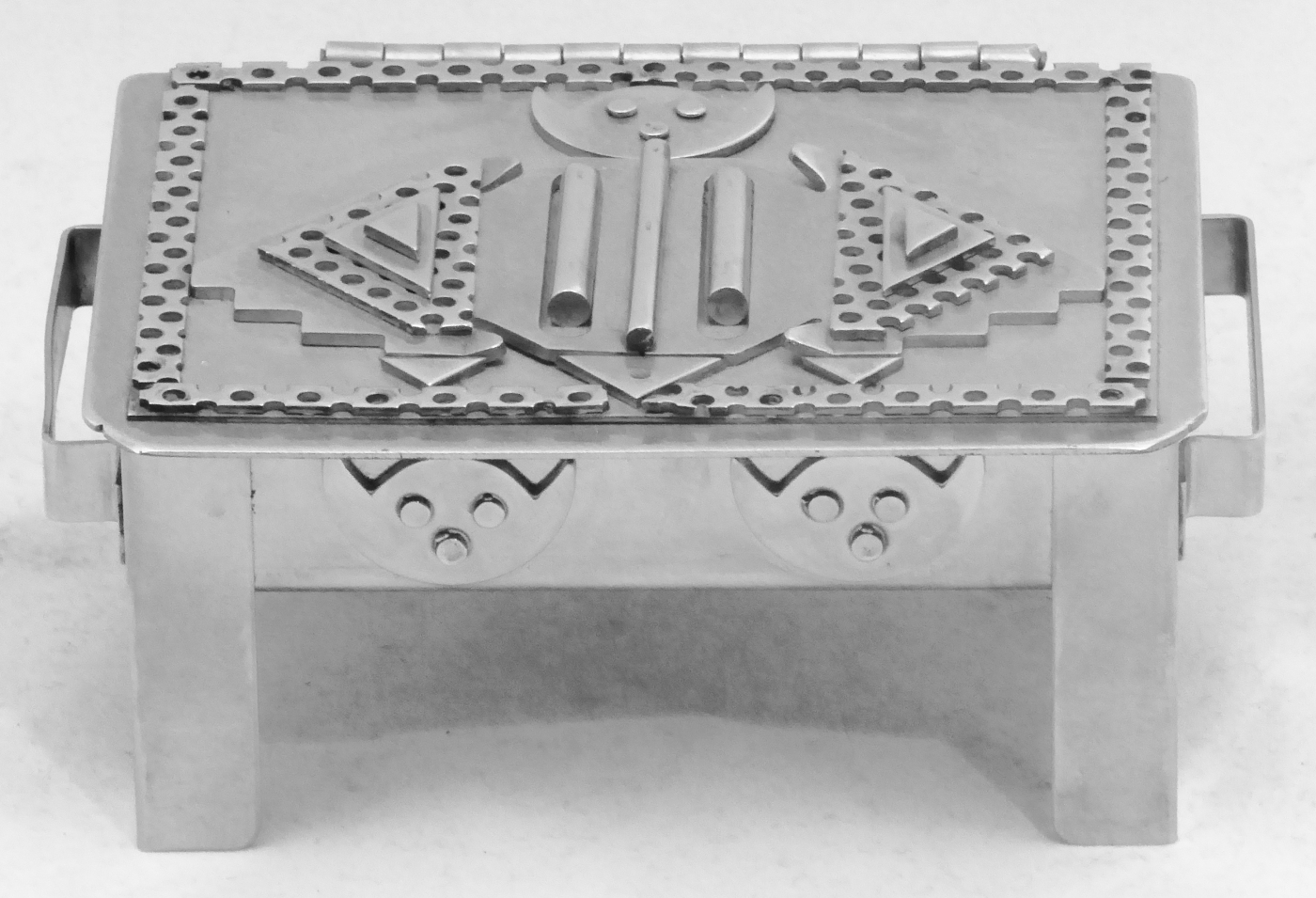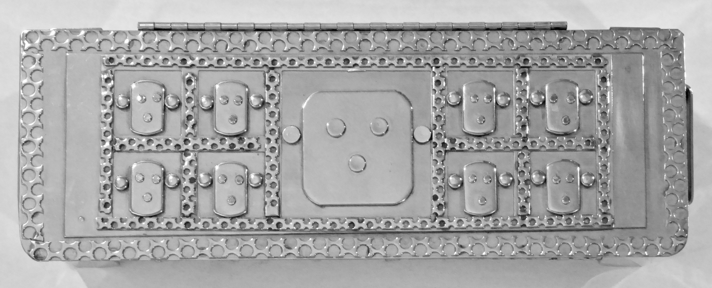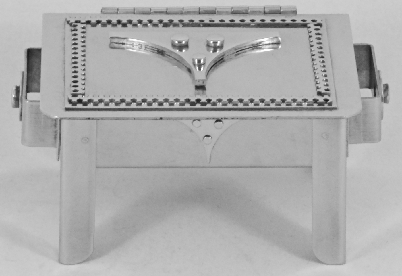 Stanley Szwarc’s most typical creations are marvels of decoration, stainless steel boxes lathered in abstract ornamentation. But he also applied his geometric talent to creating faces, some ominous, some cartoony, some robotic, and some quite dressy. When the book keeper turned metal worker took up representational imagery, his imagination was stunning.